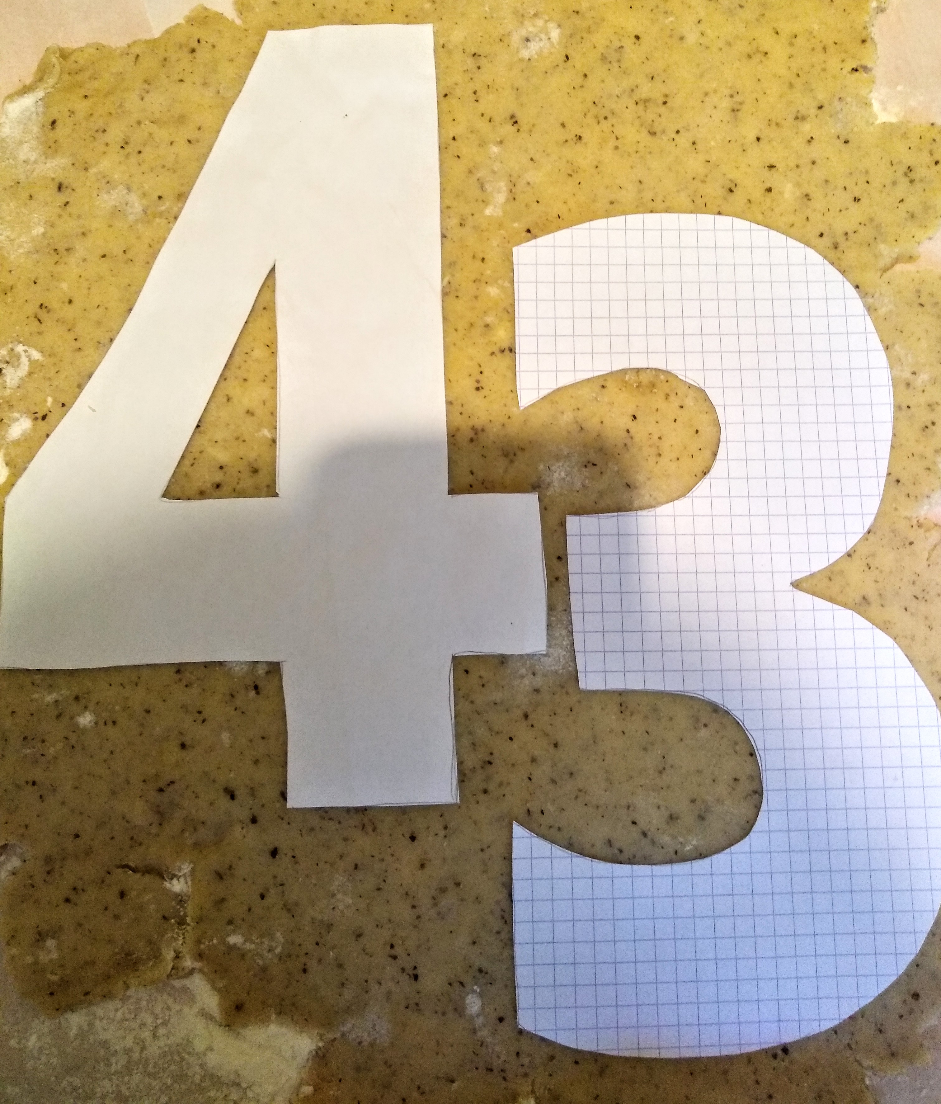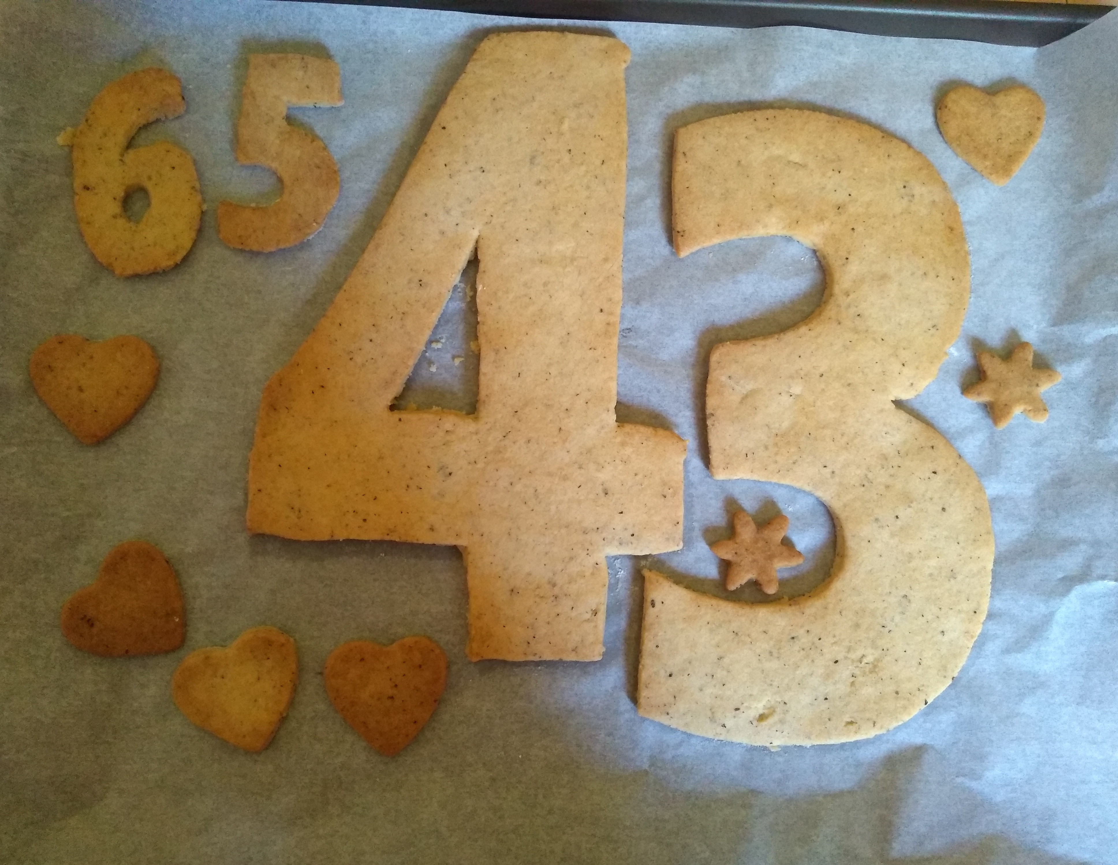 • Découpez d’autres petites formes avec le reste de pâte . Avec la quantité donnée ici , je coupe 2 séries de chiffres de hauteur 16 cm ainsi que de nombreuses petites fantaisies ( coeurs , étoiles…amusez-vous!!).