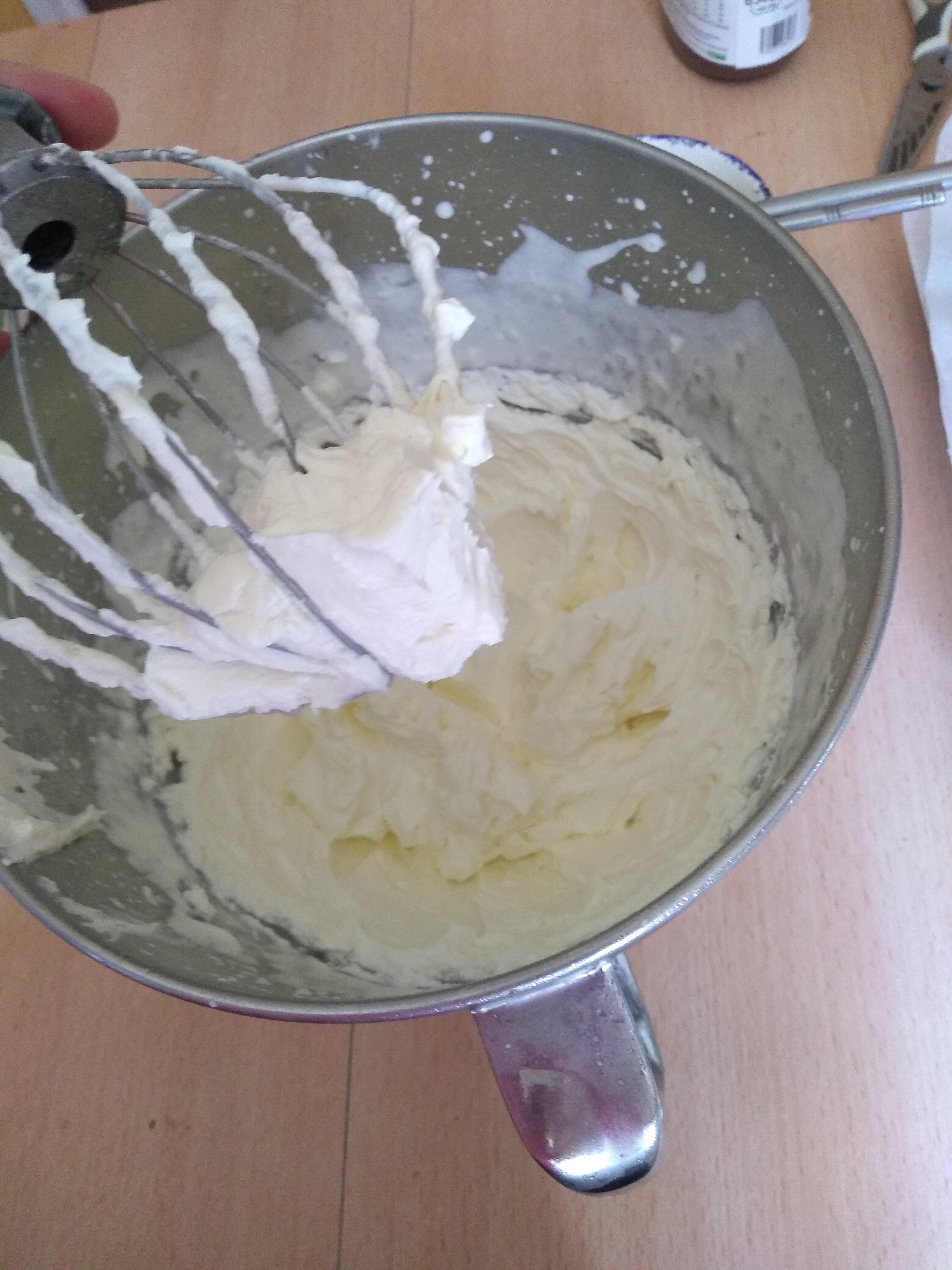 • Sortez le bol du congélateur et versez la crème entière . Commencez par fouetter une minute à vitesse moyenne puis passez à la vitesse maximale .Ajoutez votre sucre glace et votre mascarpone … attention avec le mascarpone , détendez-le un peu à la fourchette sinon lorsque vous le mettrez dans le robot , cela peut vous éclabousser et ruiner votre cuisine ( je sais de quoi je parle hihihi). Arrêtez le robot lorsque vous obtenez une consistance ferme qui tient dans le fouet