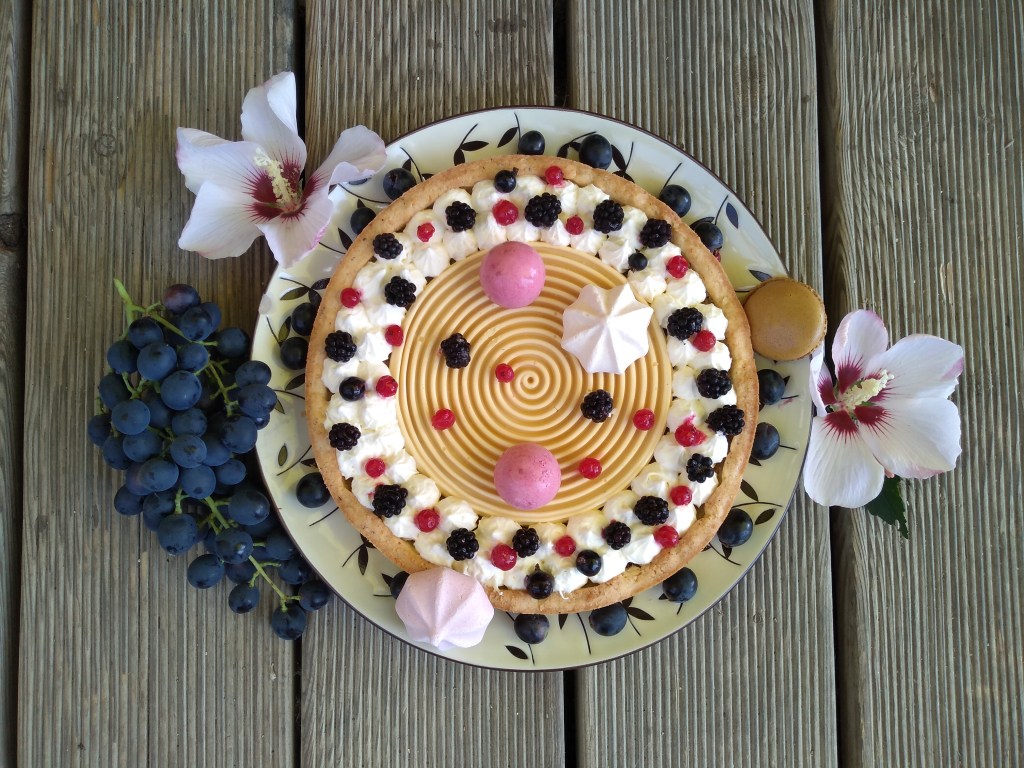 Bonjour , je vous propose une recette de tarte aux fruits avec deux visuels que j’avais en tête cette semaine . La tarte se réalise sur deux jours et vous aurez besoin : d’un moule tourbillon siliconé de chez Silikomart ( à mon avis il existe d’autres types de moule pouvant parfaitement convenir) pour le crémeux vanille , d’un cercle à pâtisserie de 20 cm, d’un batteur ou de votre robot ,un thermomètre de cuisson et une poche à douille ( cannelée ou lisse selon vos préférences ), une plaque de cuisson et du papier sulfurisé.