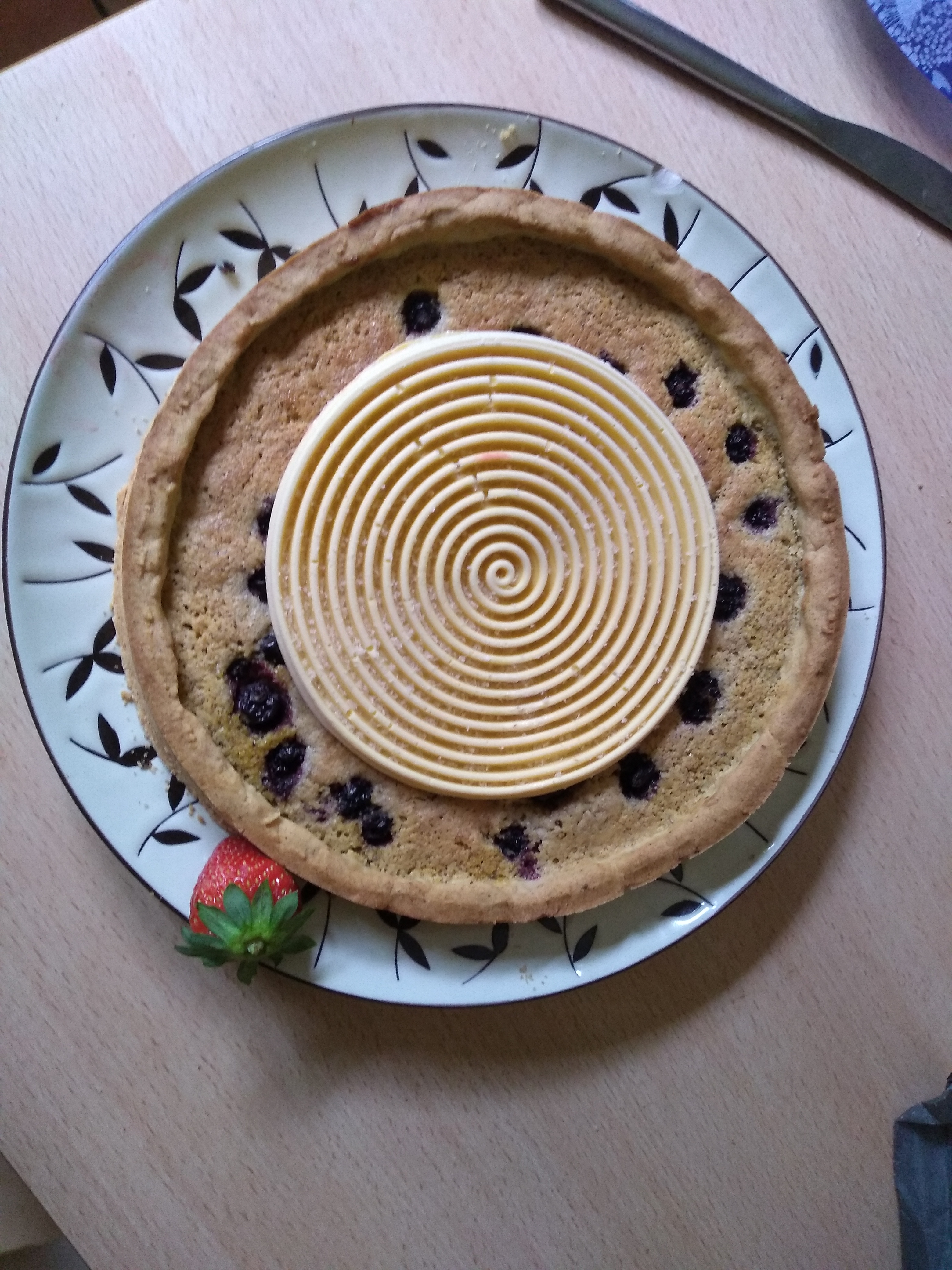 Sortez le moule tourbillon du congélateur où il reposait depuis la veille et mettez le crémeux vanille au centre de votre tarte.