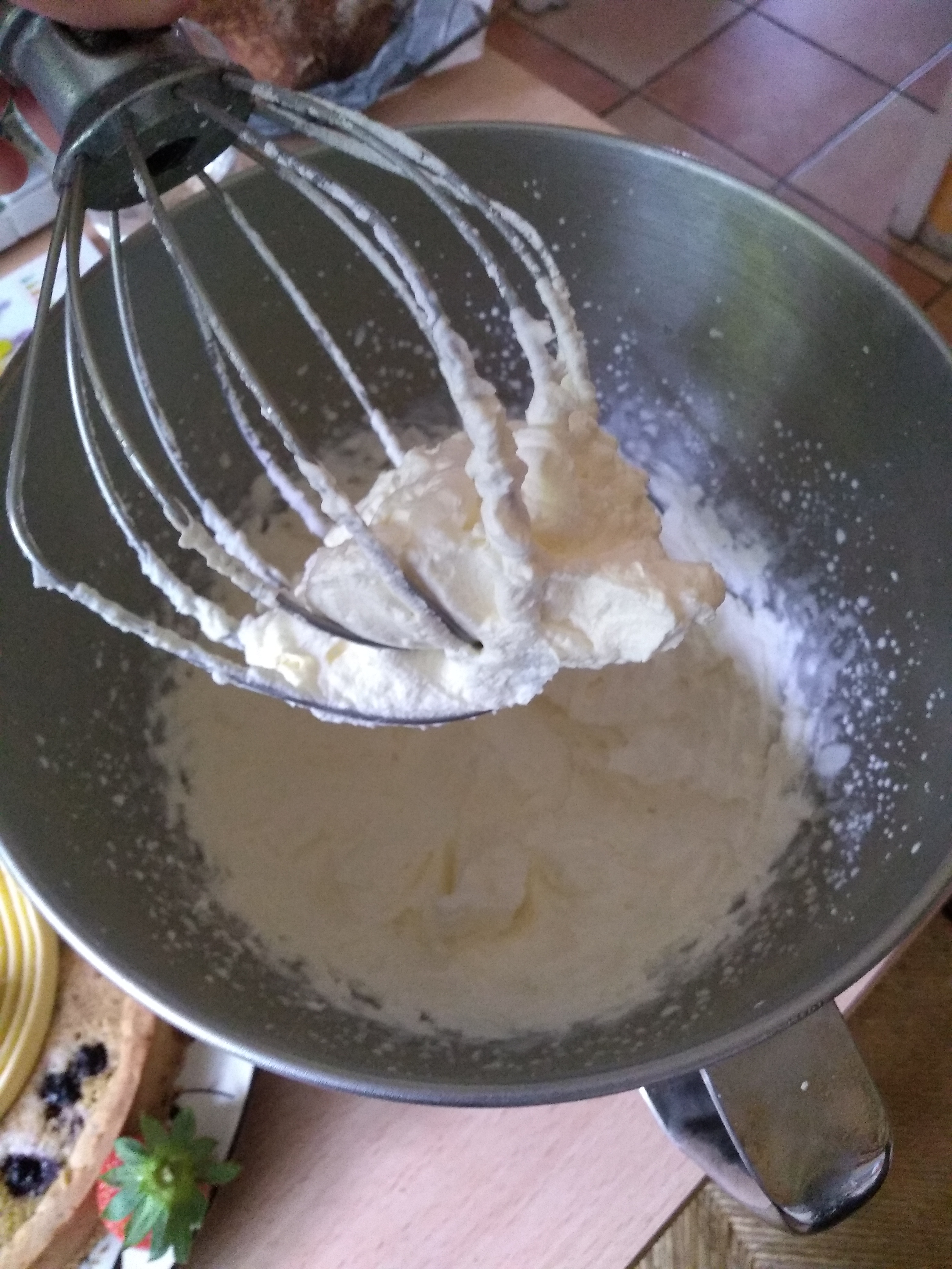 Récupérez le bol du congélateur , versez la crème entière et au batteur ou au robot , fouettez à pleine puissance jusqu’à l’obtention d’une sorte de bec d’ oiseau. Ajoutez le sucre glace pendant le fouettement de la crème.