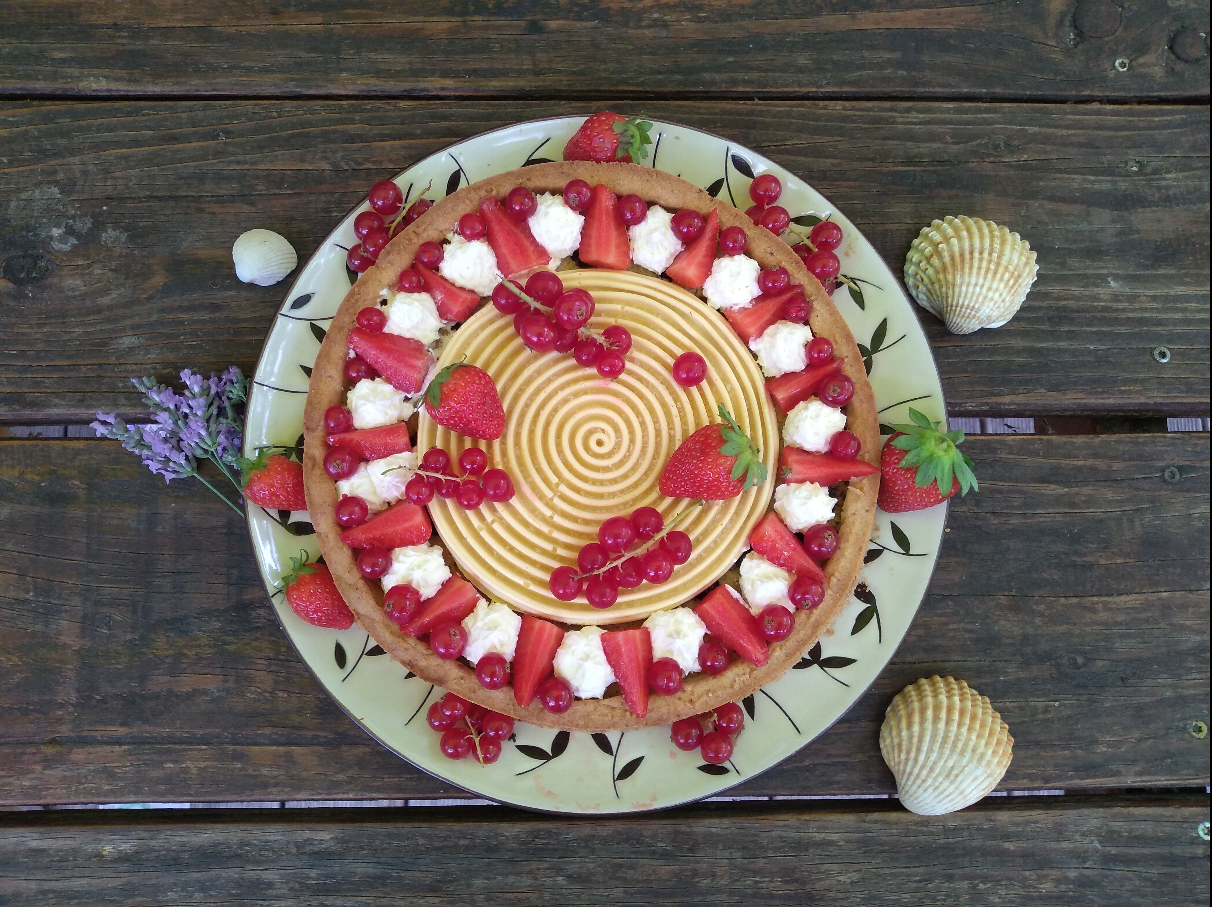 La tarte se compose d’un crémeux vanille à préparer la veille , d’une pâte sucrée aux amandes à réaliser le jour même, d’une crème amandine aux amandes garnie de fruits rouges et d’une décoration de chantilly et fruits rouges.
