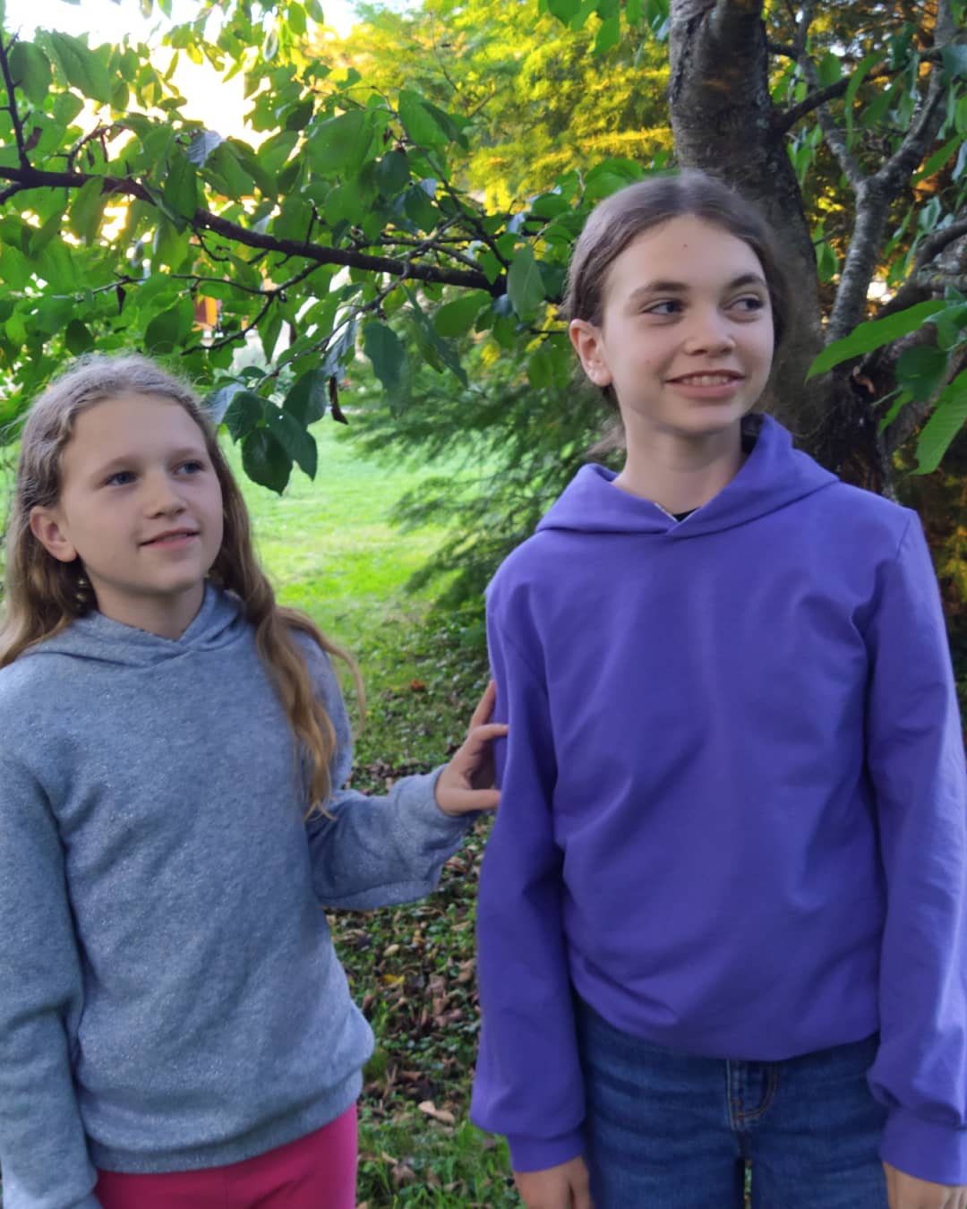 Je n’ai effectué aucune retouche , le patron étant très bien conçu. Le livret est hyper complet aussi avec plein de bons conseils !!!Je trouve que les sweats leur vont bien . La petite veut évidemment que je lui fasse la même version violette que sa soeur mais quel bonheur de pouvoir leur refaire des vêtements et de savoir qu’ils leur plaisent !!