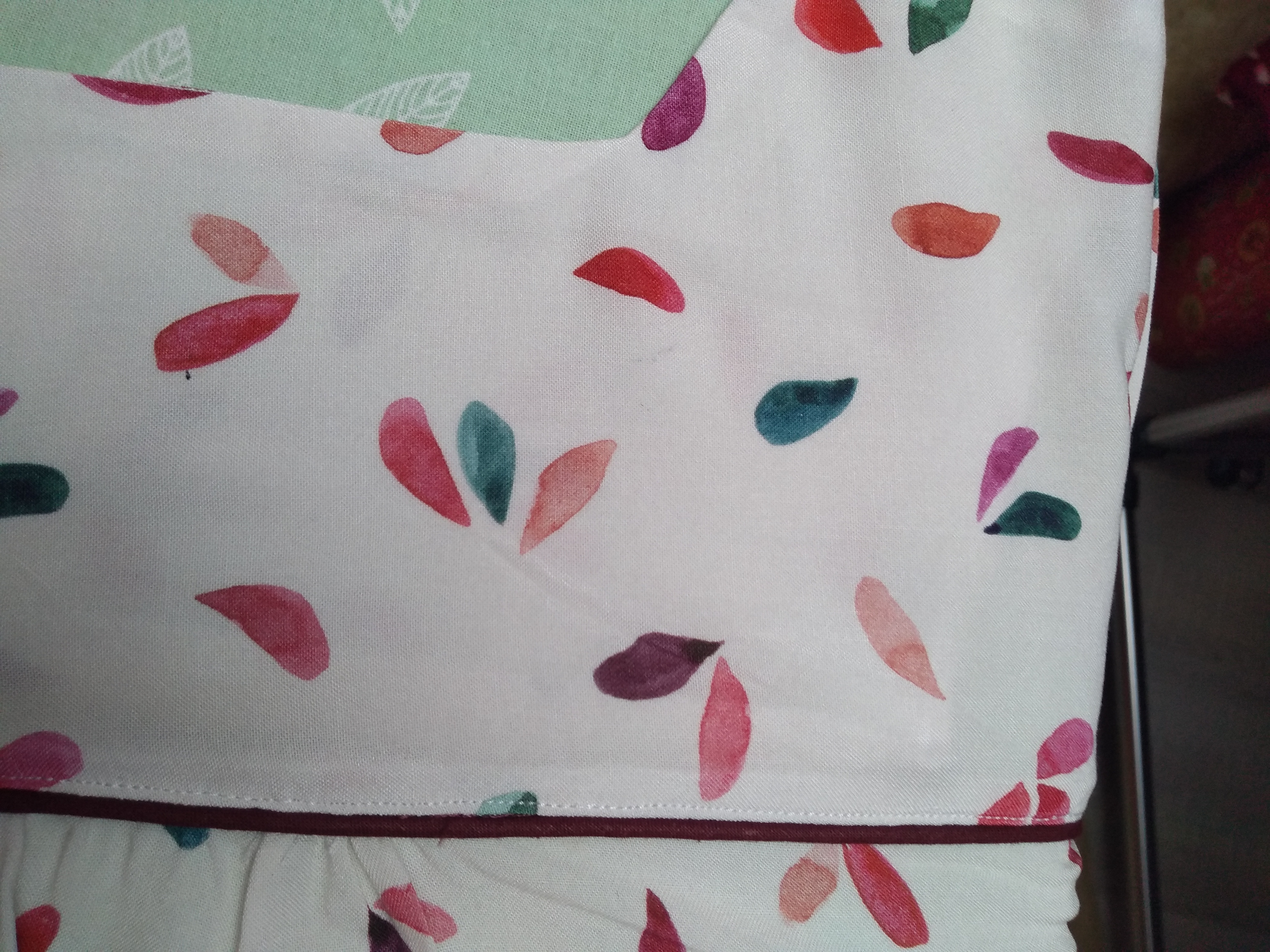 J’ai choisi pour la réaliser une merveilleuse viscose de Lise Tailor précieusement gardée dans ma réserve magique pour le jour J. Sa qualité est vraiment excellente , comme tous ses tissus d’ailleurs . J’ai ajouté un passepoil assorti à la jupe sur l’empiècement dos.