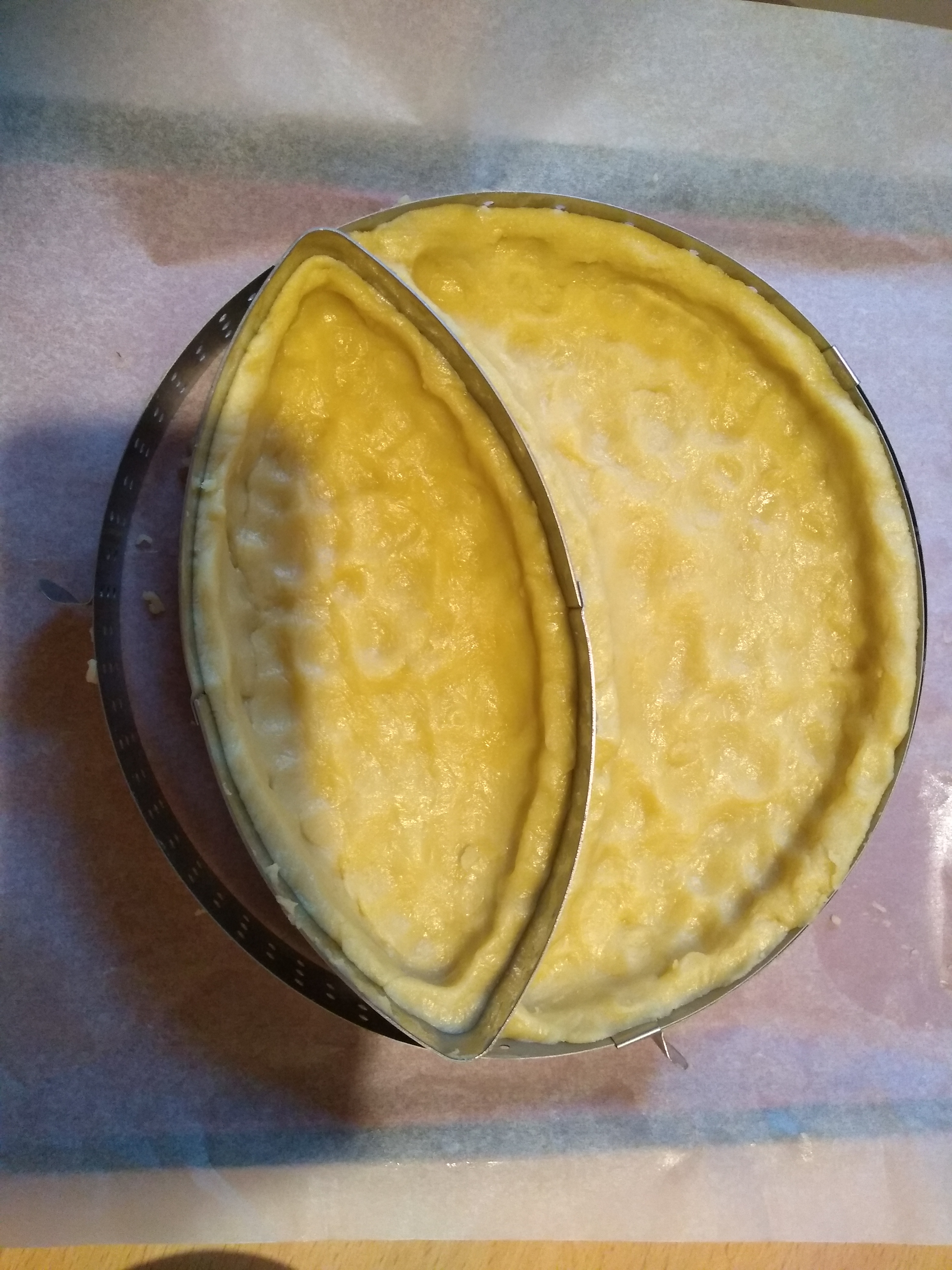 Samedi dernier je savais que je ne pourrai pâtisser que par étapes éloignées car ma fille chantait plusieurs fois à Troyes alors le matin j’ai préparé une pâte sucrée qui permettrait une tarte pour 8 à 10 personnes ( un cercle de 20 cm de diamètre) et je l’ai séparée en deux formes pour deux desserts distincts