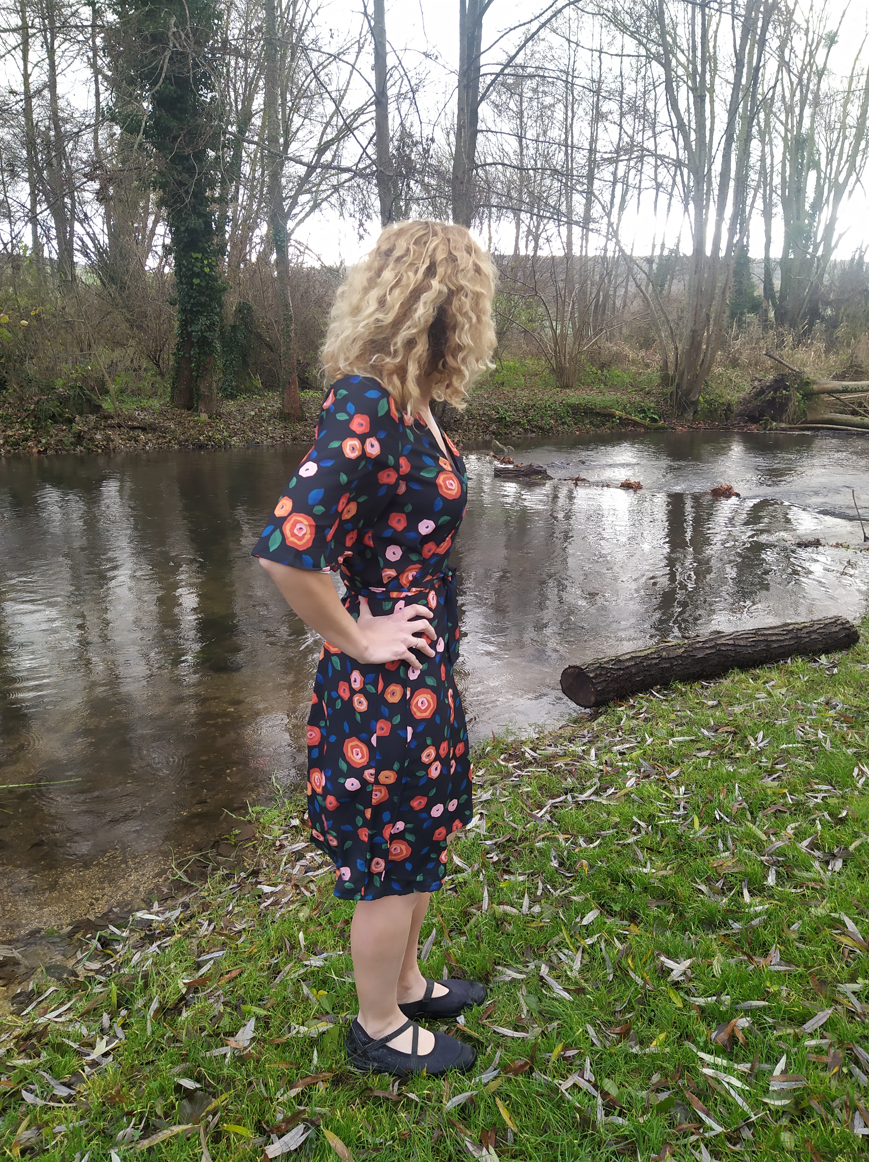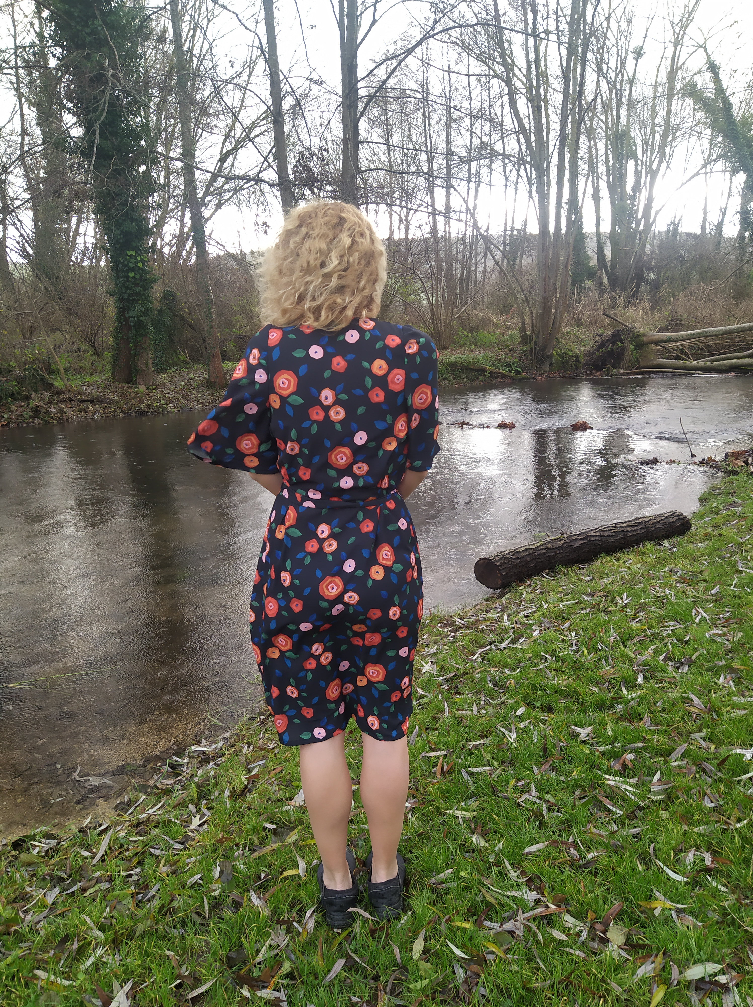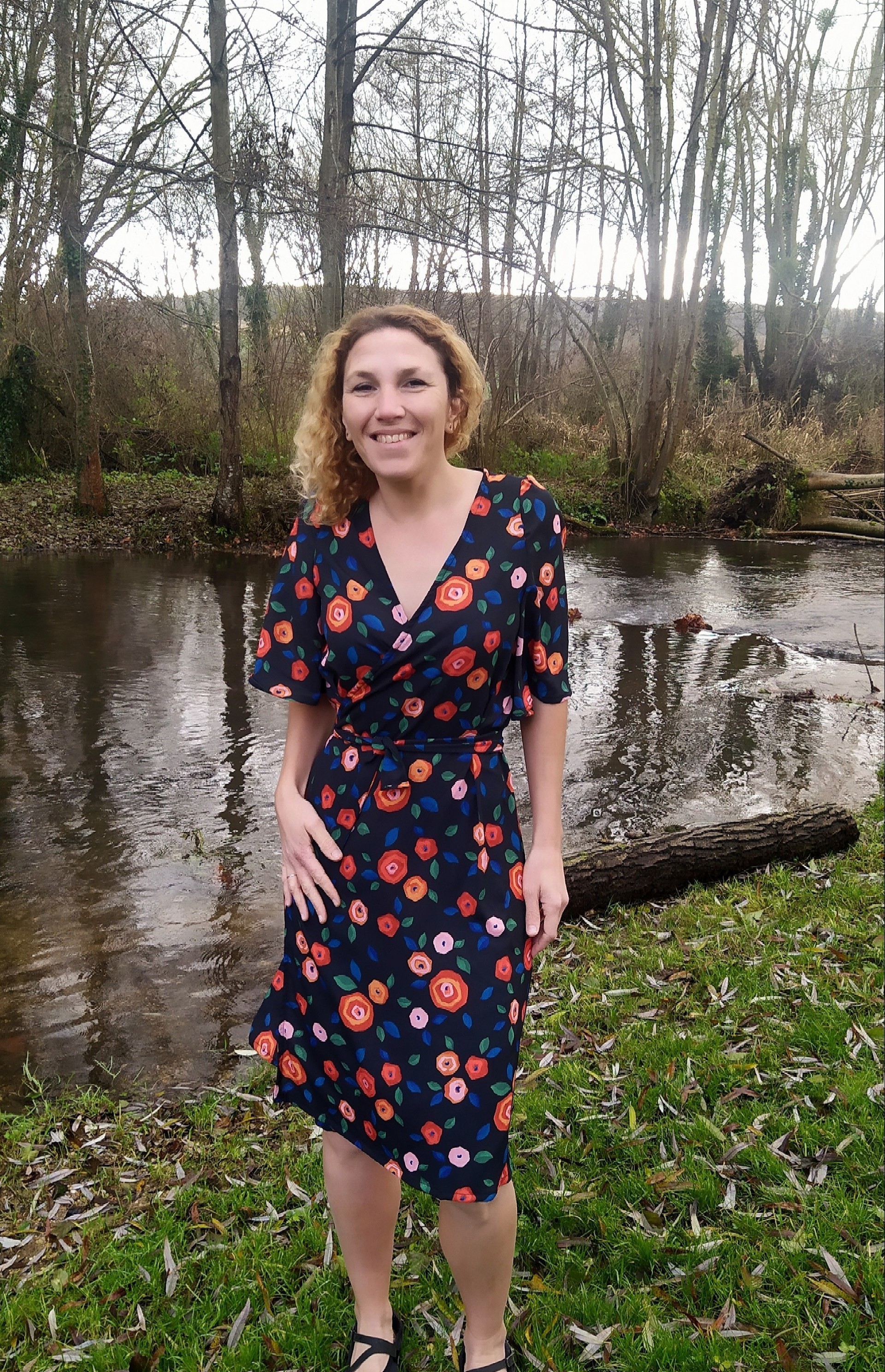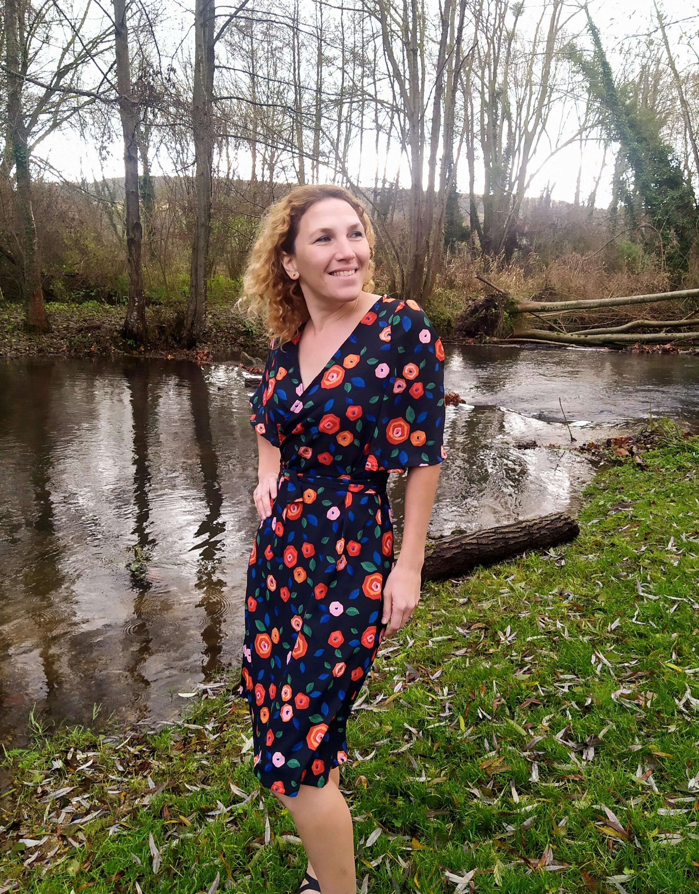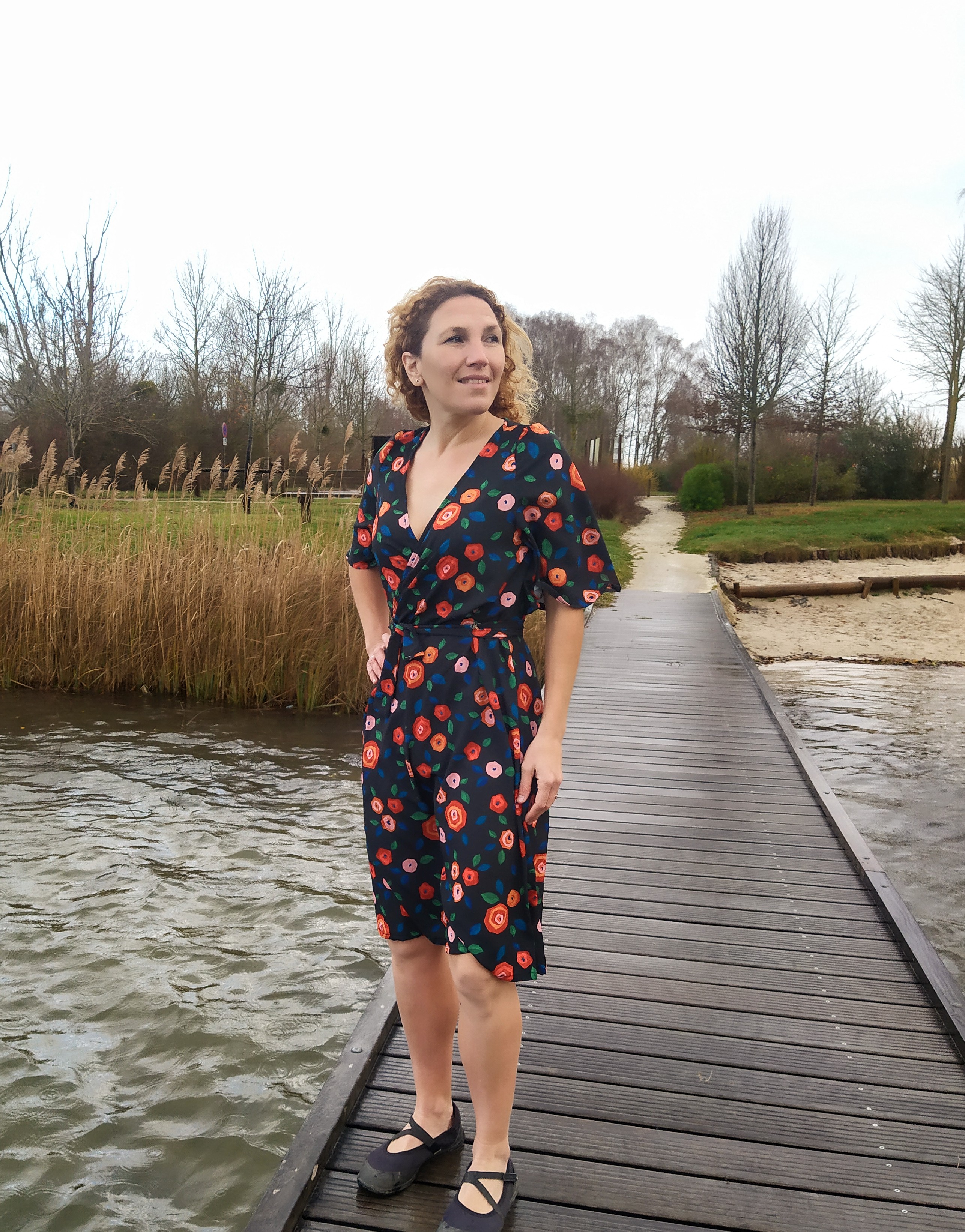 Lorsque le patron est sorti il y a quelques semaines j’ai eu un gros coup de coeur : j’adore les robes portefeuilles et celle-ci s’est imposée comme une évidence , d’autant que j’ai tout de suite su que je la couperai dans mon précieux tissu Atelier 27.