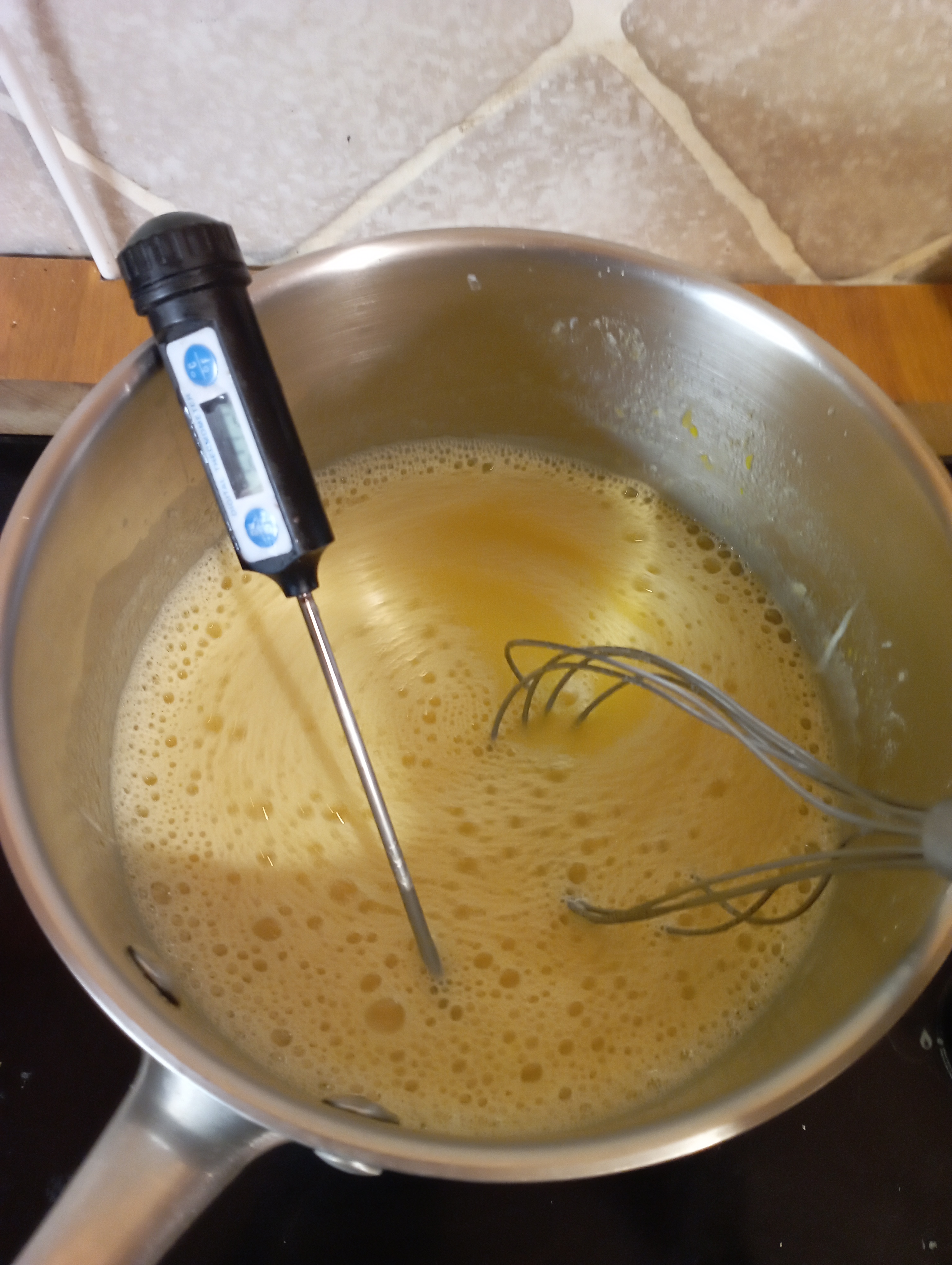 Hydratez dans l’eau très froide la gélatine . Dans une casserole faites chauffer le jus des citrons avec le sucre et les oeufs jusqu’à environ 72 degrés (en fait vous vous rendrez compte que la crème épaissit un peu . Essorez la gélatine et jetez-la hors du feu dans la casserole . Mélangez bien et réservez .