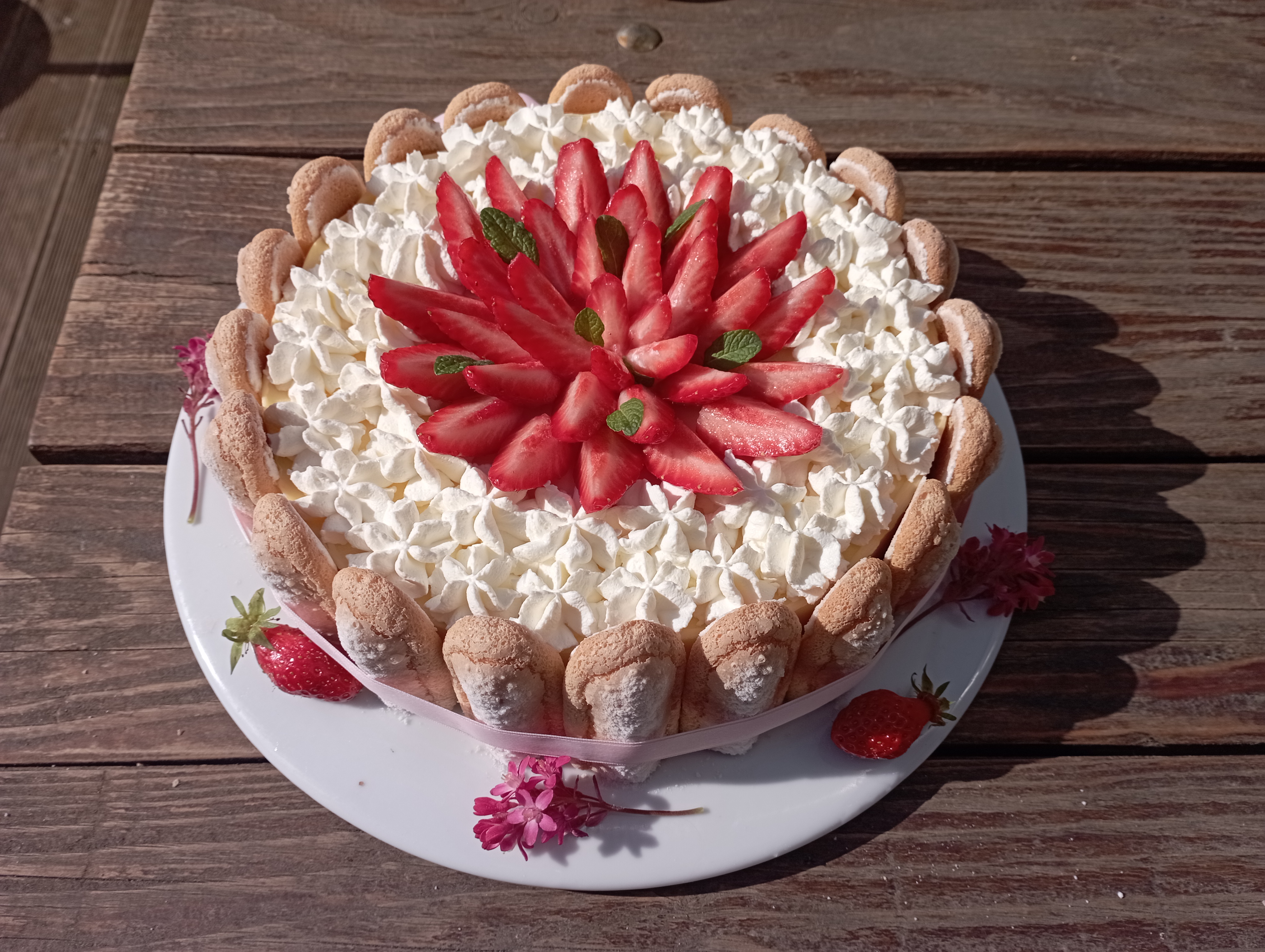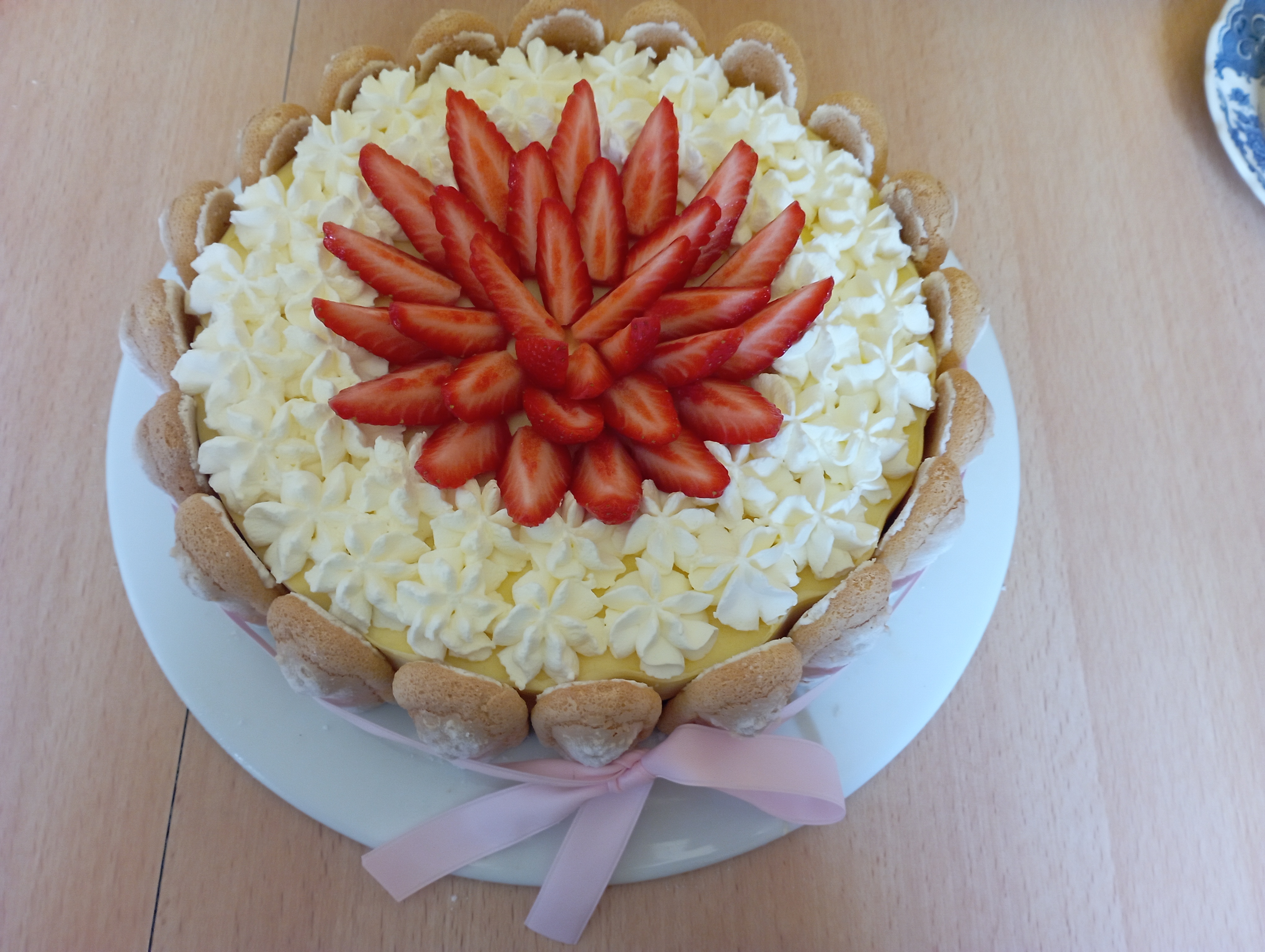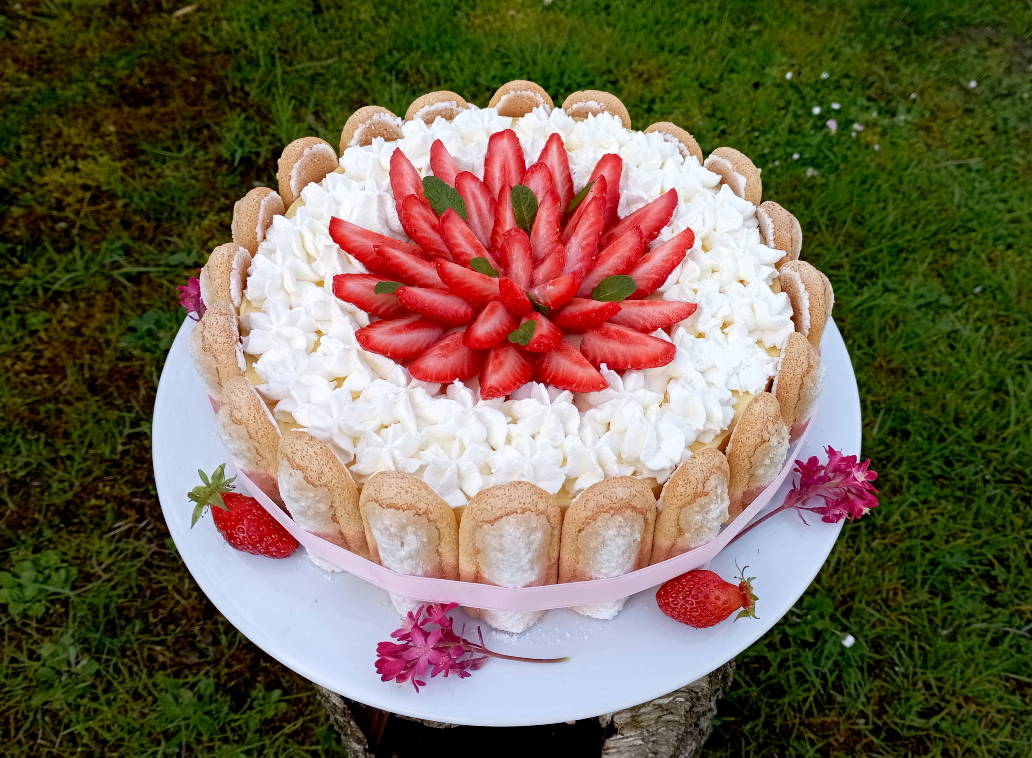 Bonjour à vous , je me fais une joie de vous proposer un dessert qui pourra être dégusté à Pâques ou pour n’importe quelle occasion festive 😀 : une sorte de charlotte au citron recouverte de chantilly mascarpone et de fraises de saison . Elle se compose d’un biscuit madeleine au citron , d’une mousse au citron tout à fait délicieuse ( mais vous savez que lorsqu’il s’agit de citron , je manque totalement d’objectivité…) , d’une chantilly mascarpone et pour le tour de biscuits à la cuillère ( du commerce car j’ai hésité jusqu’au bout sur la décoration 😀 mais je vous concocterai une autre recette de mini charlottes d’ici peu avec biscuits maison ).