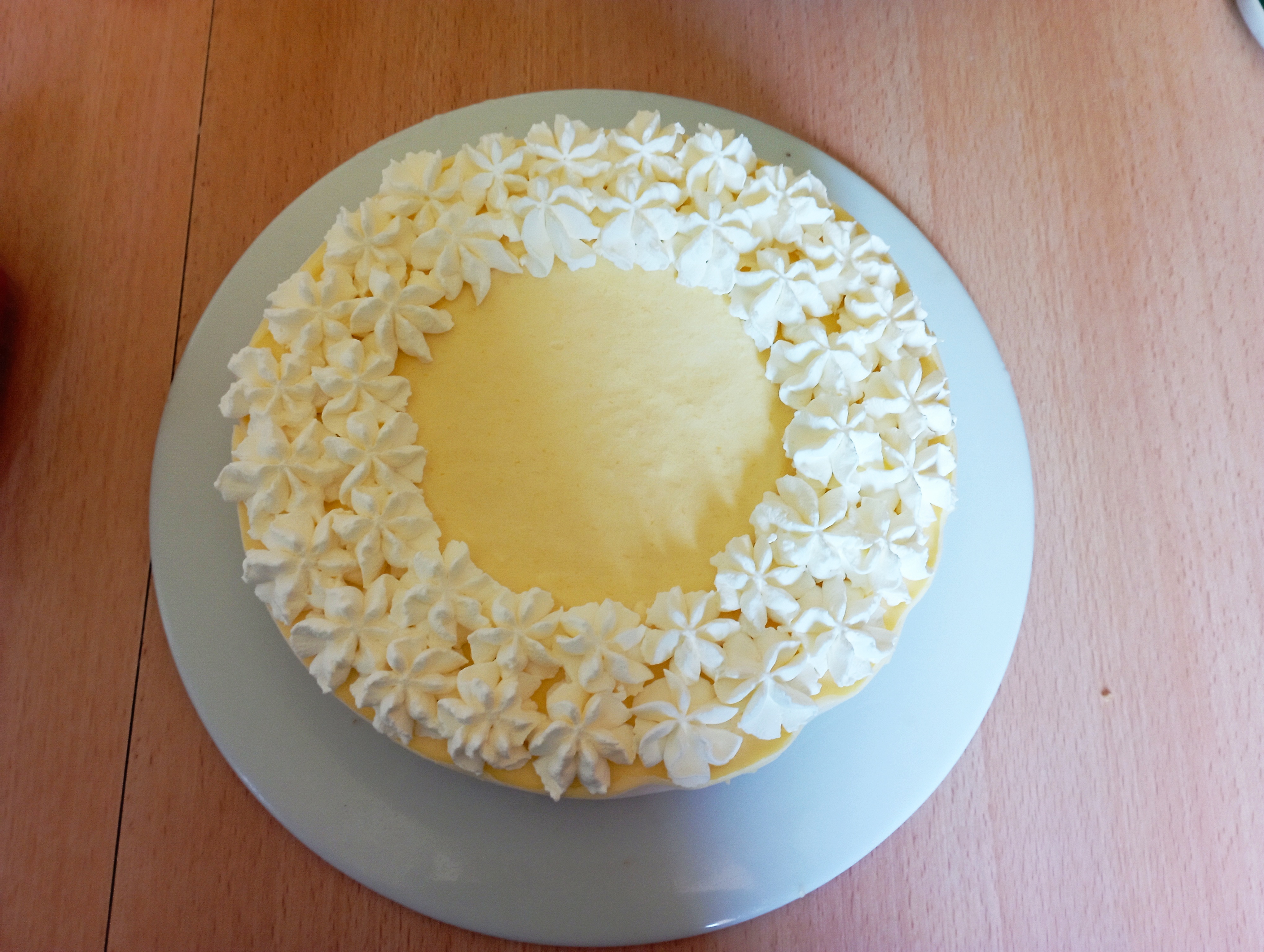Quelques heures plus tard ou le lendemain , sortez votre bol super froid et montez votre crème en chantilly exactement comme lors de l’étape 2 sauf que vous rajoutez du mascarpone pendant que vous montez la chantilly . Attention , le risque d’éclaboussures est élevé hihi. Lorsque votre chantilly est bien ferme , remplissez une poche munie de la douille de votre choix ( cannelée , unie de 1 cm ou celle qui vous plaira le plus ). Sortez le dessert du frigo et pochez le dessus.