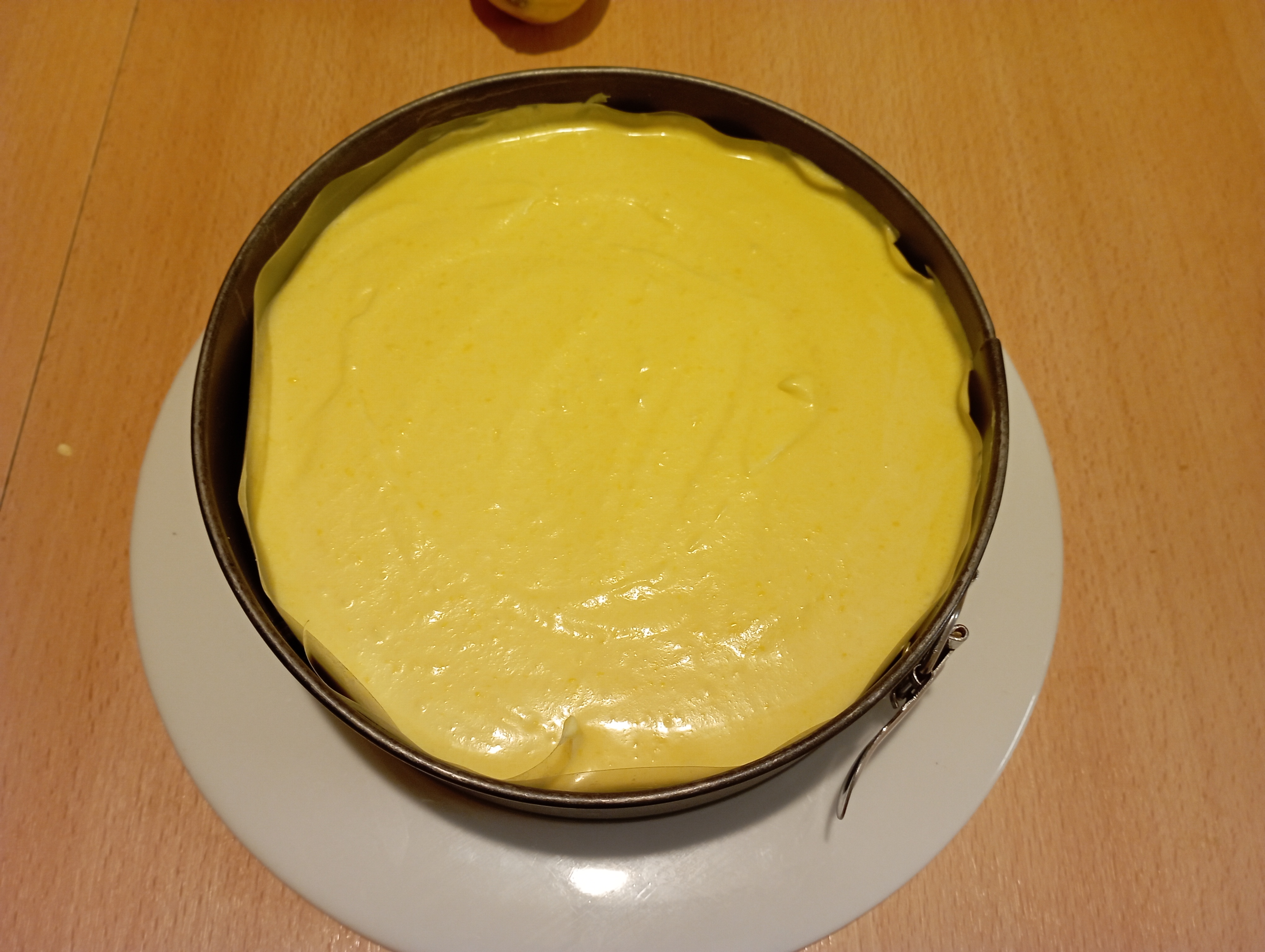 C’est la seule photo du biscuit madeleine cuit que j’ai car j’ai oublié de le photographier dans le feu de l’action. Shame on me D’ailleurs si vous mettez du Rhodoïd , c’est le moment !! Placez votre cercle sur le futur plat de service . Versez la mousse sur le biscuit et mettez au réfrigérateur pour plusieurs heures : 6 heures au moins ( ici , c’est la nuit entière pour assurer une bonne prise de la mousse )