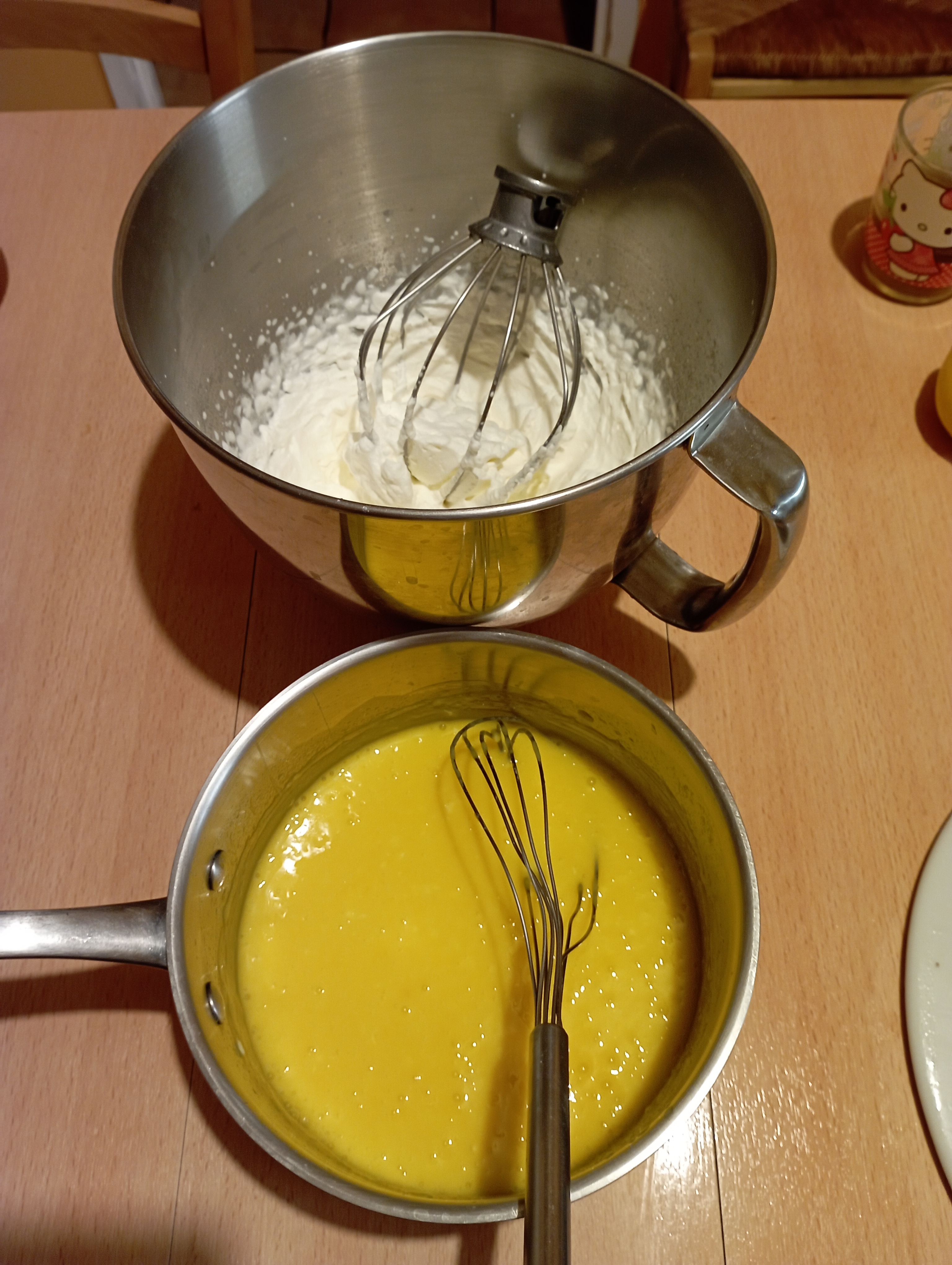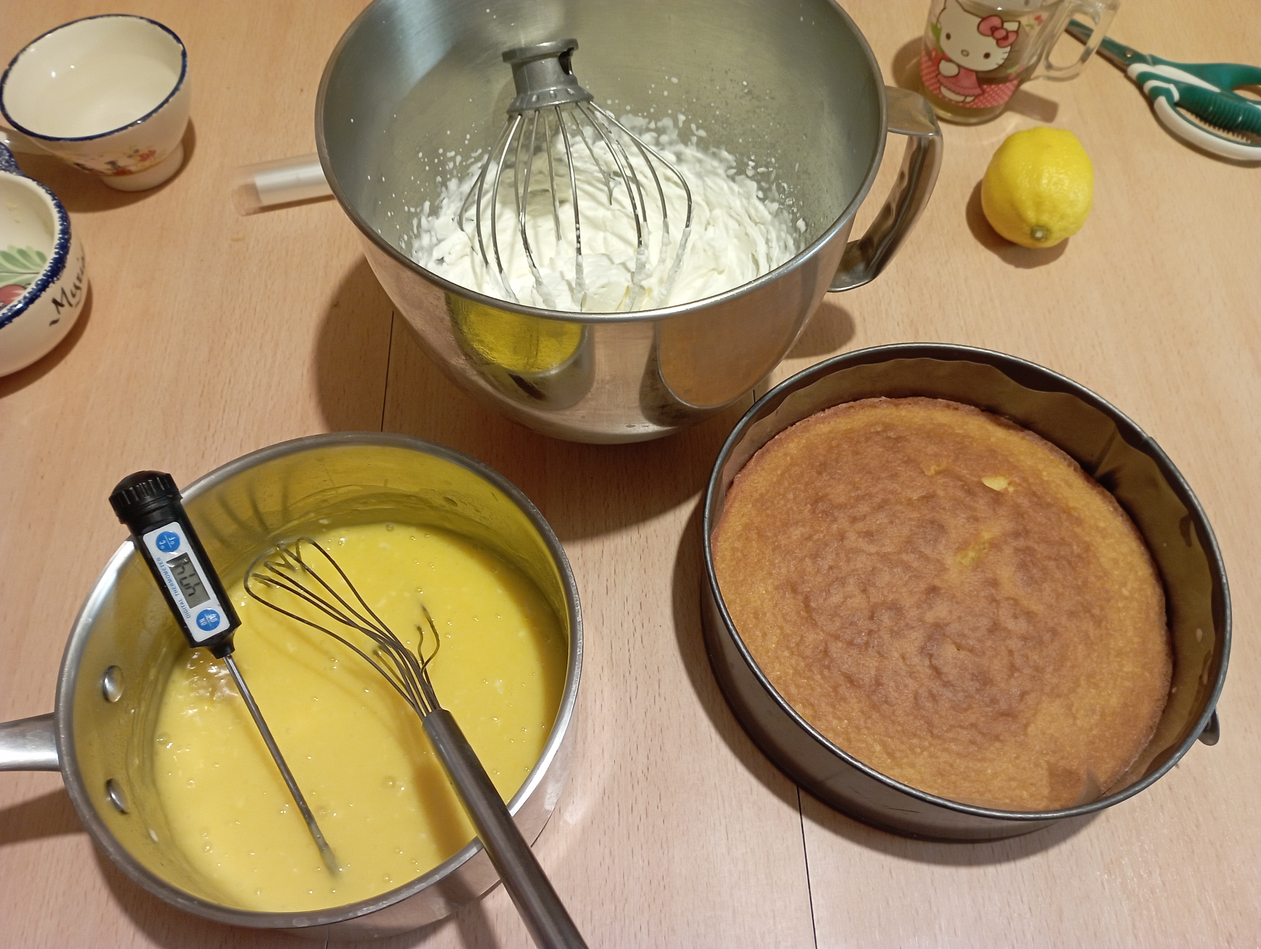 Matériel nécessaire : un cercle à pâtisserie de 20 cm de diamètre ou un cadre en inox, du rhodoïd pour un bord bien net mais comme ce sera caché derrière le tour de biscuits , n’allons pas chipoter si vous n’utilisez pas de rodo , le robot et son fouet ou un saladier et un bon batteur , une poche avec sa douille, du papier cuisson et une grande et une petite casserole , un thermomètre de cuisson peut vous rassurer pour le curd de citron.
