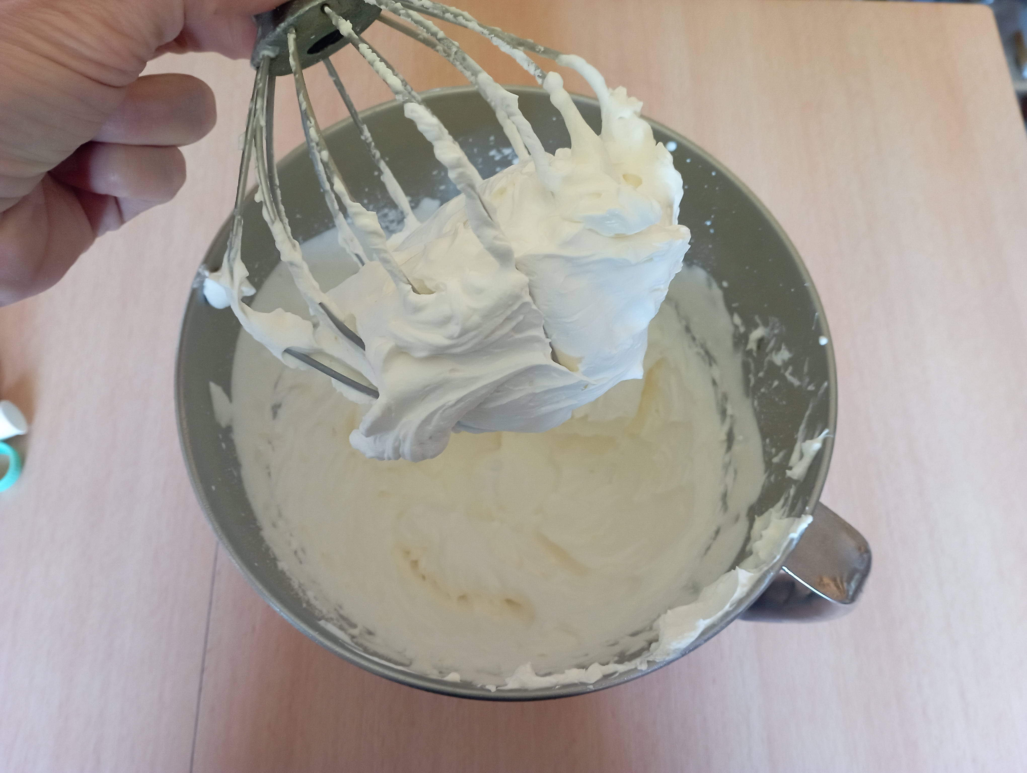 Quelques heures plus tard ou le lendemain , sortez votre bol super froid et montez votre crème en chantilly exactement comme lors de l’étape 2 sauf que vous rajoutez du mascarpone pendant que vous montez la chantilly . Attention , le risque d’éclaboussures est élevé hihi. Lorsque votre chantilly est bien ferme , remplissez une poche munie de la douille de votre choix ( cannelée , unie de 1 cm ou celle qui vous plaira le plus ). Sortez le dessert du frigo et pochez le dessus.