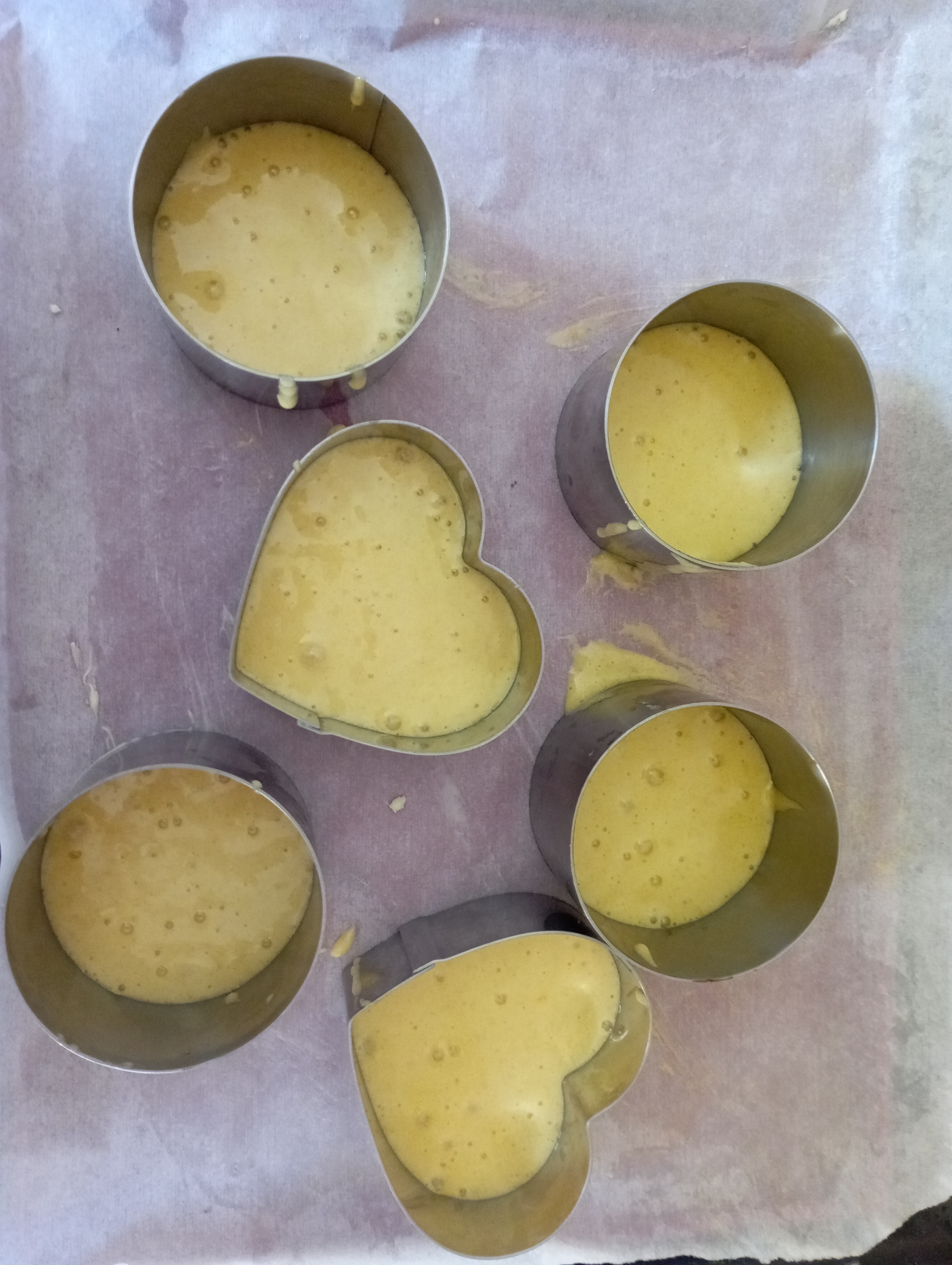 Versez la pâte dans les moules disposés sur une plaque de cuisson recouverte de papier sulfurisé beurré et enfournez à 180 chaleur tournante pour une dizaine de minutes ( la pointe du couteau doit ressortir sèche)