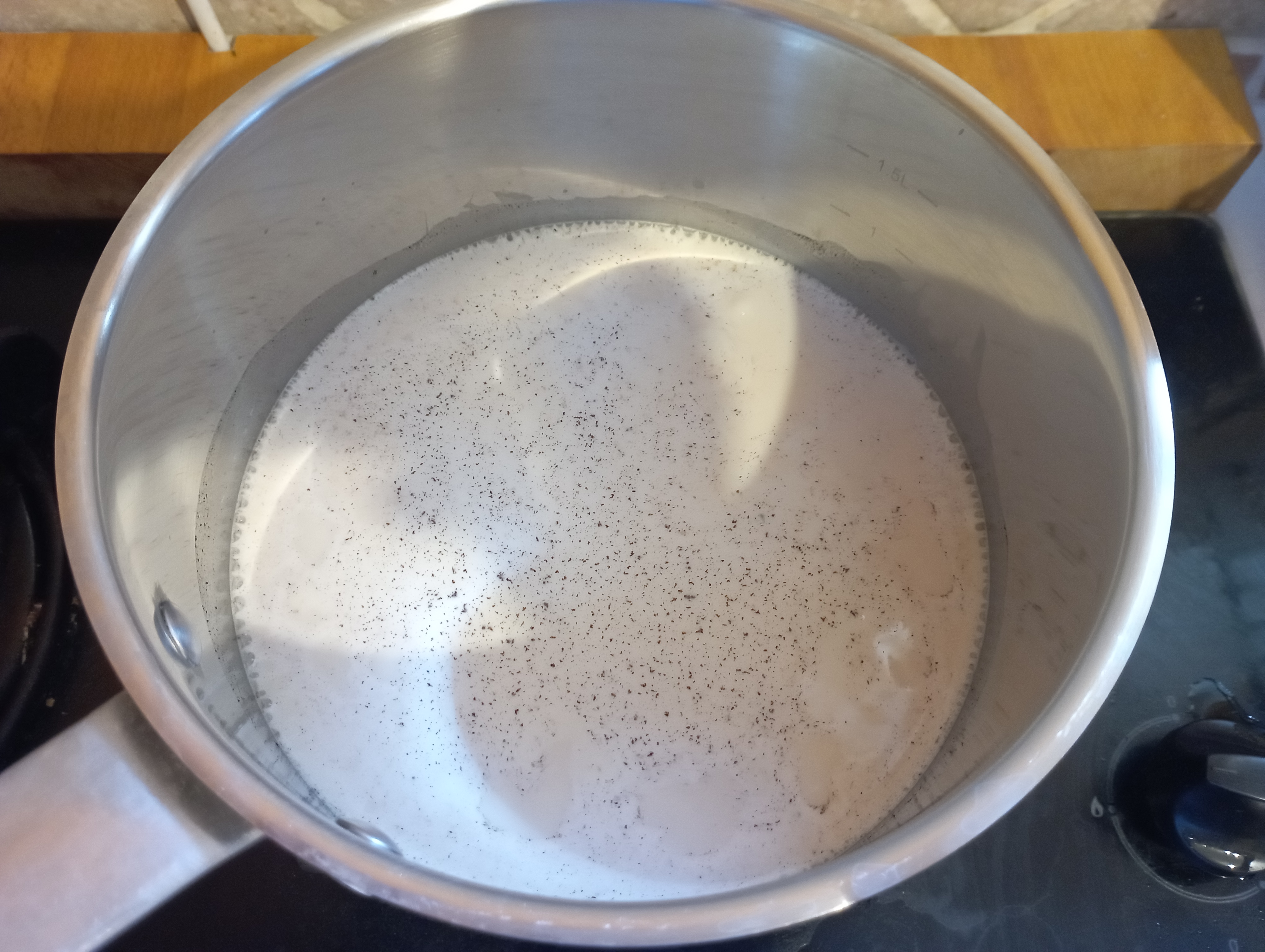 Versez le lait bouillant dans le saladier et remuez bien avant de remettre sur feu très doux et de remuer sans cesse jusqu’à ce que la crème épaississe.