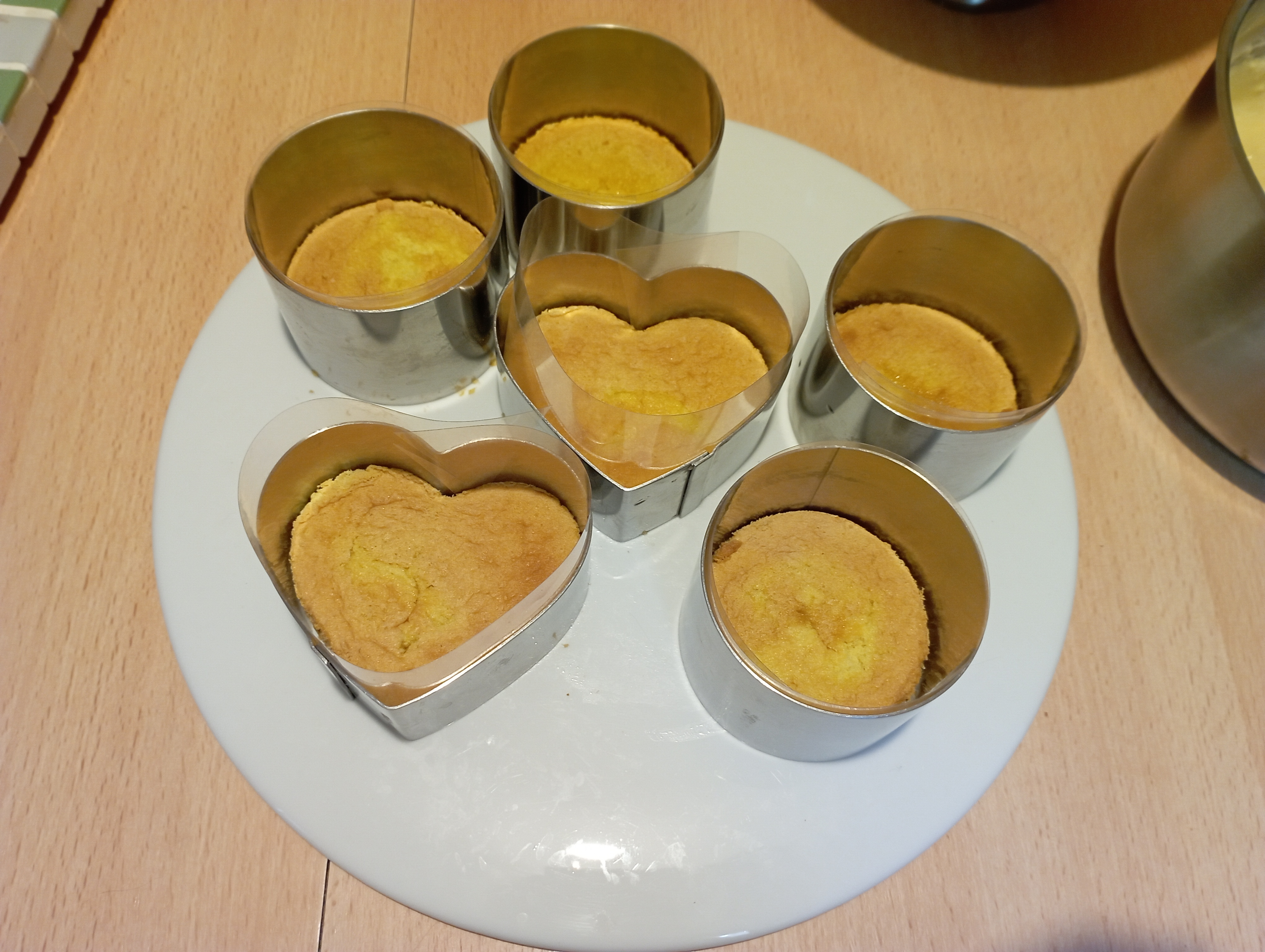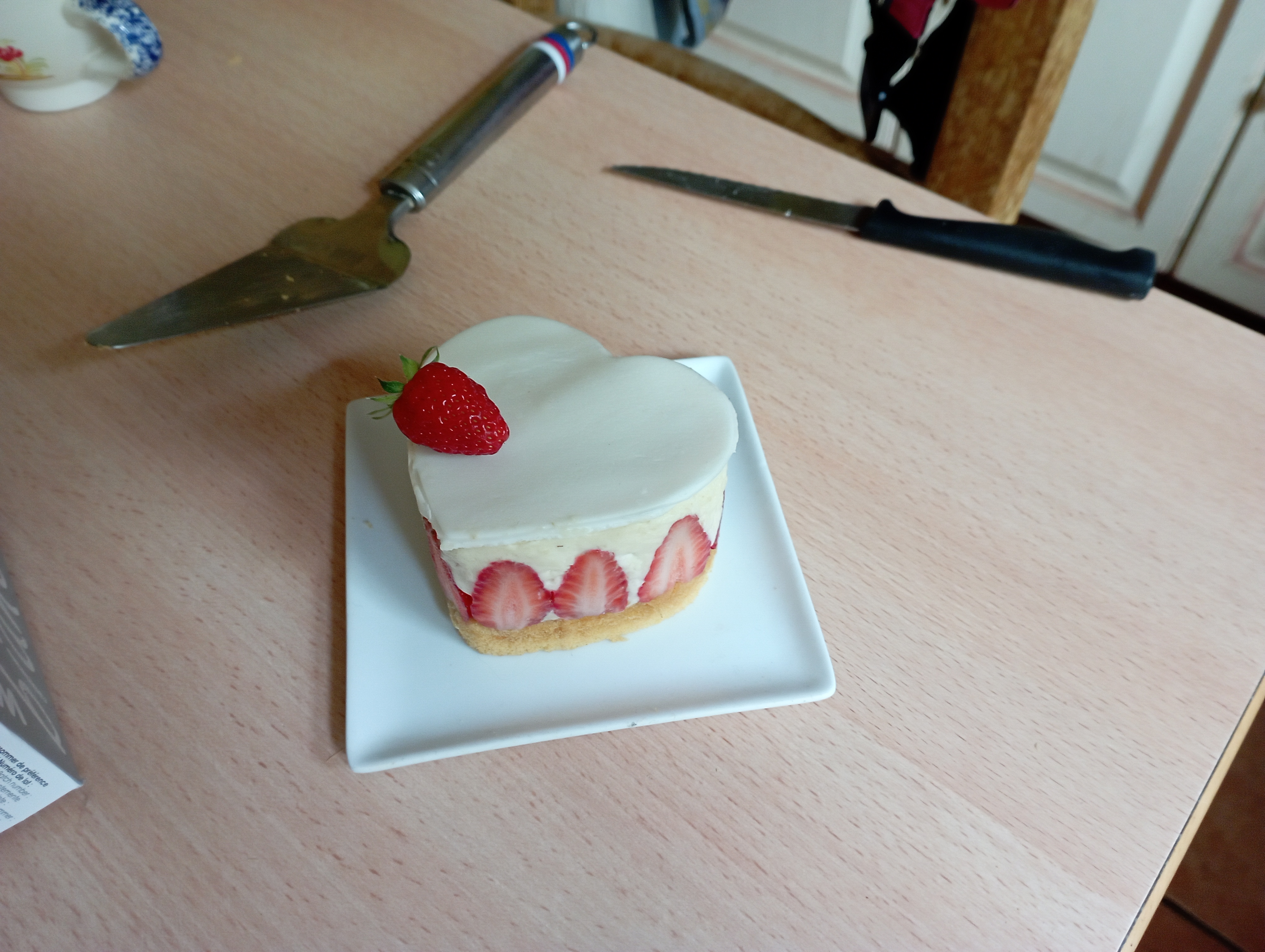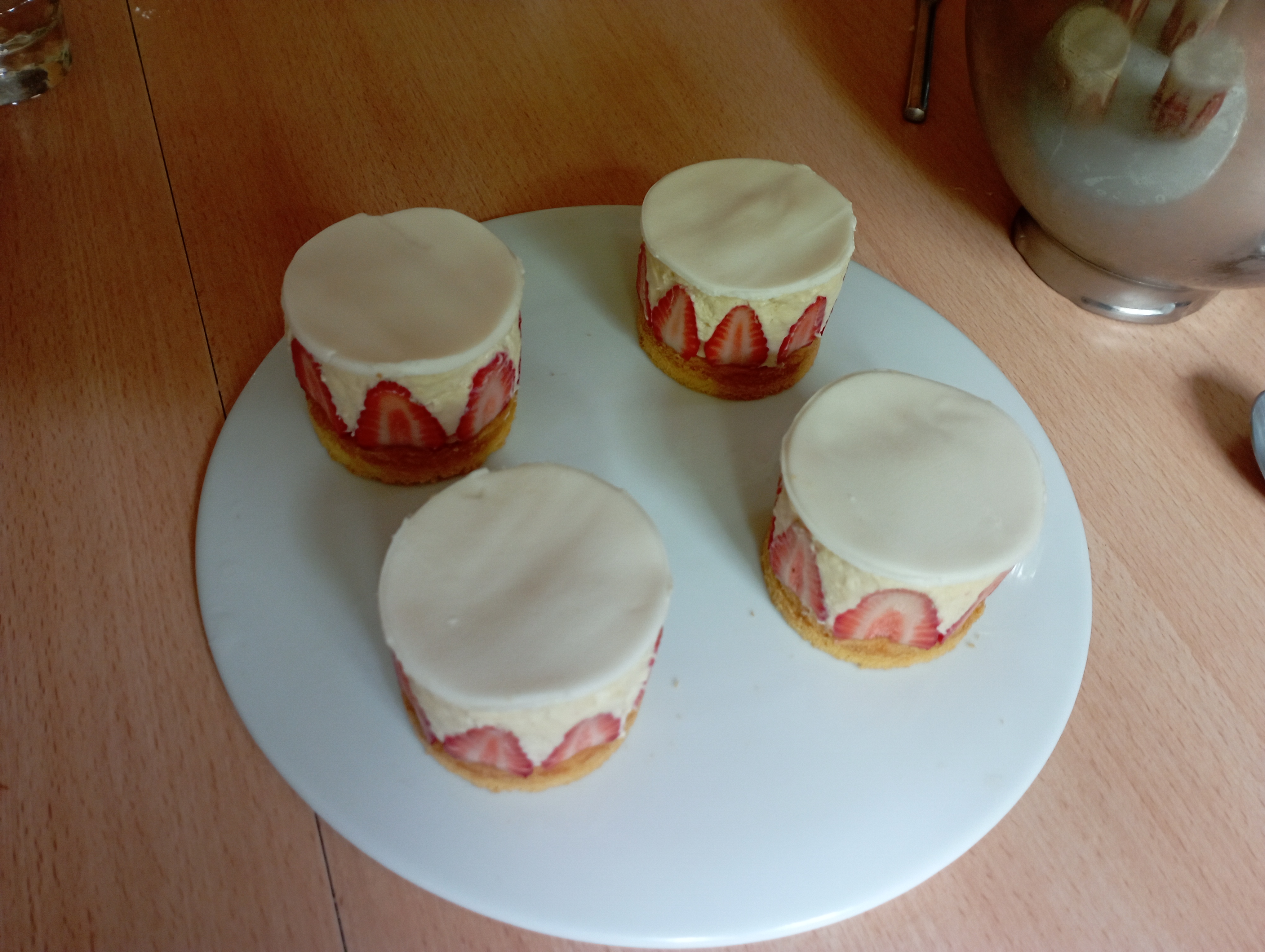 Cette fois-ci le fraisier se présente sous forme de 6 fraisiers individuels correspondant à un fraisier de diamètre 20 cm et hauteur 6 . J’attends quelques jours avant de rajouter ma version en cercle 20 cm car j’en suis trop fière 😀