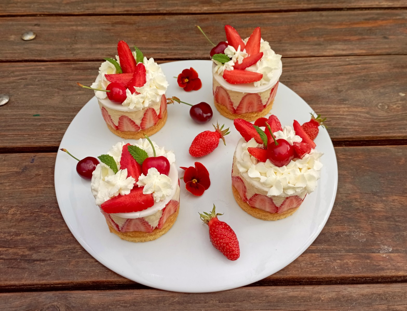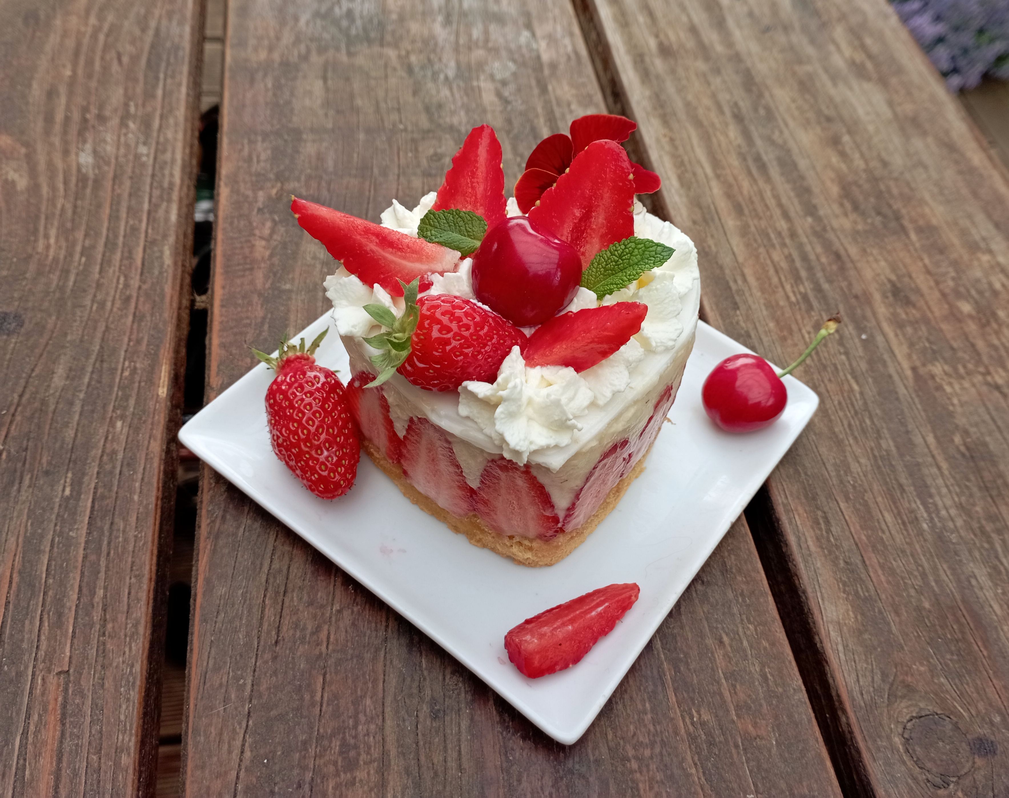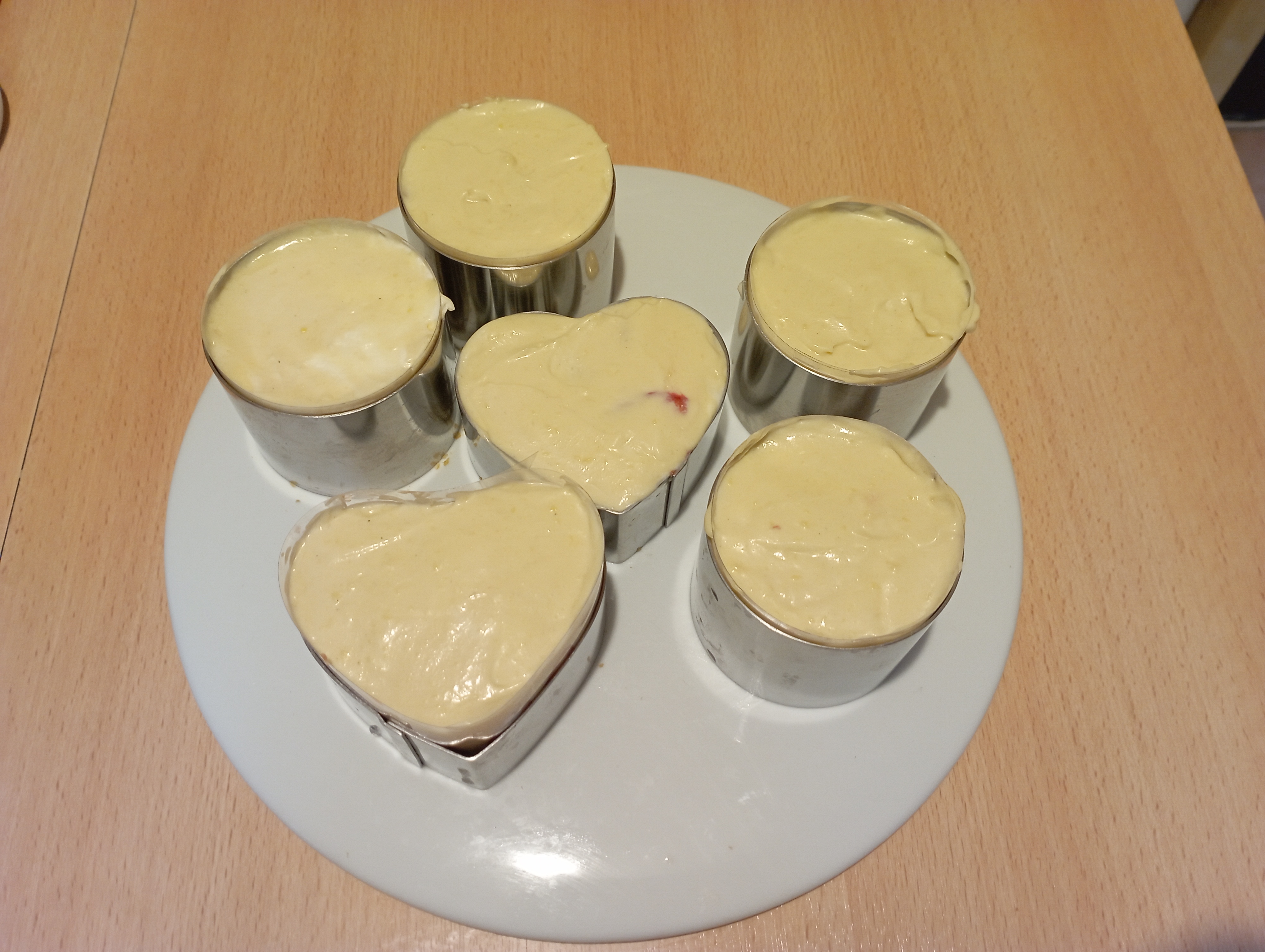 Cette fois-ci le fraisier se présente sous forme de 6 fraisiers individuels correspondant à un fraisier de diamètre 20 cm et hauteur 6 . J’attends quelques jours avant de rajouter ma version en cercle 20 cm car j’en suis trop fière 😀