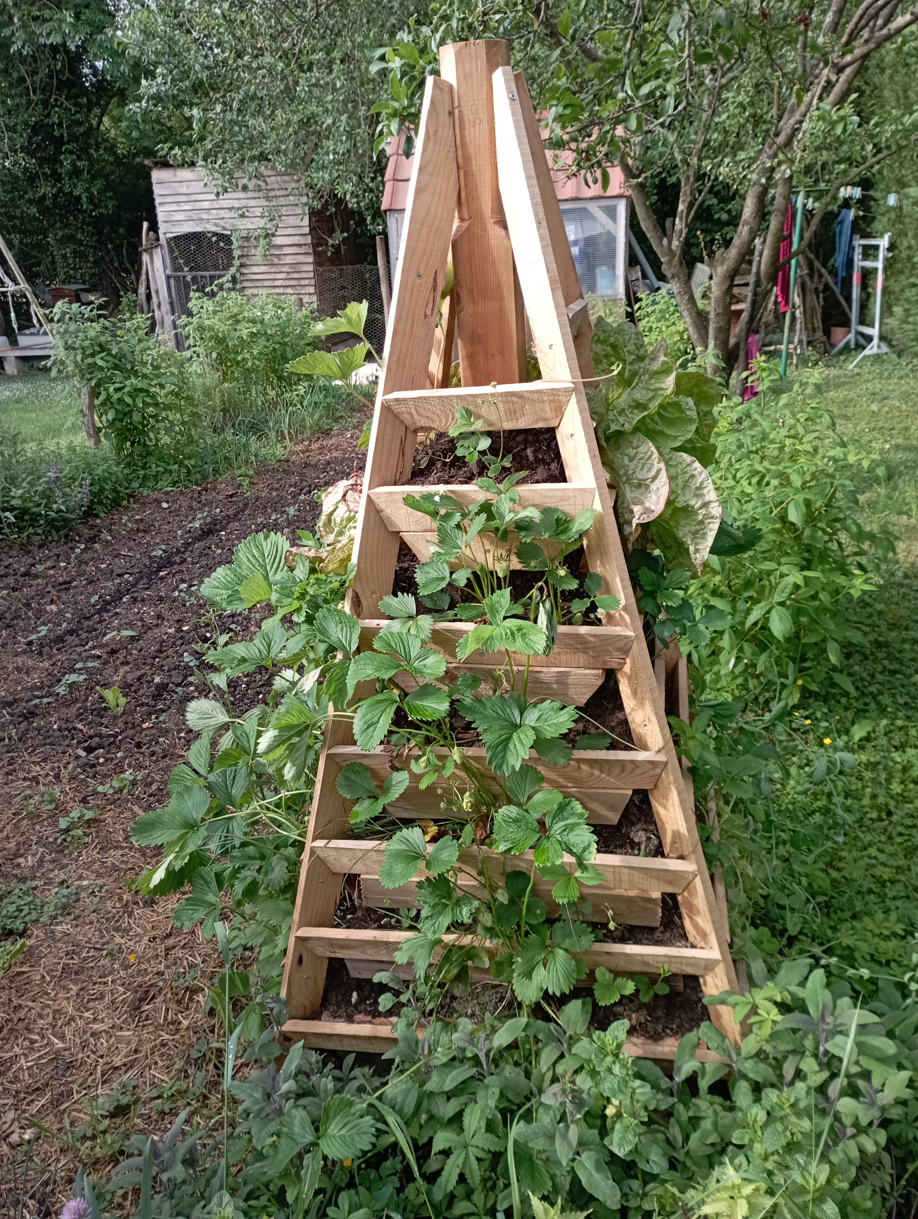 J’adore le présentoir réalisé par ton mari ! Et tes fraisiers sont super beaux et sûrement délicieux !!!