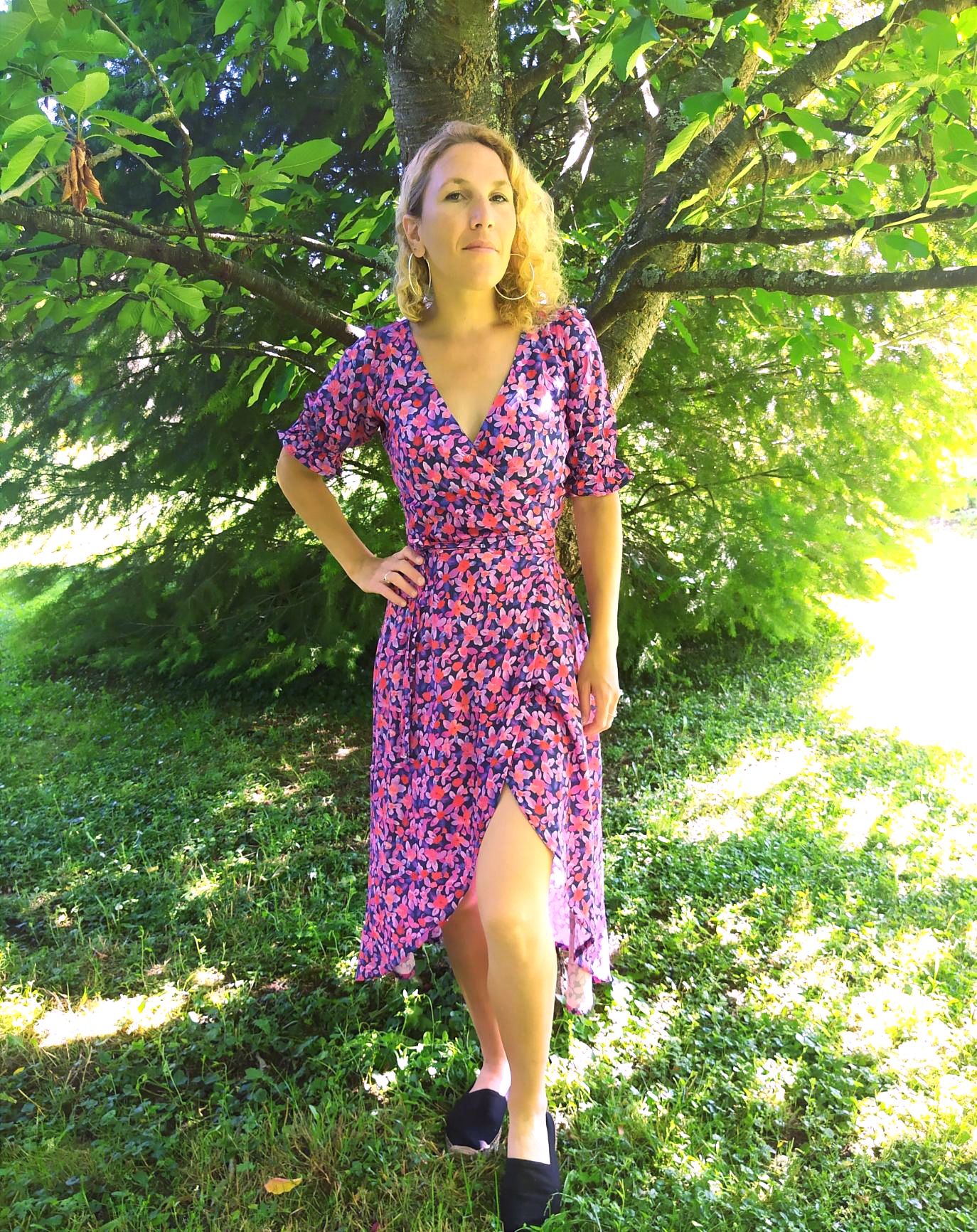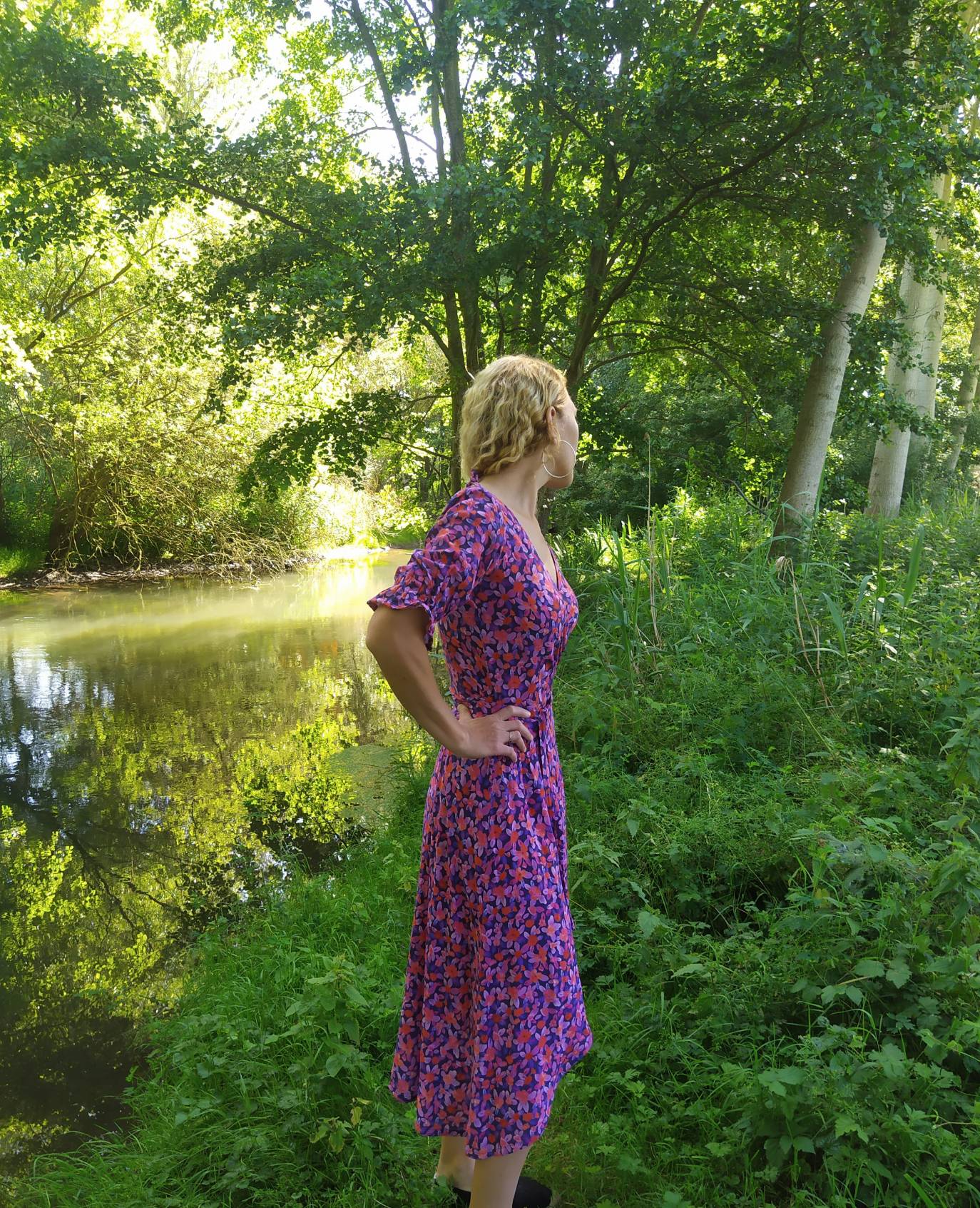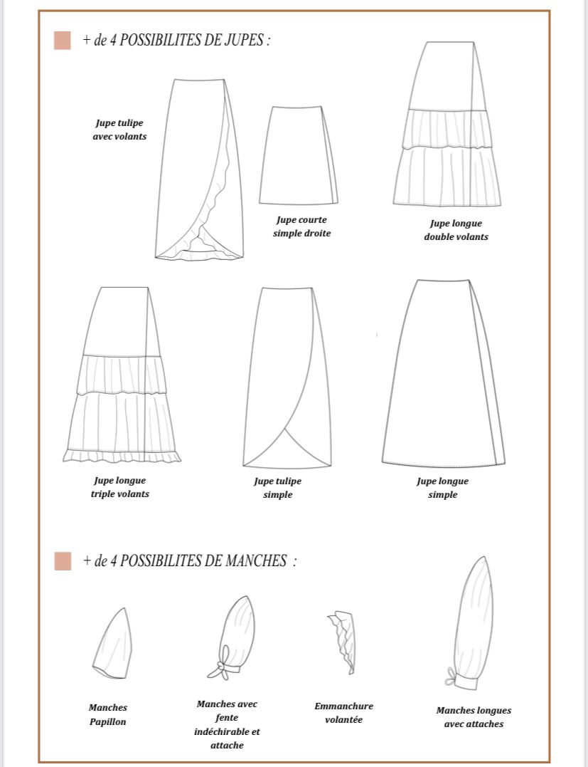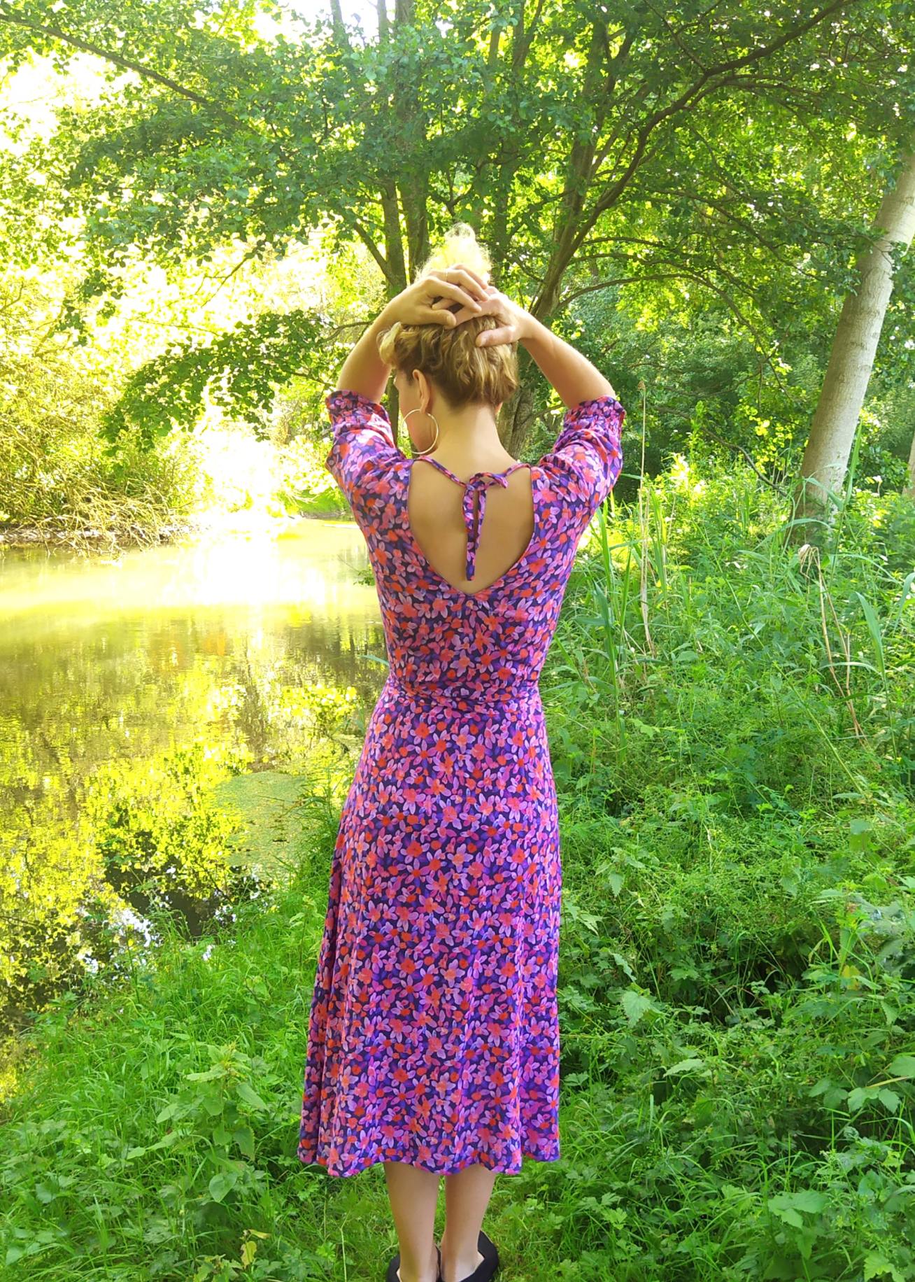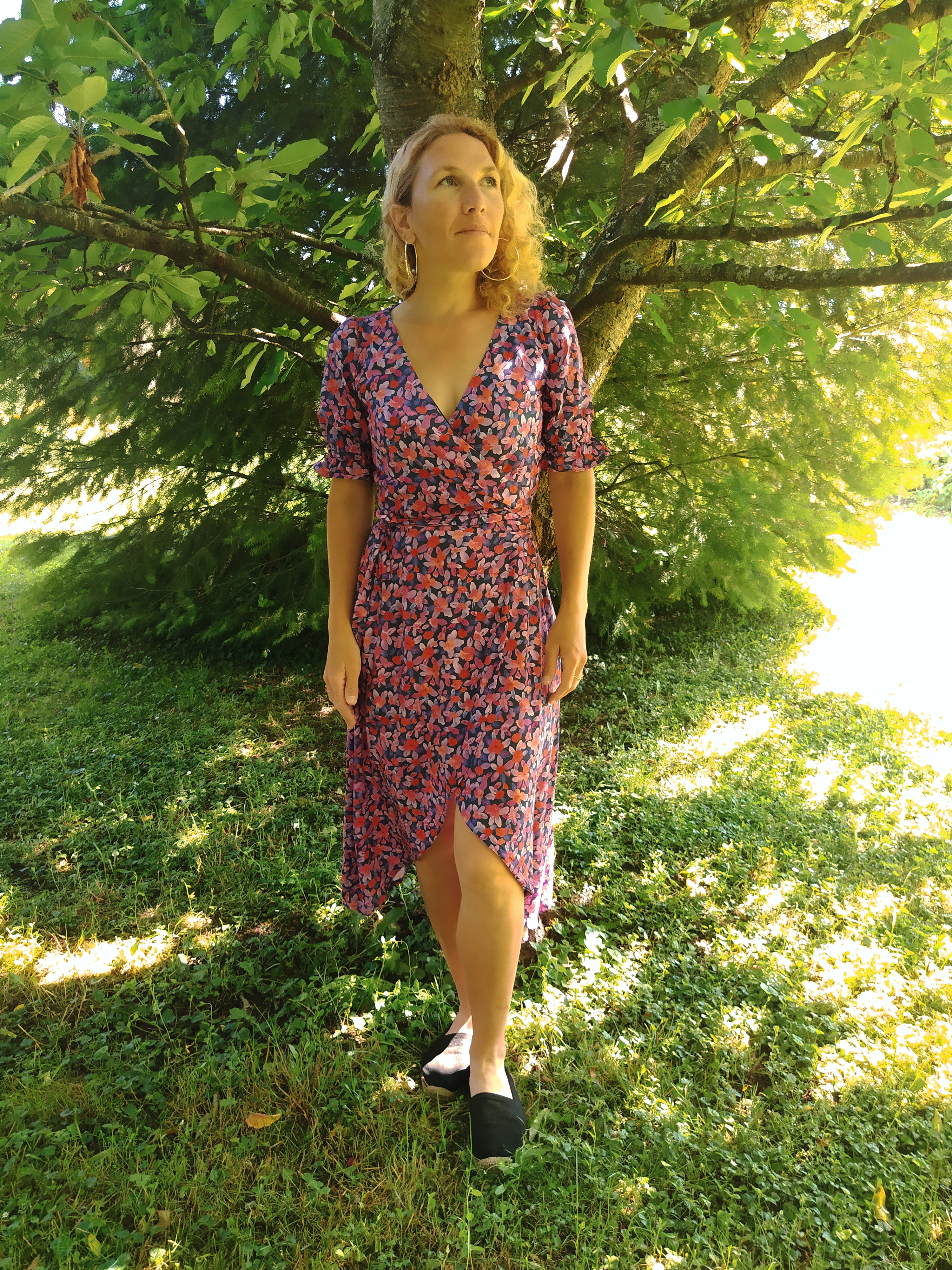 J’ai cousu l’option jupe tulipe , dos v noué et les manches sont celles de Jacinthe ( car oui c’est encore une possibilité du patron 😉 ).