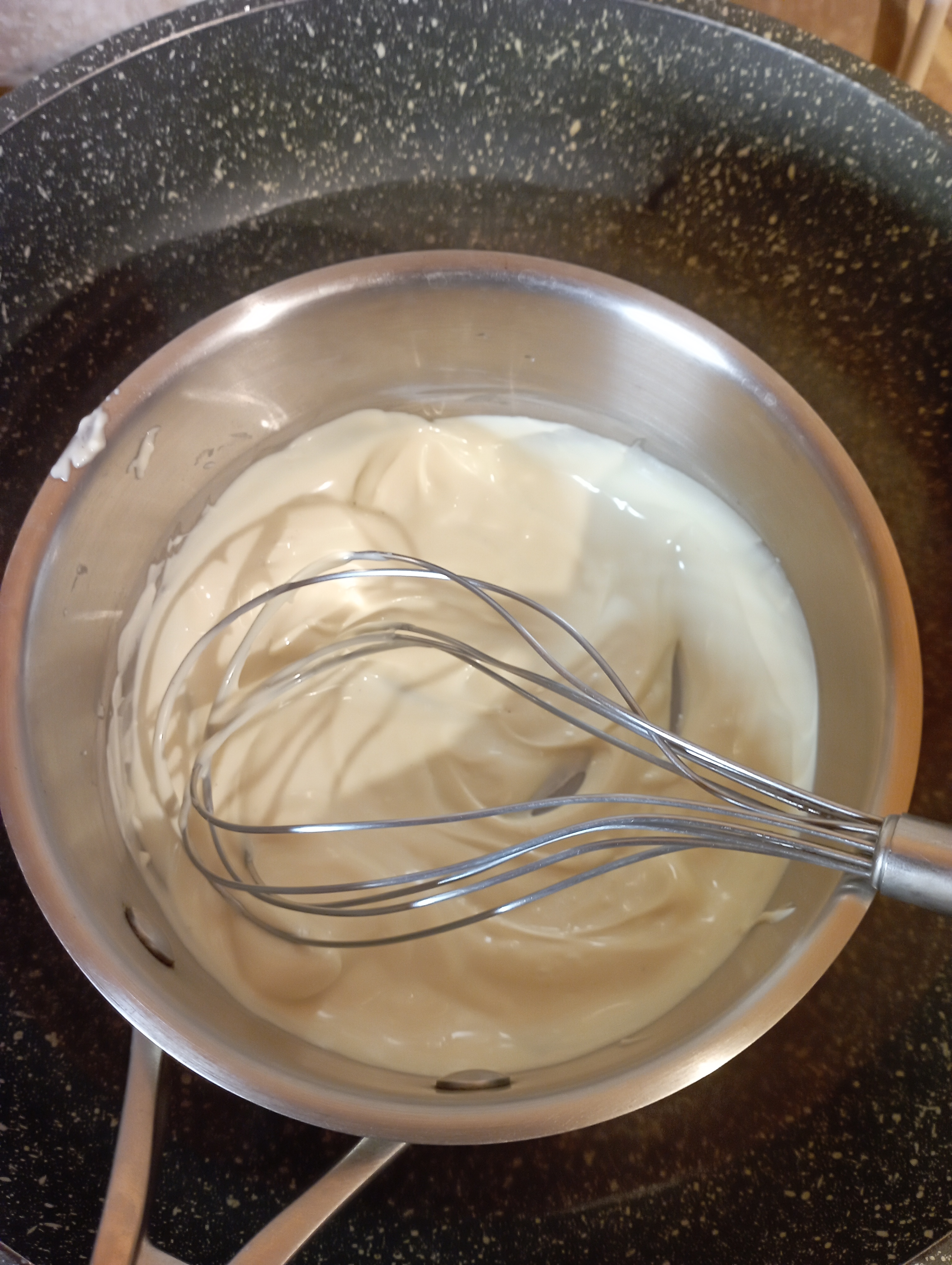 La veille de la dégustation , faites fondre au bain Marie votre chocolat blanc et chauffer en parallèle 100g de crème Fleurette ( le reste de la crème Fleurette , c’est -à -dire 140g, est placé au frais , c’est important). Ensuite versez en 3 fois les 100g de crème bouillante sur le chocolat et fouettez bien .