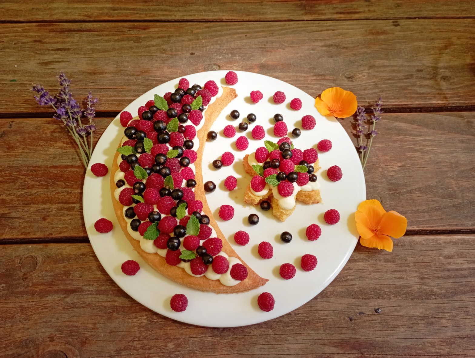Vous allez passer à la phase marrante de décoration. Garnissez votre tarte de fruits frais, parsemez de petites feuilles de menthe ( si vous optez pour des fraises , je vous conseille évidemment le basilic) ou de zeste de citron.