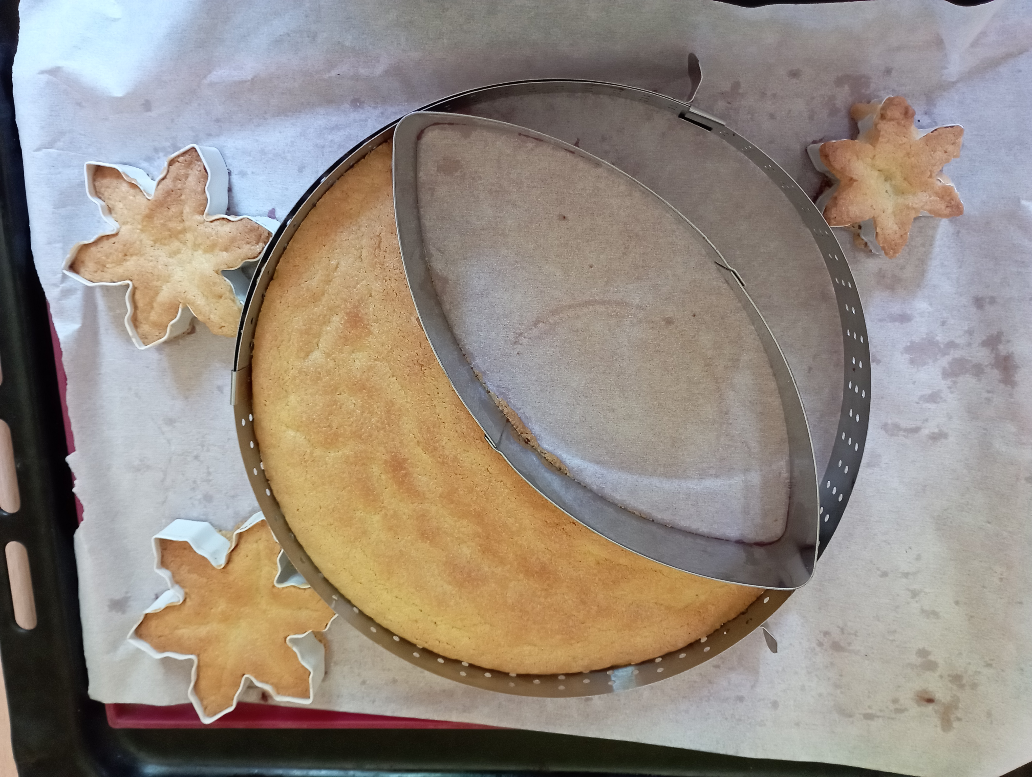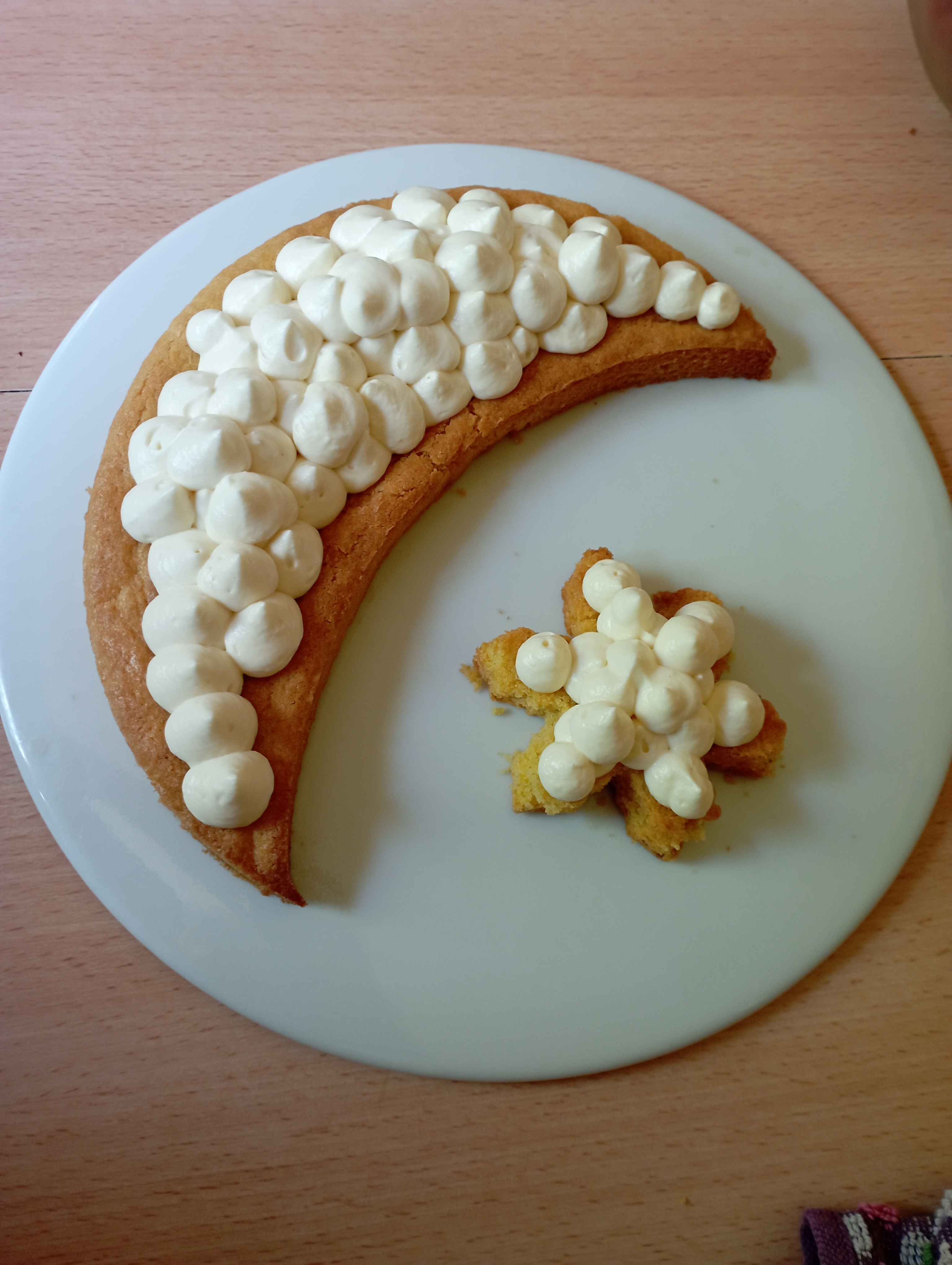 Ici j’ai voulu créer un croissant de Lune et des étoiles: pour cela j’ai pris mon moule à barquette géant de chez Mathon et vous verrez sur les photos comment procéder ainsi que des emporte-pièces étoiles vendus par Mathon ou Cuisine addict ( je ne sais plus trop). Ce midi , la tarte a permis de satisfaire 5 gourmands et il reste une part en comptant l’étoile .