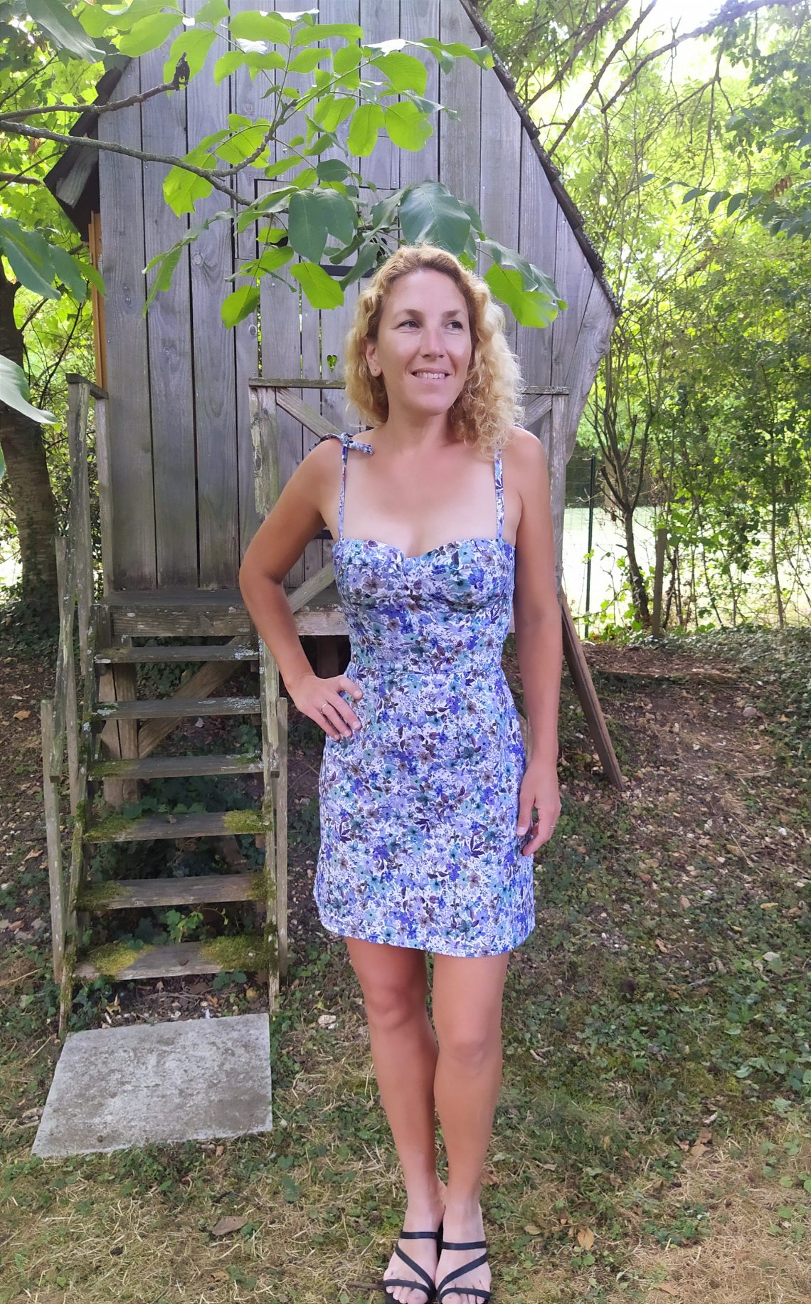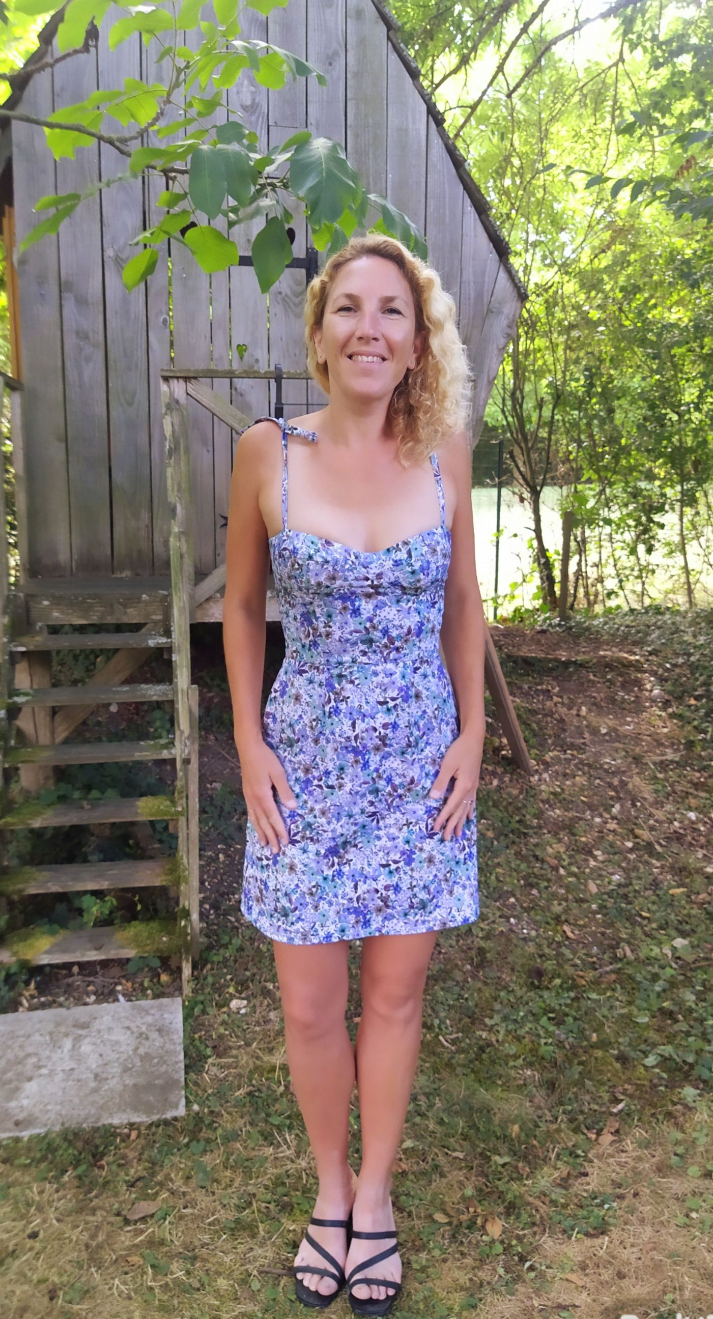 J’ai choisi le 36 bonnet b pour le buste en effectuant une toile au préalable et pour le bas le 34 ( la jupe est trapèze et bien agréable à porter). Un zip invisible ferme le dos : vous apercevez le curseur blanc et c’est tout hihi!