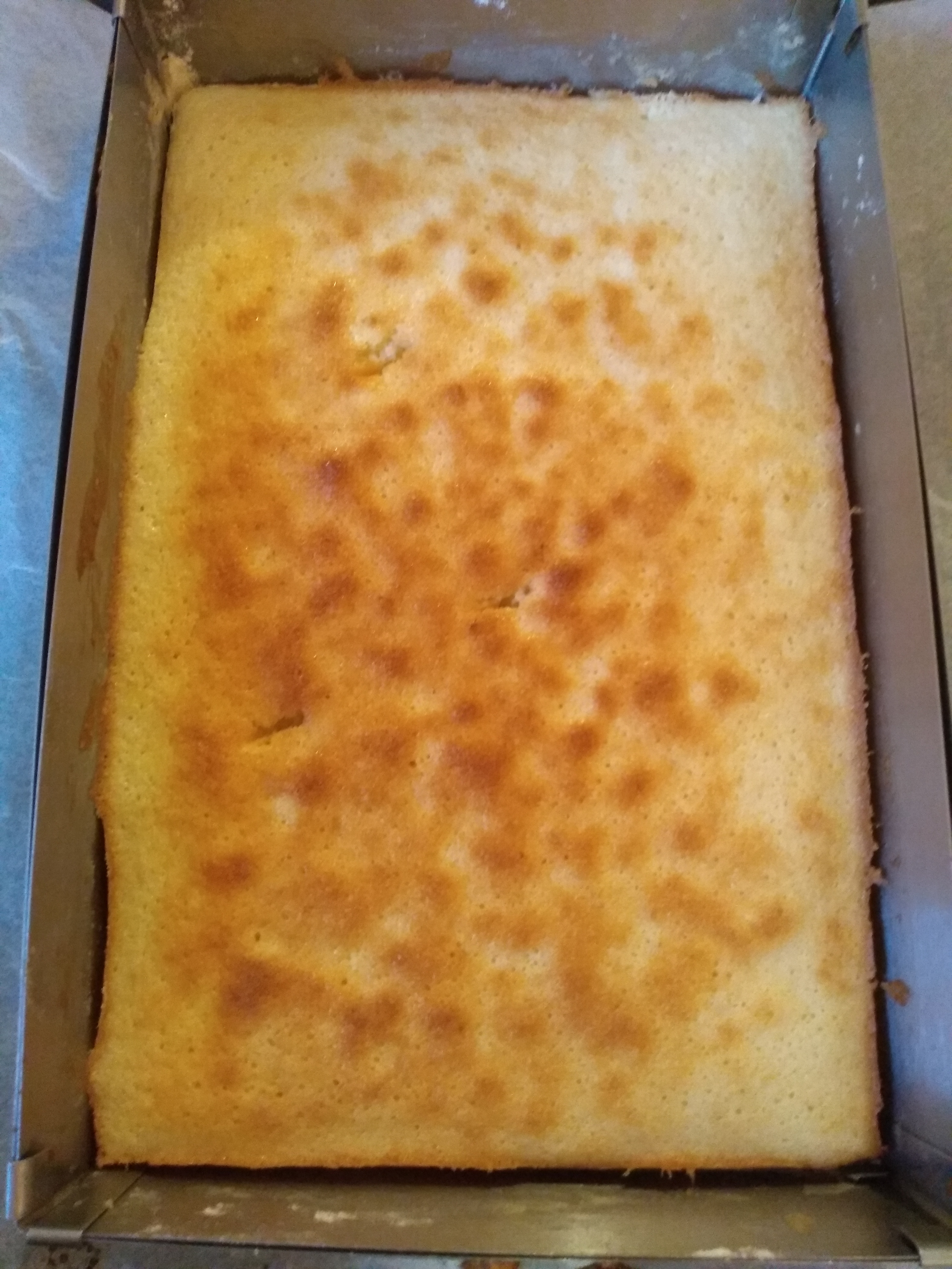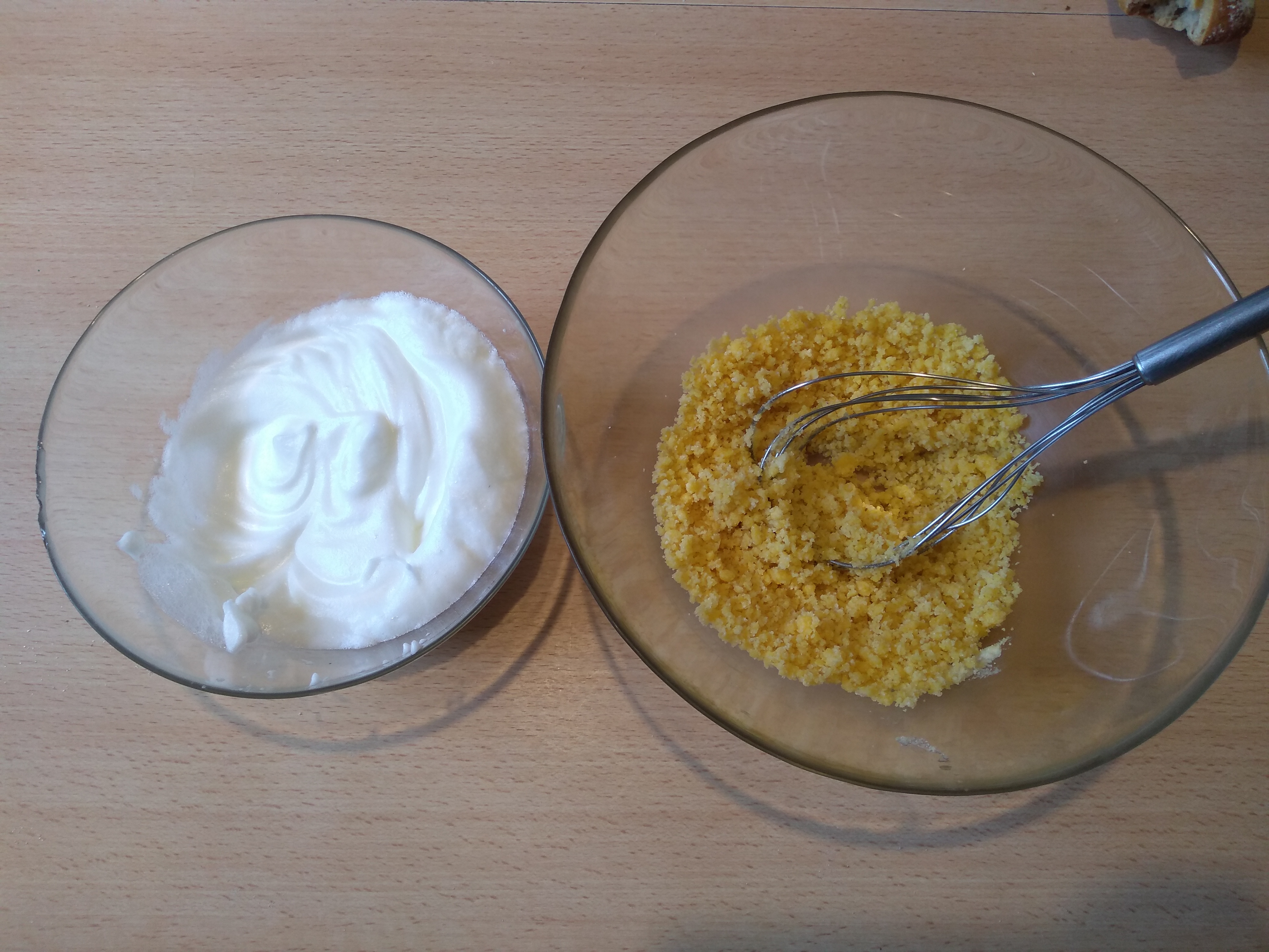 Ensuite préparez une petite génoise : Faites monter les 3 blancs en neige et dans un autre saladier , mélangez le sucre avec les jaunes , puis ajoutez la farine, la poudre d’amandes , la levure et enfin incorporez délicatement les blancs en neige à l’aide d’une maryse.