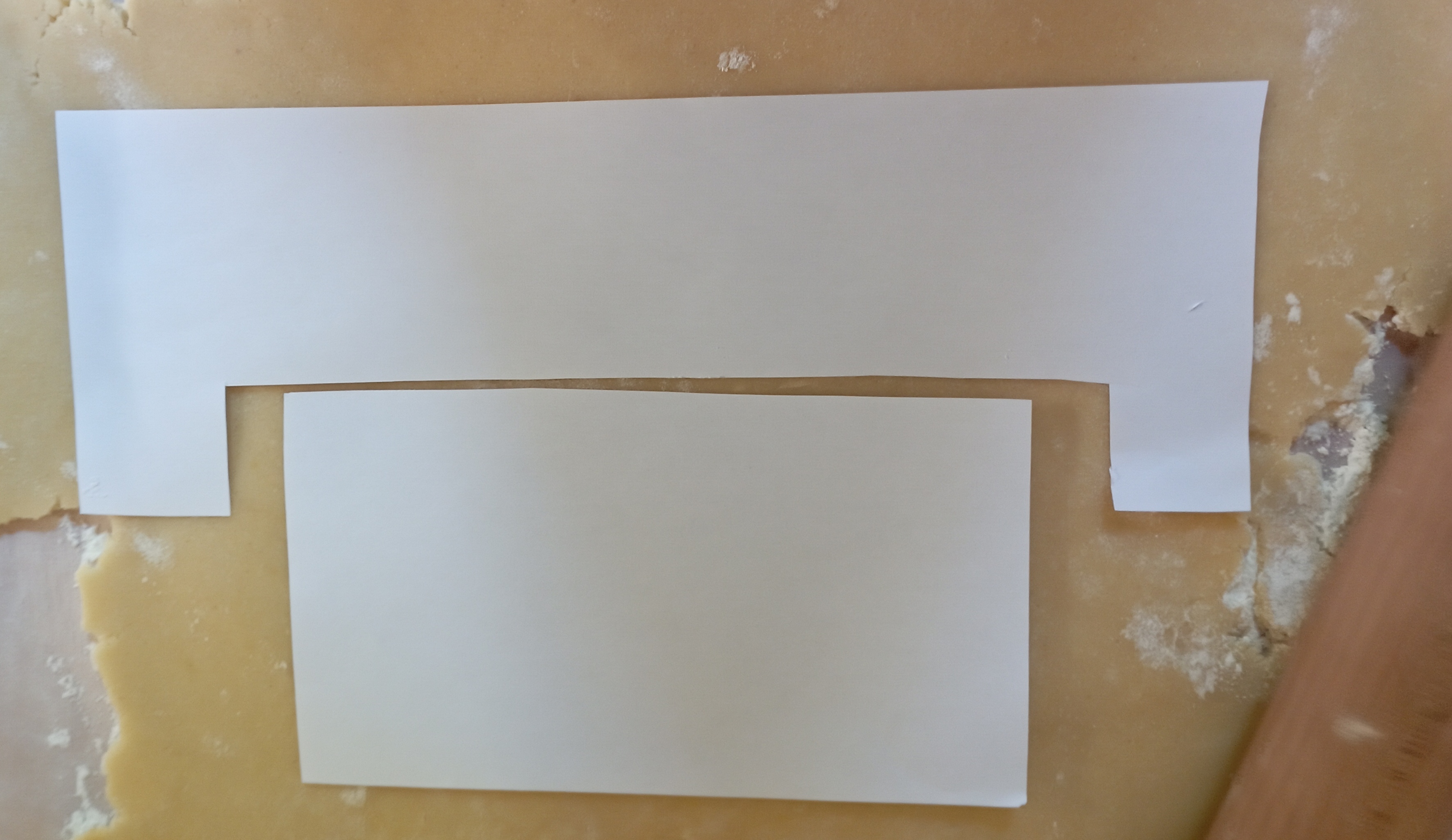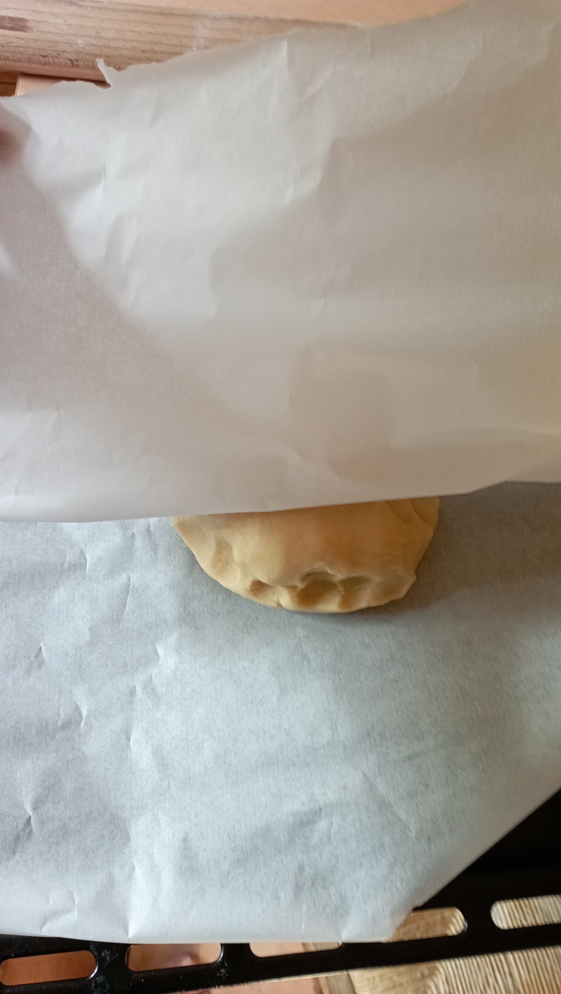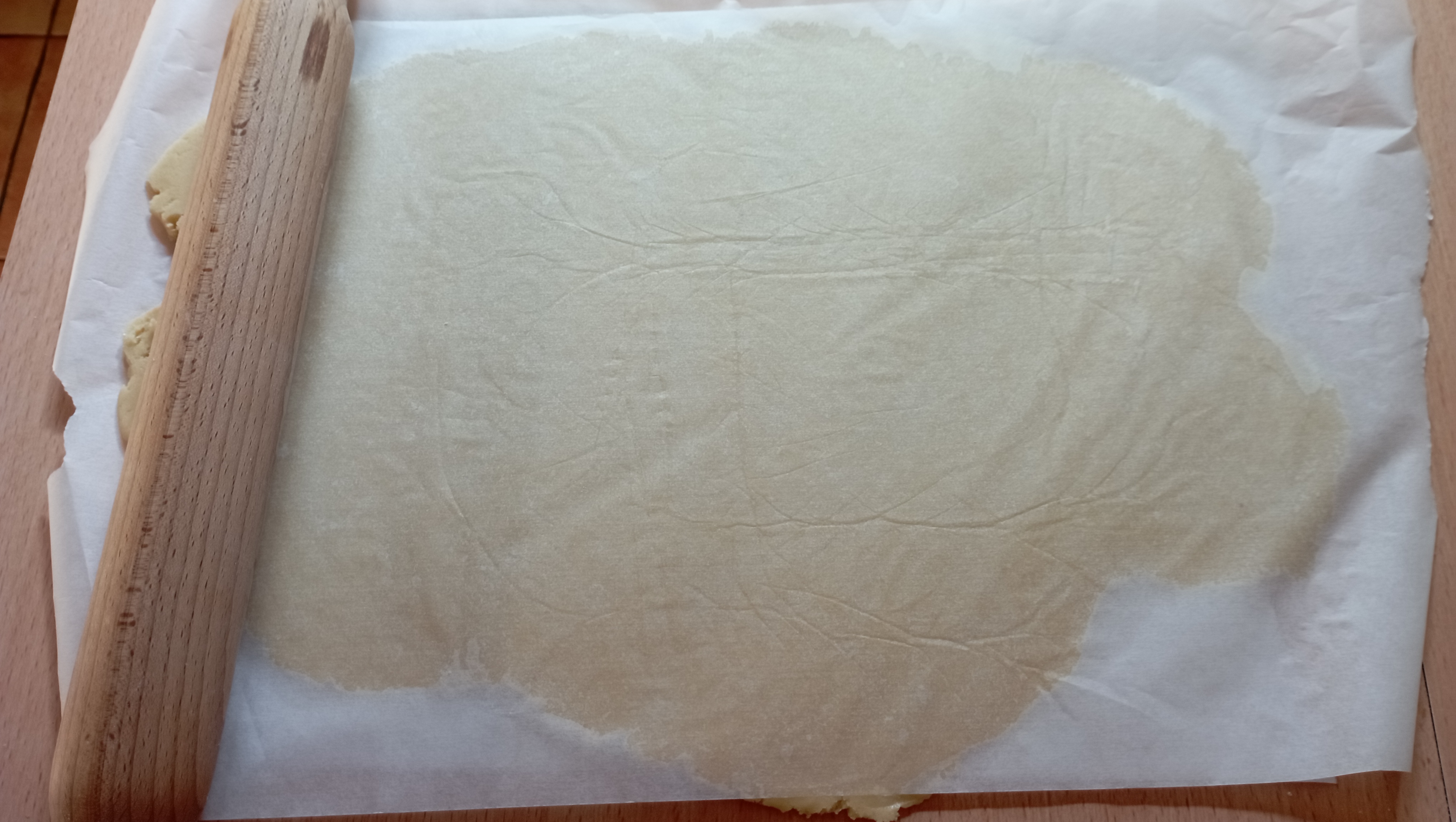 3/ Le lendemain … reprenez votre pâte et sur du papier cuisson fariné , étalez-là sur environ 4 mm d’épaisseur avec un rouleau lui aussi fariné . Si la pâte e réchauffe , n’hésitez pas à la remettre au frais quelques minutes.
