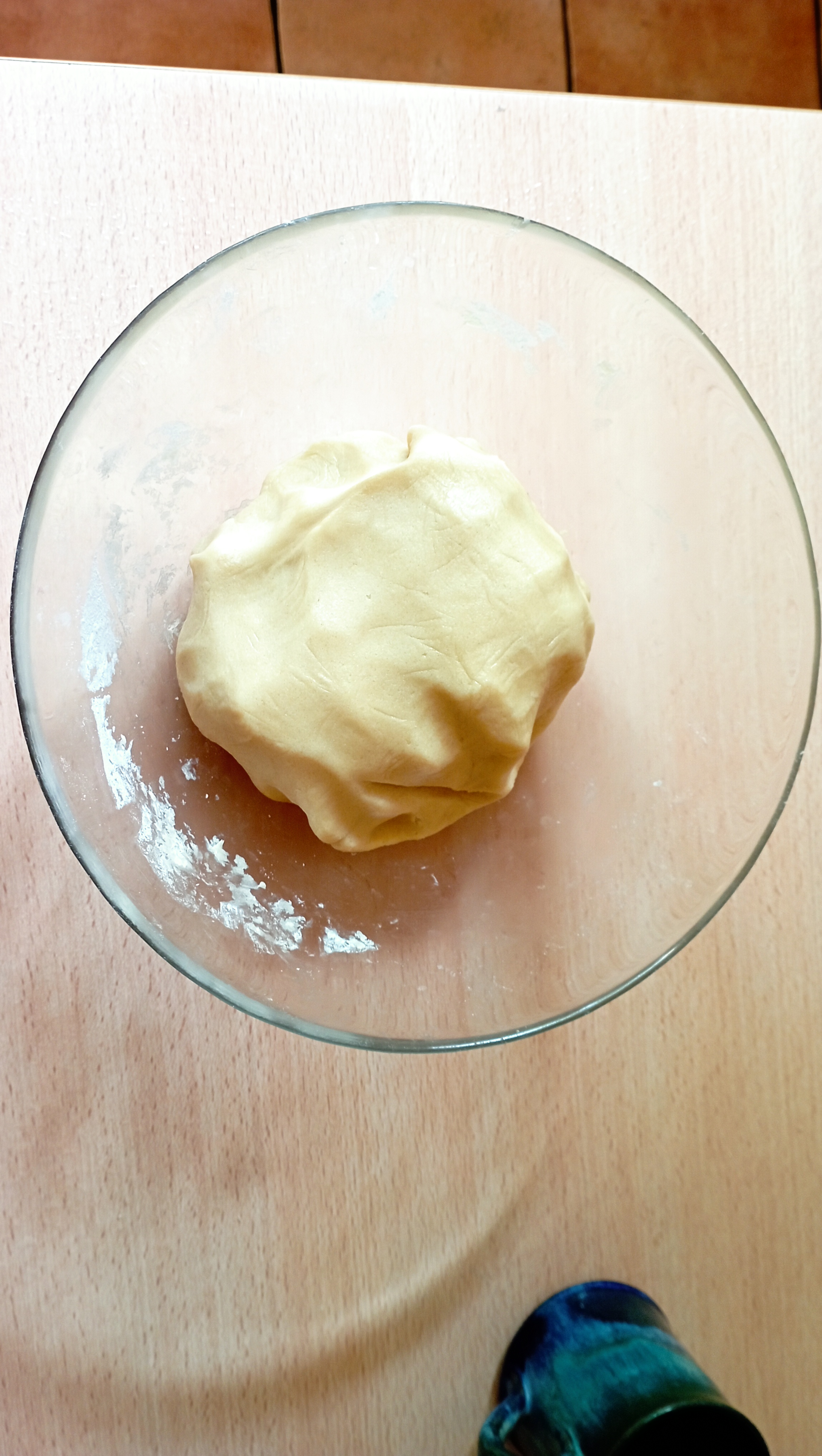 Tamisez le sucre glace ( j’ai délégué à Mymy , elle apprécie de plus en plus la pâtisserie et la cuisine) et mélangez au beurre avec le sucre vanillé , l’oeuf battu, 1 pincée de sel et 40 g de poudre d’amandes. Ajoutez la farine tamisée et former une boule homogène.