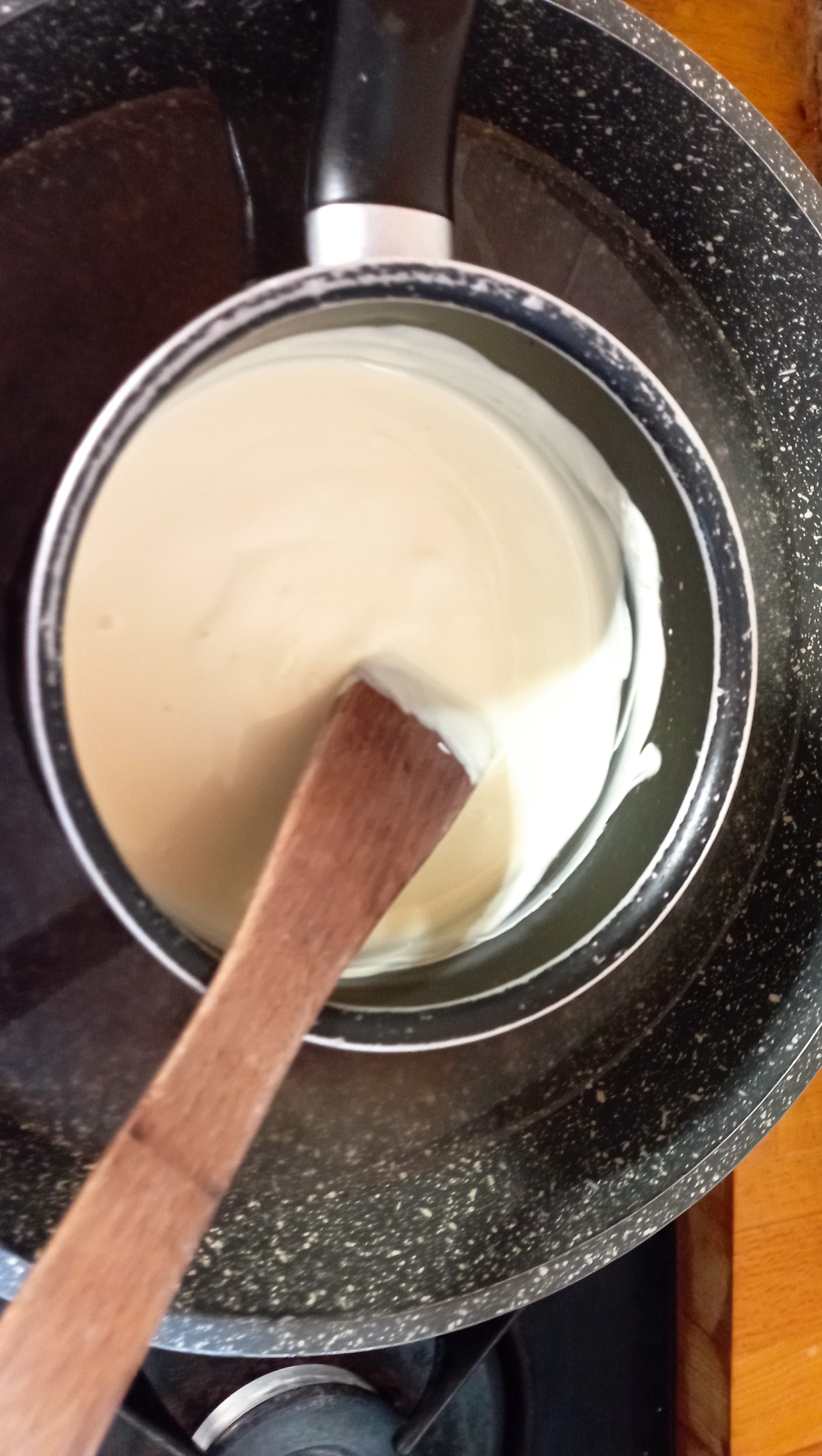 Ajoutez en 3 fois la crème liquide chaude et bien remuez puis ajoutez le reste de crème resté au frais en remuant toujours bien. Filmez et placez au frais toute la nuit.