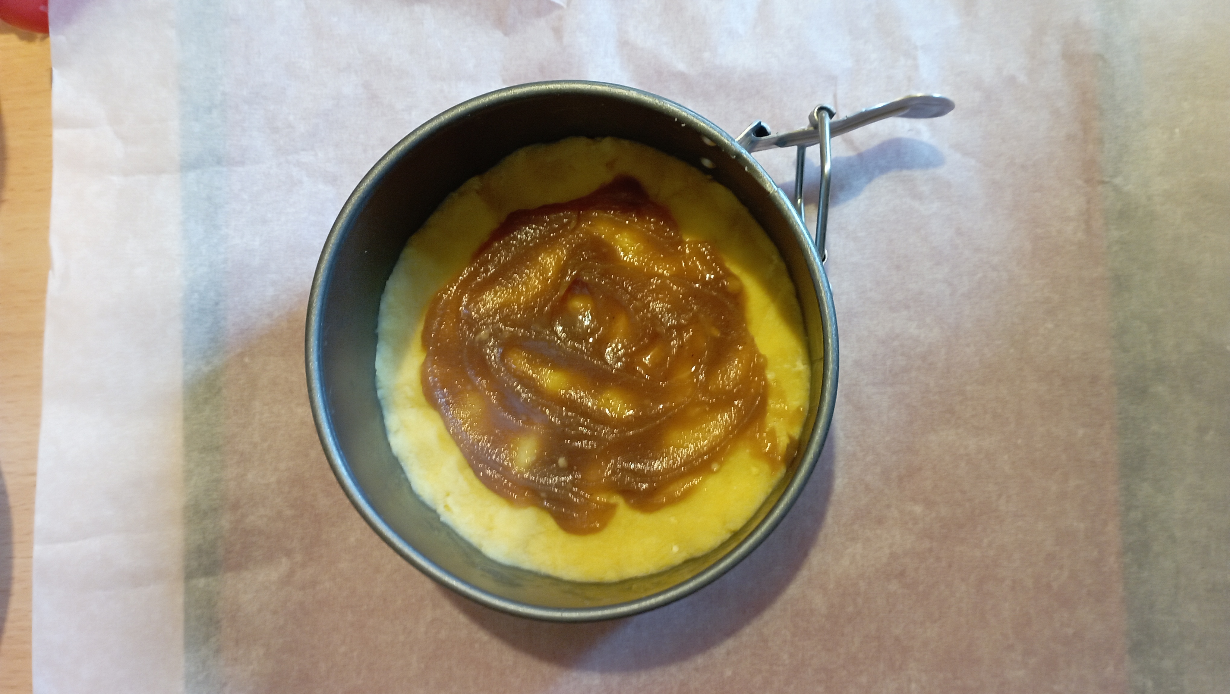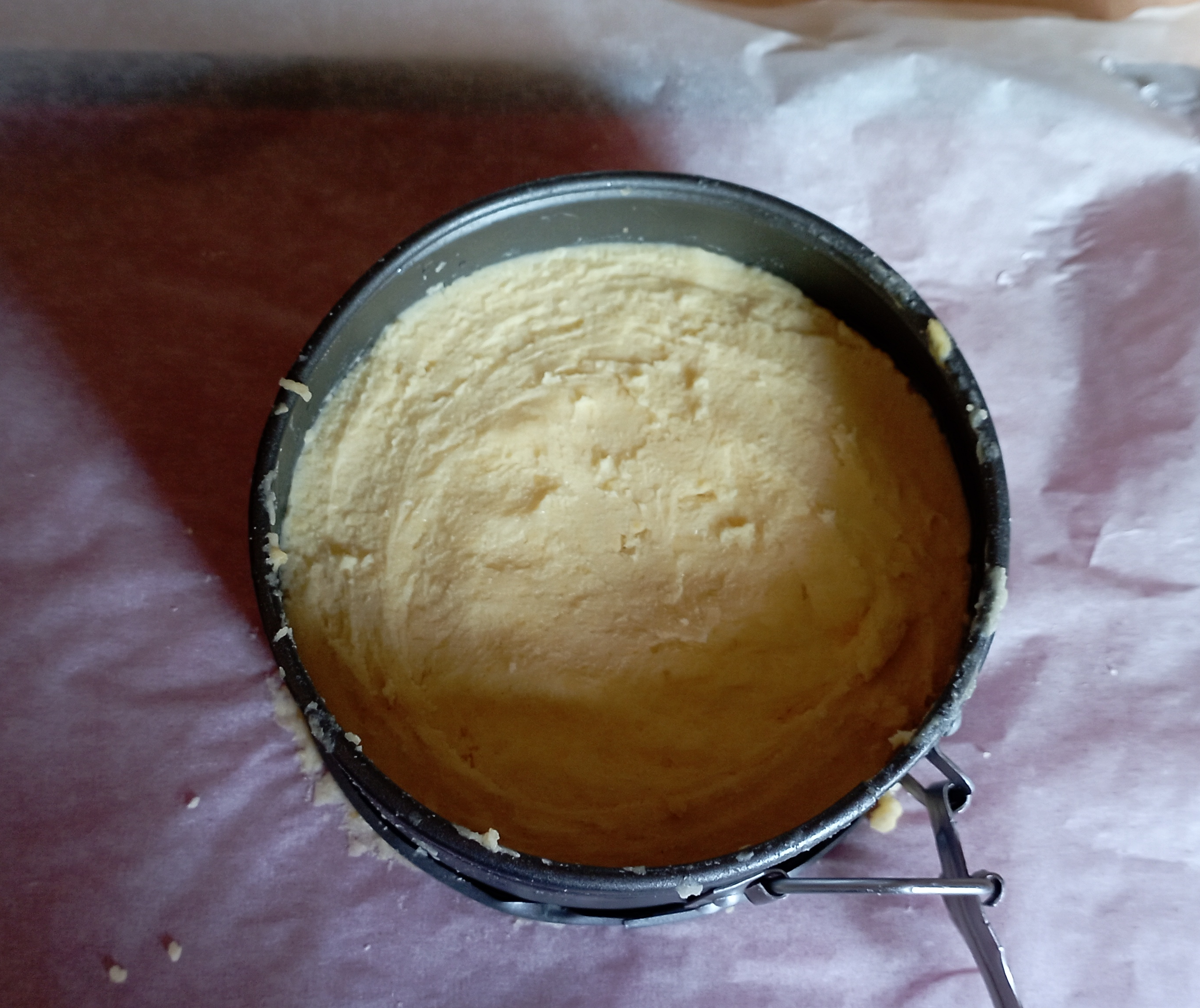 Garnissez un fond de cercle amovible placé sur une plaque de papier cuisson . La première couche ne doit pas être trop épaisse car il faudra plus de pâte pour recouvrir la crème de marron.