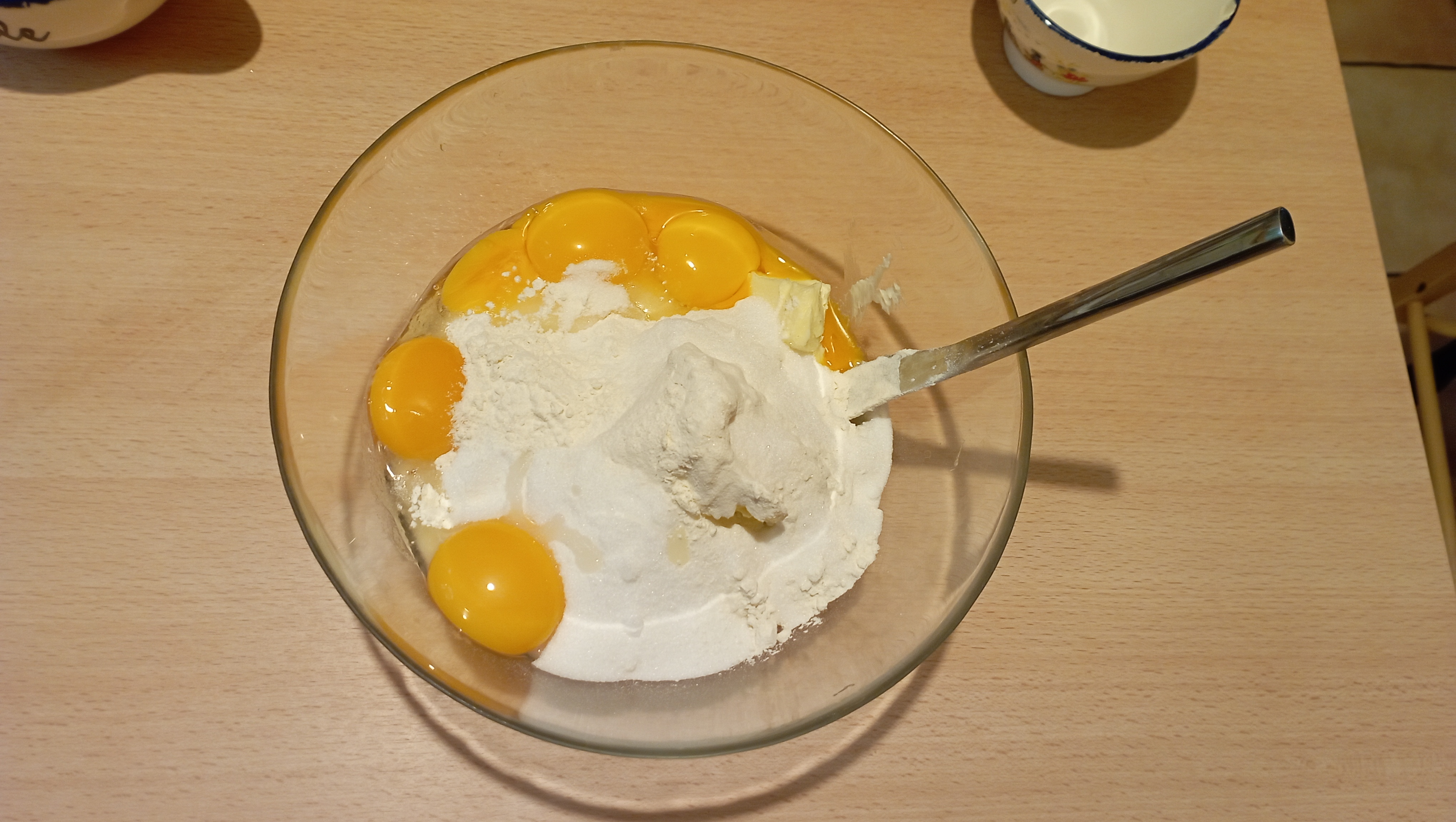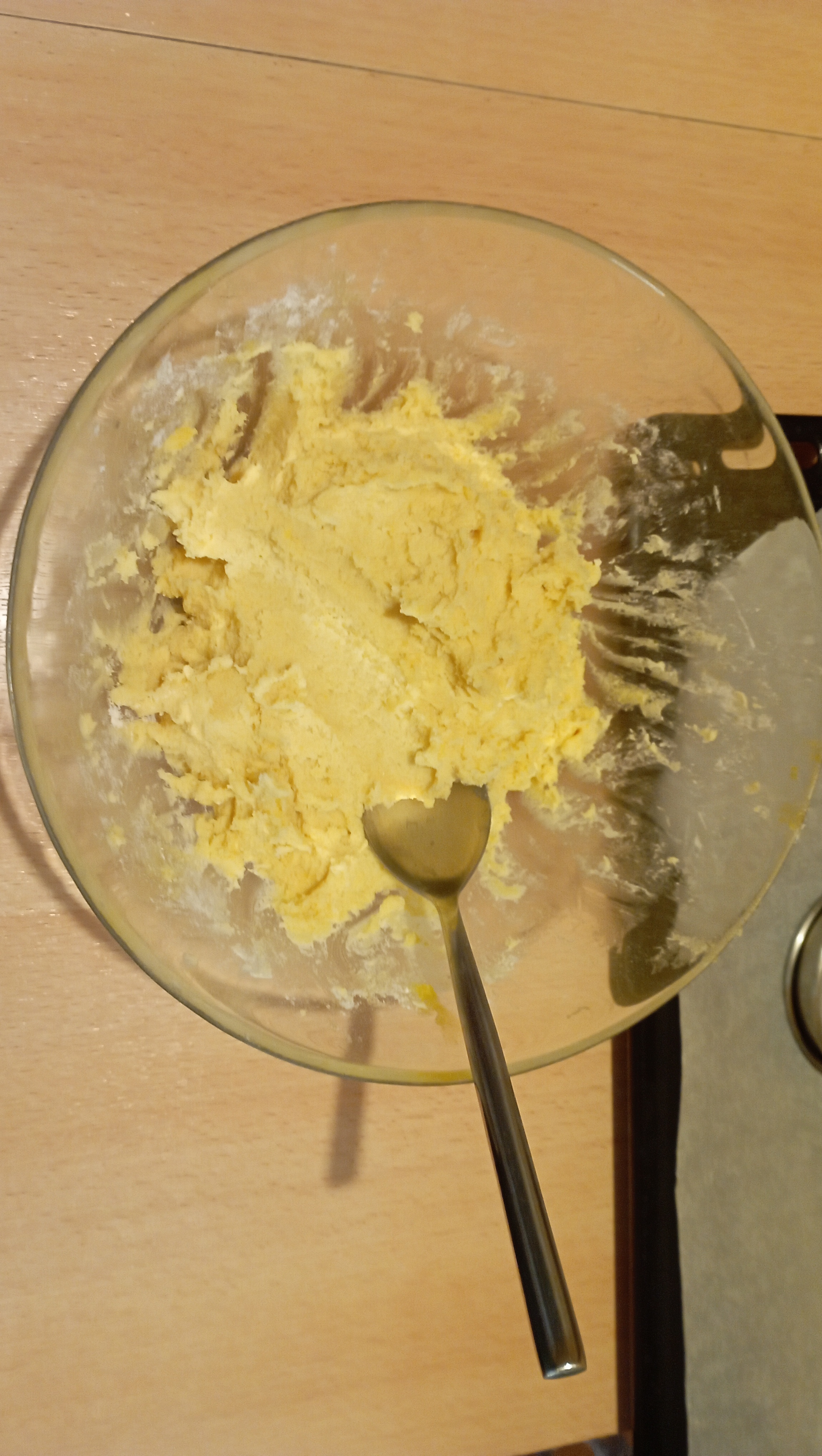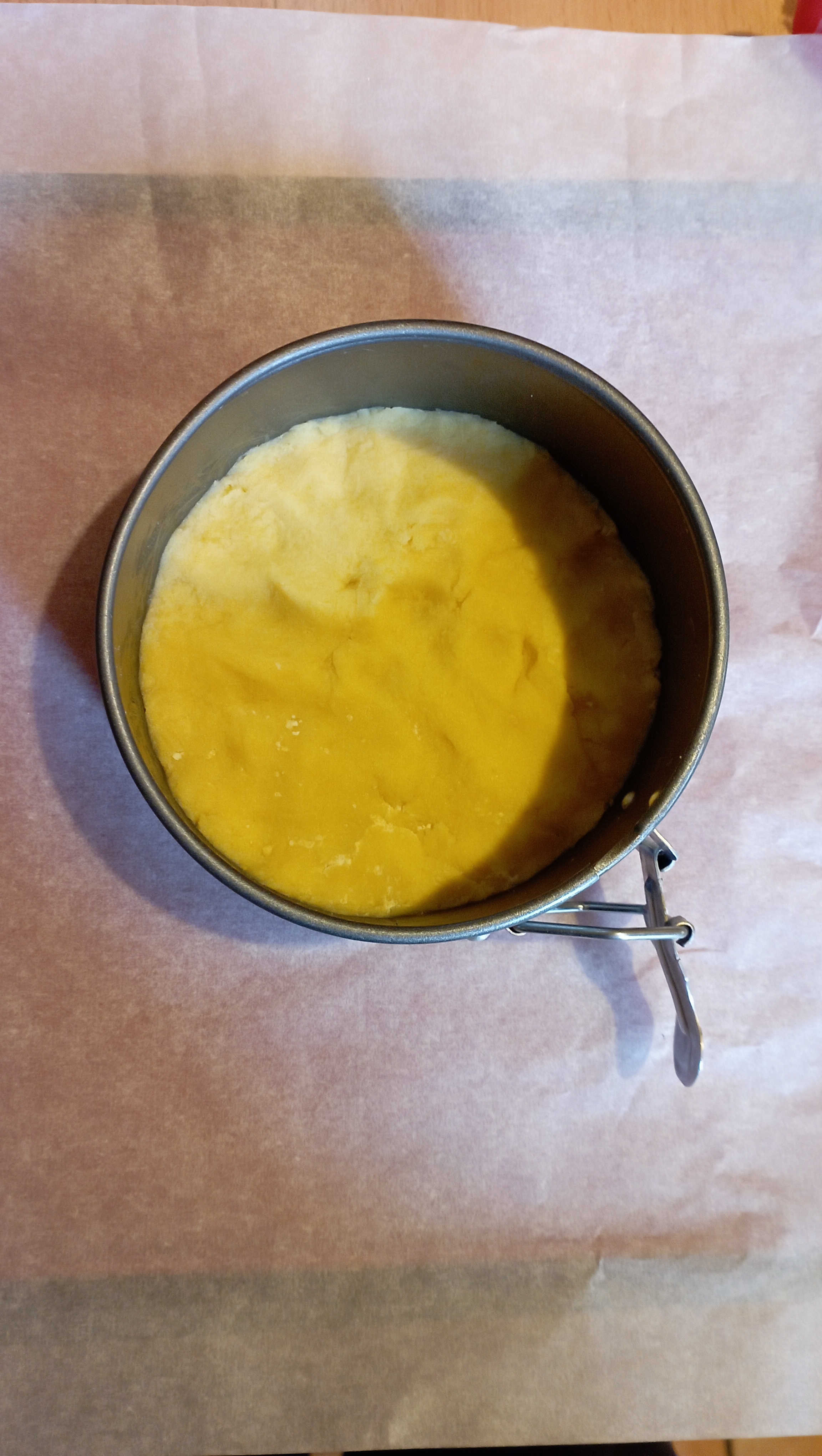 1/ La pâte : Dans un saladier , mélangez le beurre bien mou avec la farine , le sucre et les jaunes d’oeufs . Ajoutez une cuillère à soupe d’arôme vanille. Formez une boule homogène à la main .