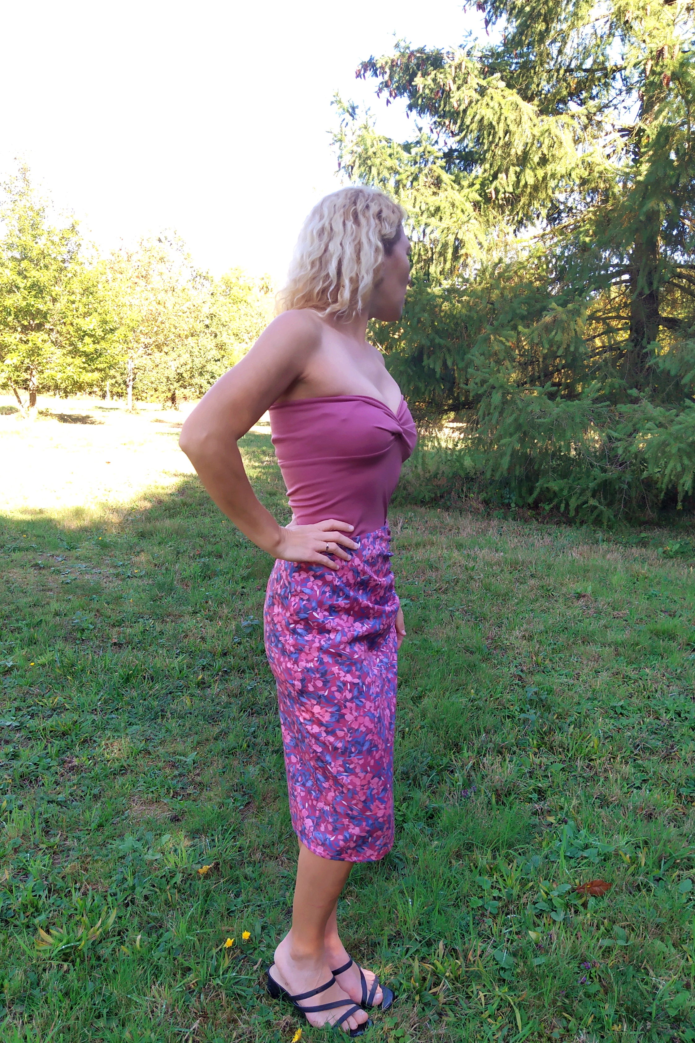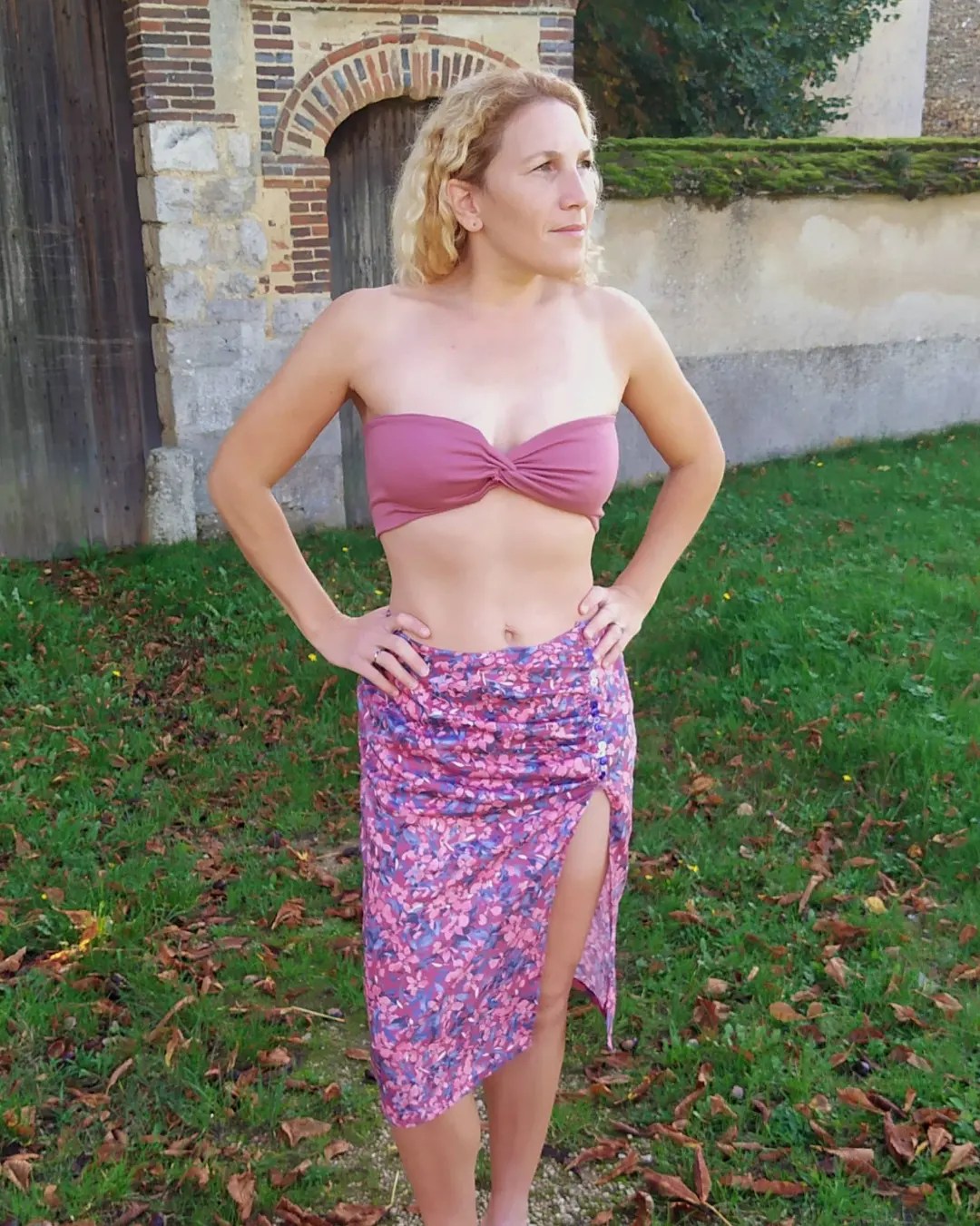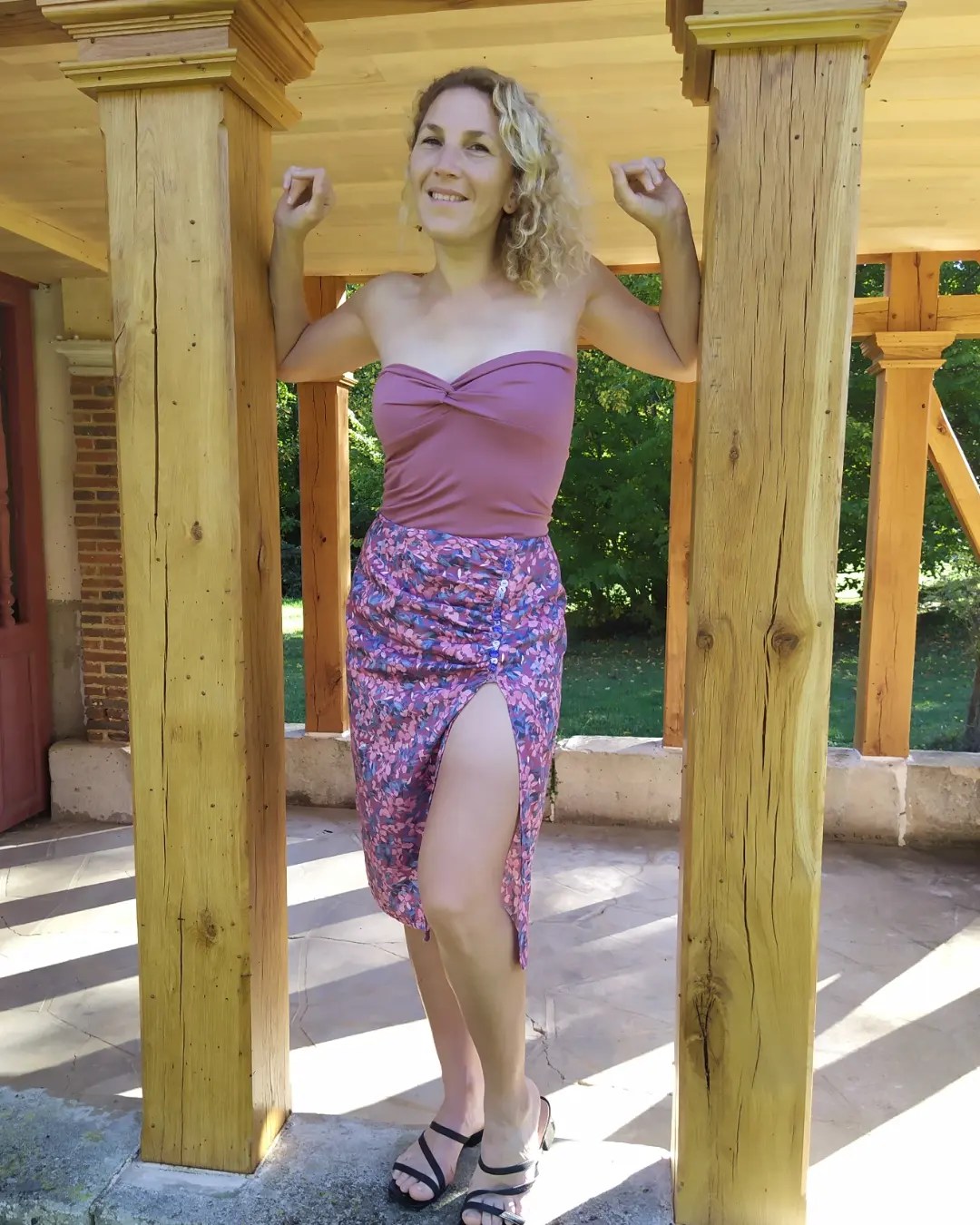 Le haut de la jupe est doublé . Même en maxi fente , votre slip restera caché ;), soyez sereines. J’ai coupé le 36 car mon tissu n’est pas extensible .
