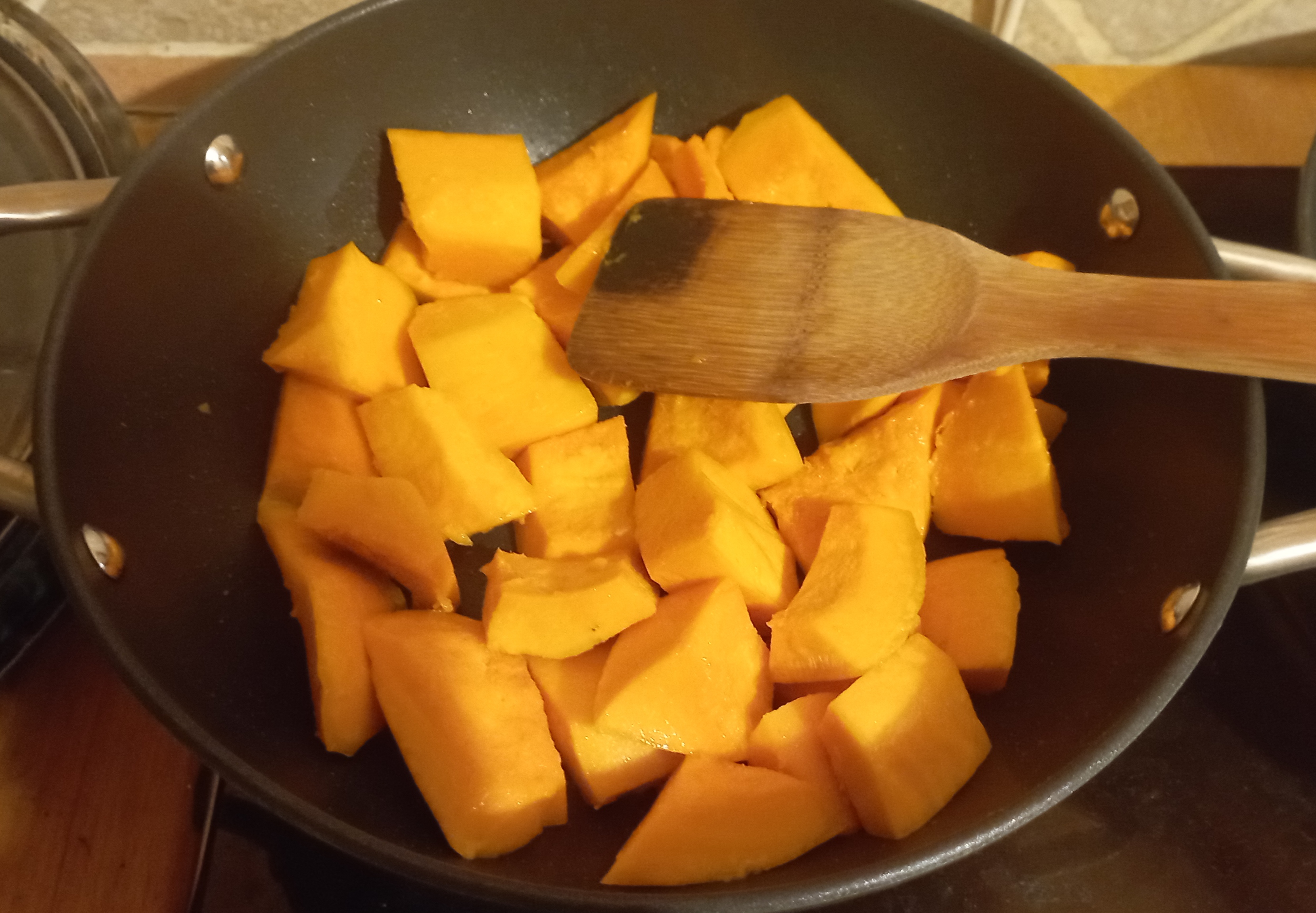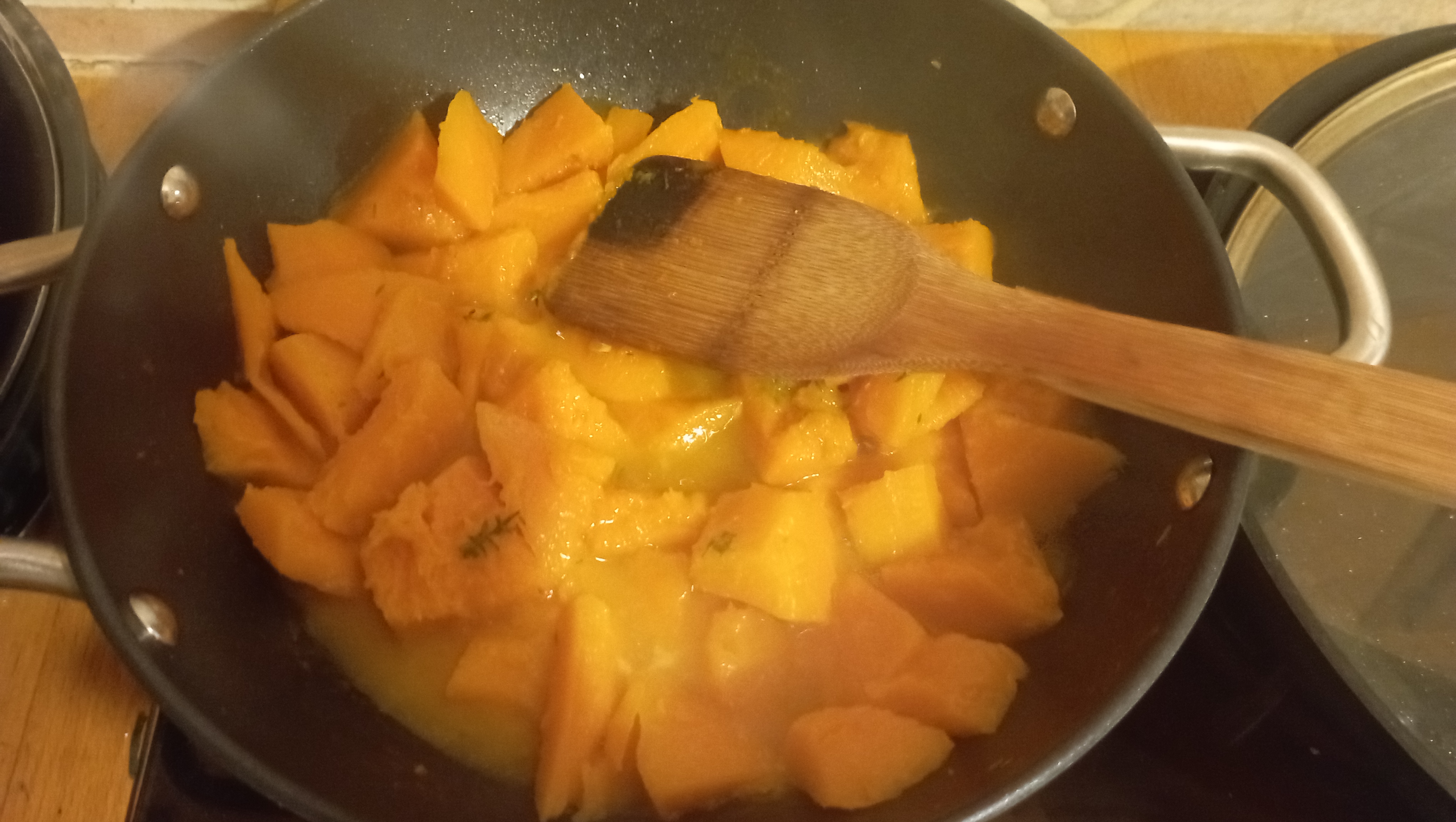 1/ Epluchez et coupez le potimarron en gros quartiers ..; c’est la partie la moins fun ….Faites revenir dans la sauteuse à l’huile d’olive avec du thym pour faire dorer puis ajoutez un peu d’eau et faites chauffer jusqu’à réduire en purée ( une bonne vingtaine de minutes)