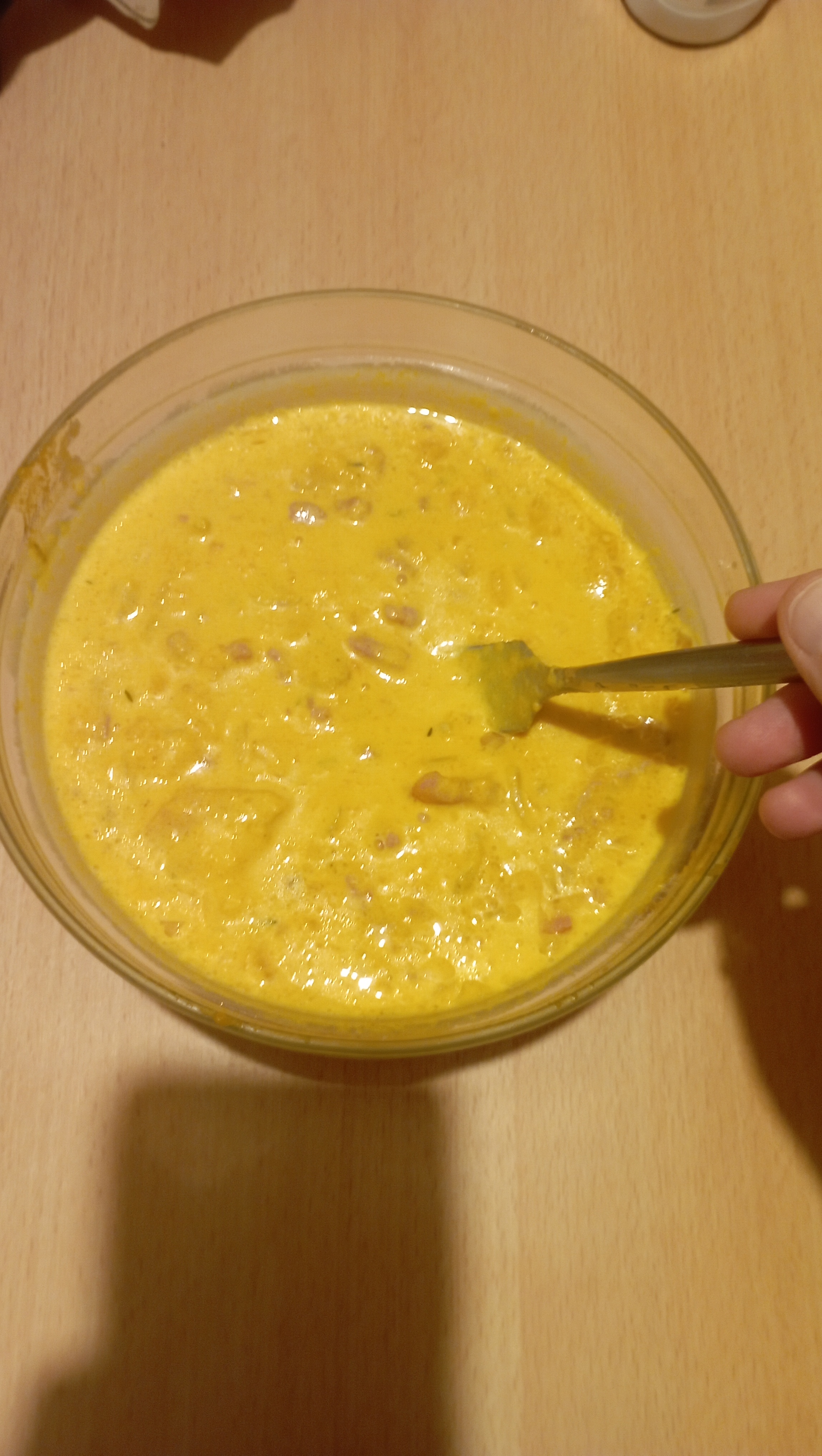 3/ Mettez le potimarron dans un saladier , écrasez au presse-purée . Ajoutez la crème et remuez bien . Ajoutez ensuite les oignons et lardons . Remélangez .