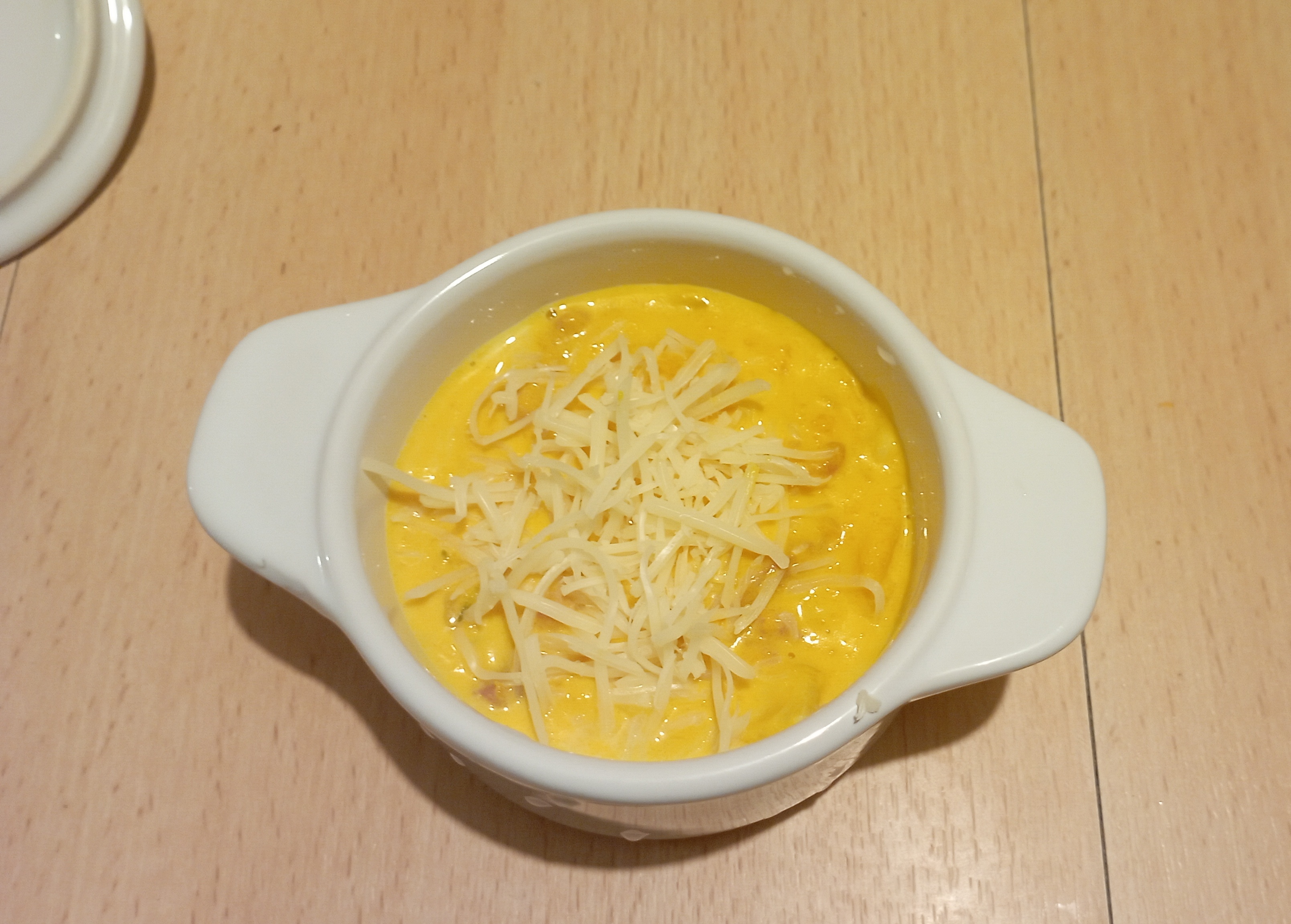 4/ Ajoutez le gruyère râpé et disposez dans les cocottes . Saupoudrez éventuellement d’un soupçon de gruyère pour le côté gratiné .