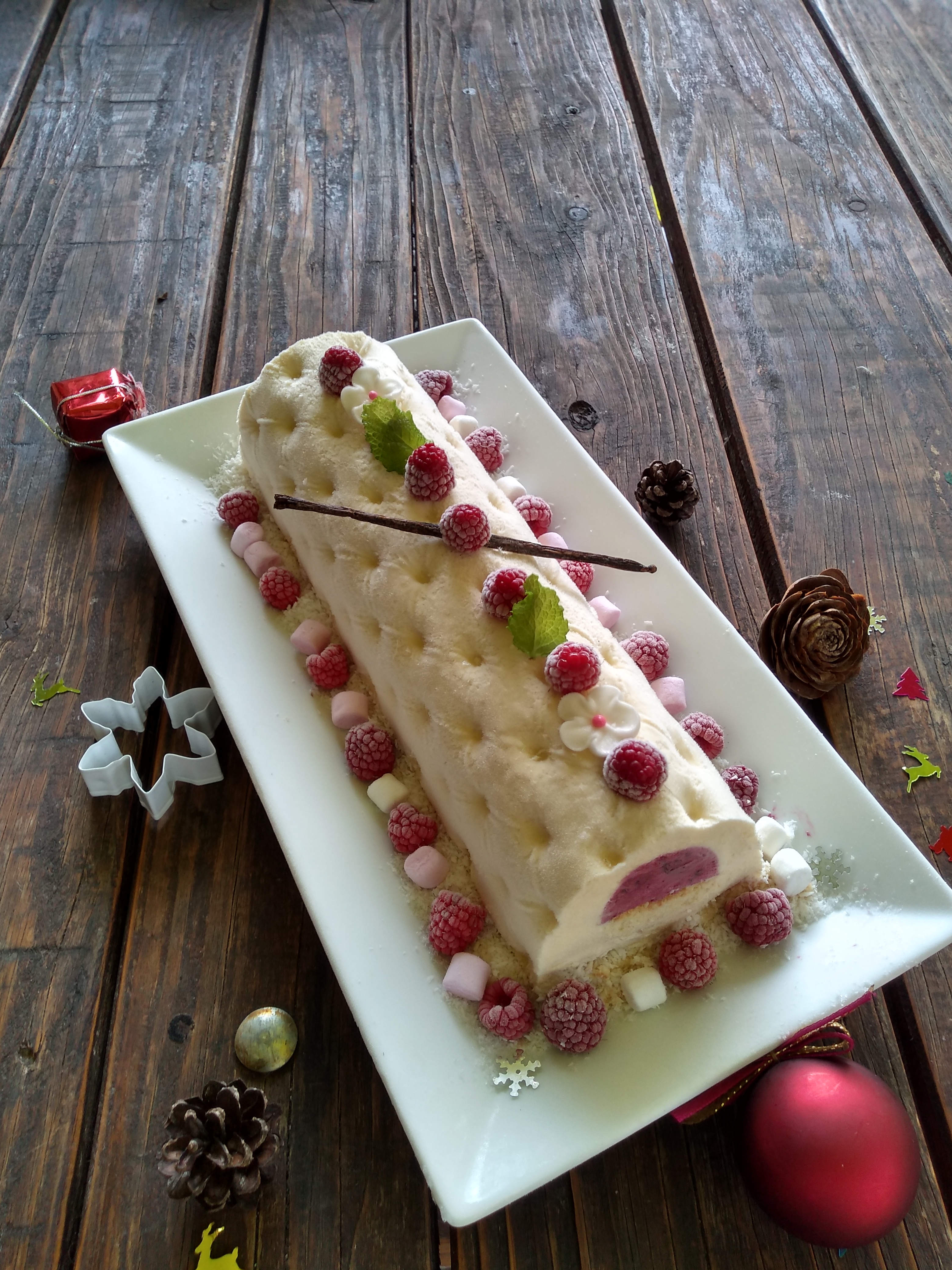 Celle-ci est très classique avec un insert de mousse de fruits rouges , une mousse chocolat blanc vanille et deux couches de génoise à la noix de coco. Les quantités raviront 12 convives . Elle se prépare sur deux jours et présente l’avantage de ne pas nécessiter de glaçage donc vous obtiendrez un beau résultat avec n’importe quel moule à bûche.
