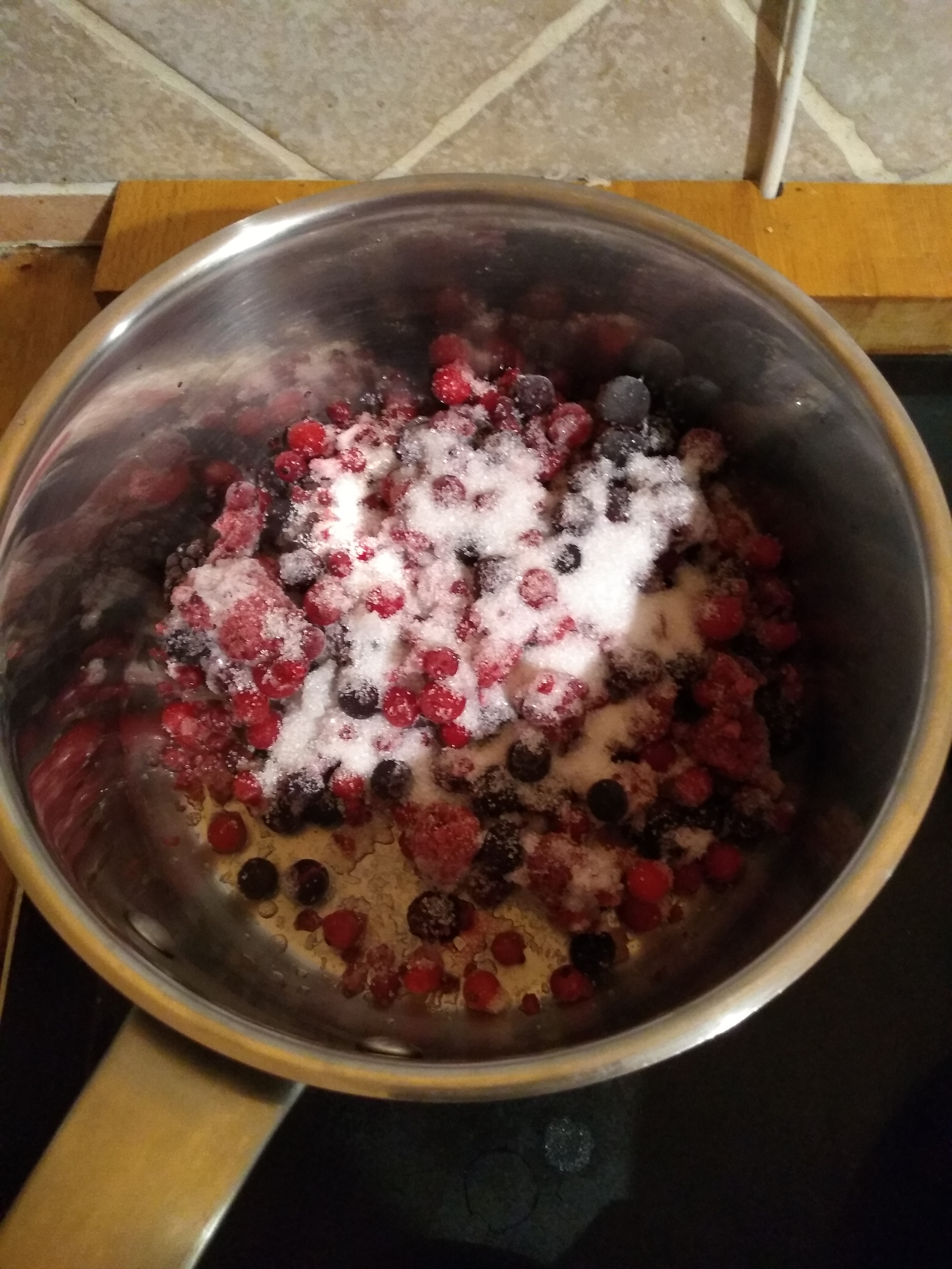 2/ pour la mousse aux fruits rouges: 250g de fruits rouges,25cl de crème fleurette,7g de gélatine à réhydrater,1 cs de sucre en poudre,1 cs de sucre glace