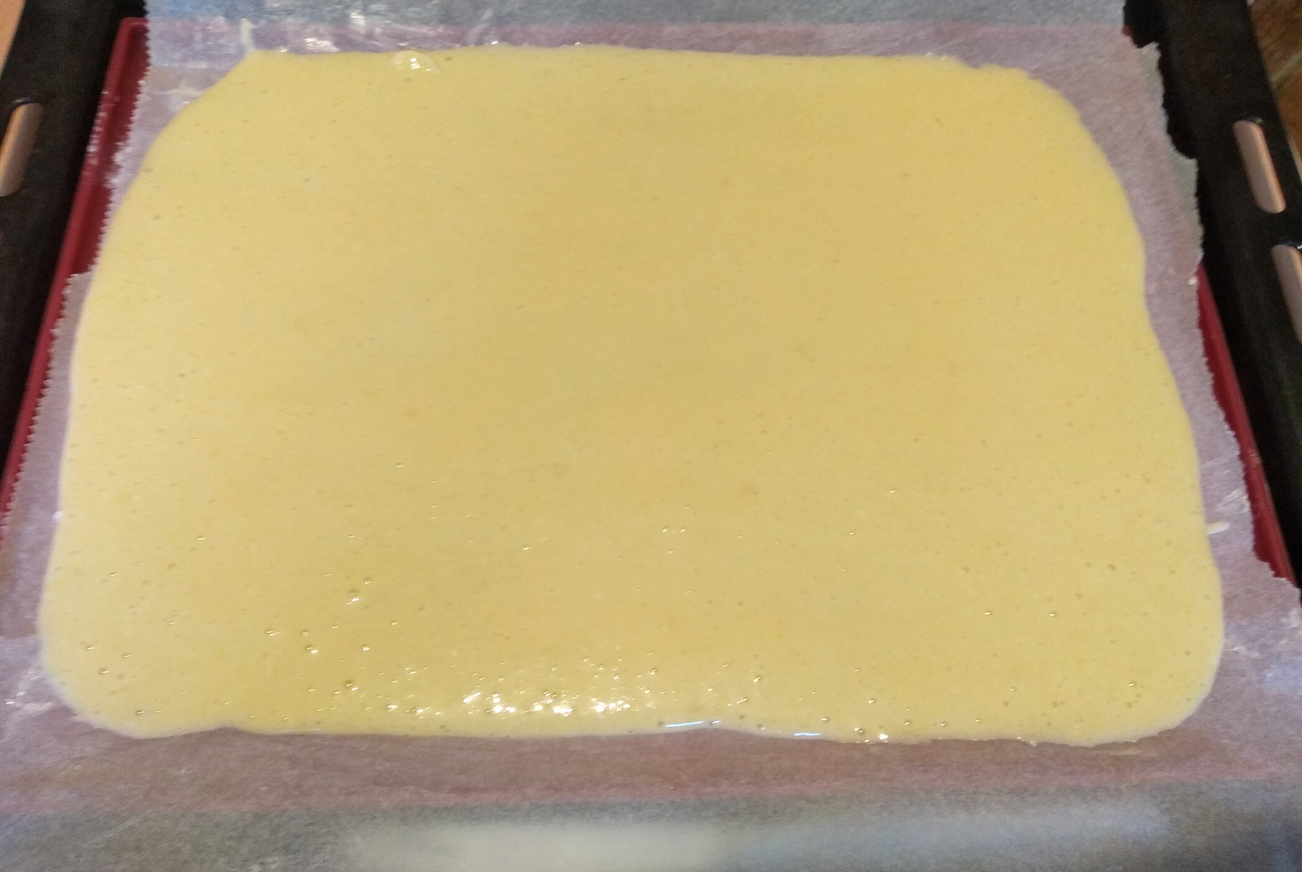 Le lendemain , opération génoise...Cassez 3 œufs , séparez les blancs des jaunes .Mélangez les jaunes avec 100g de sucre en poudre , 75 g de farine et 25g de poudre de noix de coco.Montez les blancs en neige ferme.Incorporez les blancs au premier mélange avec une spatule en bois .Versez la génoise sur une plaque recouverte de papier cuisson beurrée et enfournez à 180° chaleur classique pour quelques minutes . Votre génoise doit dorer mais rester moelleuse. Laissez refroidir complètement !