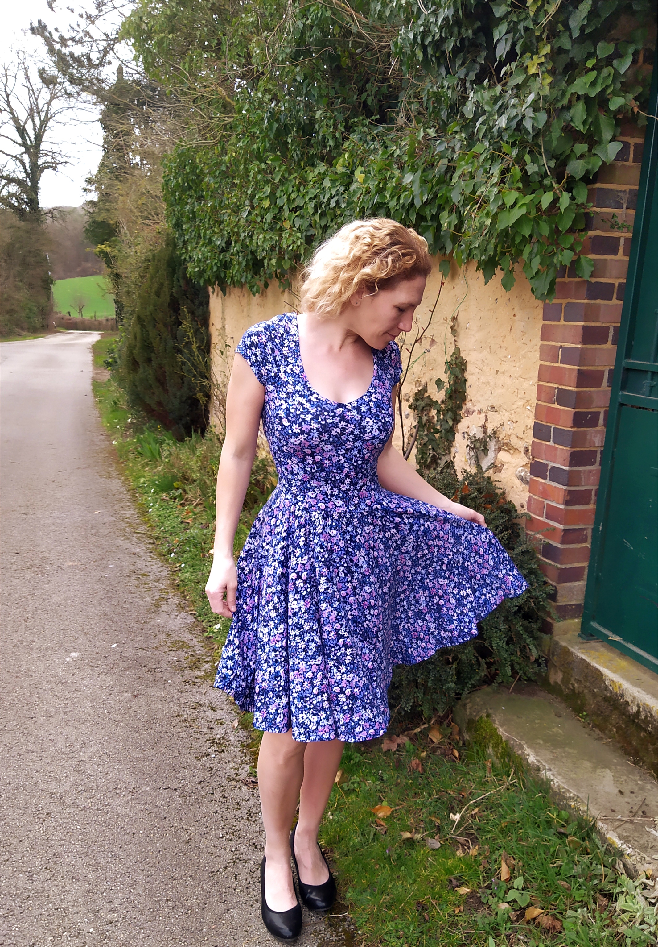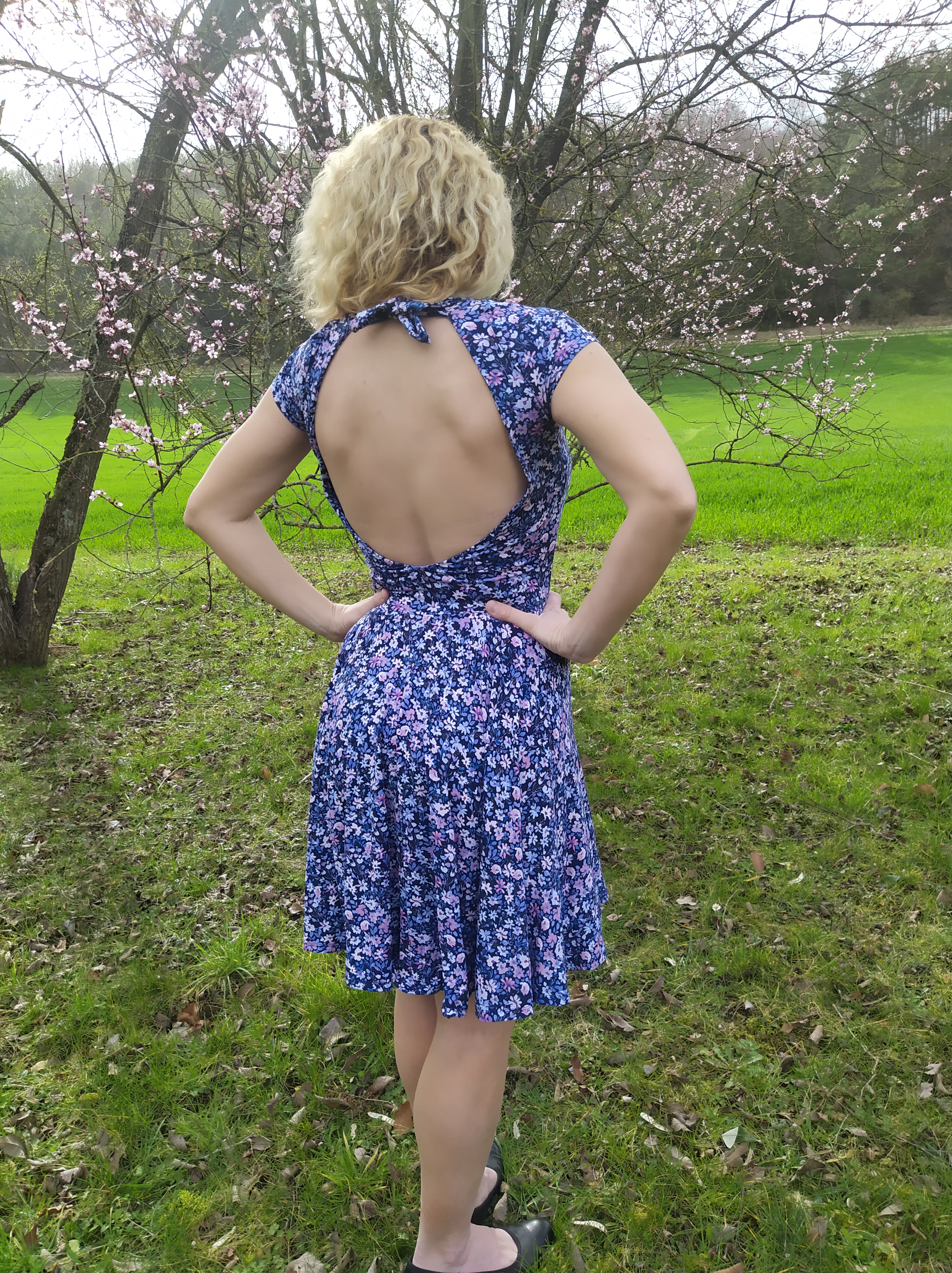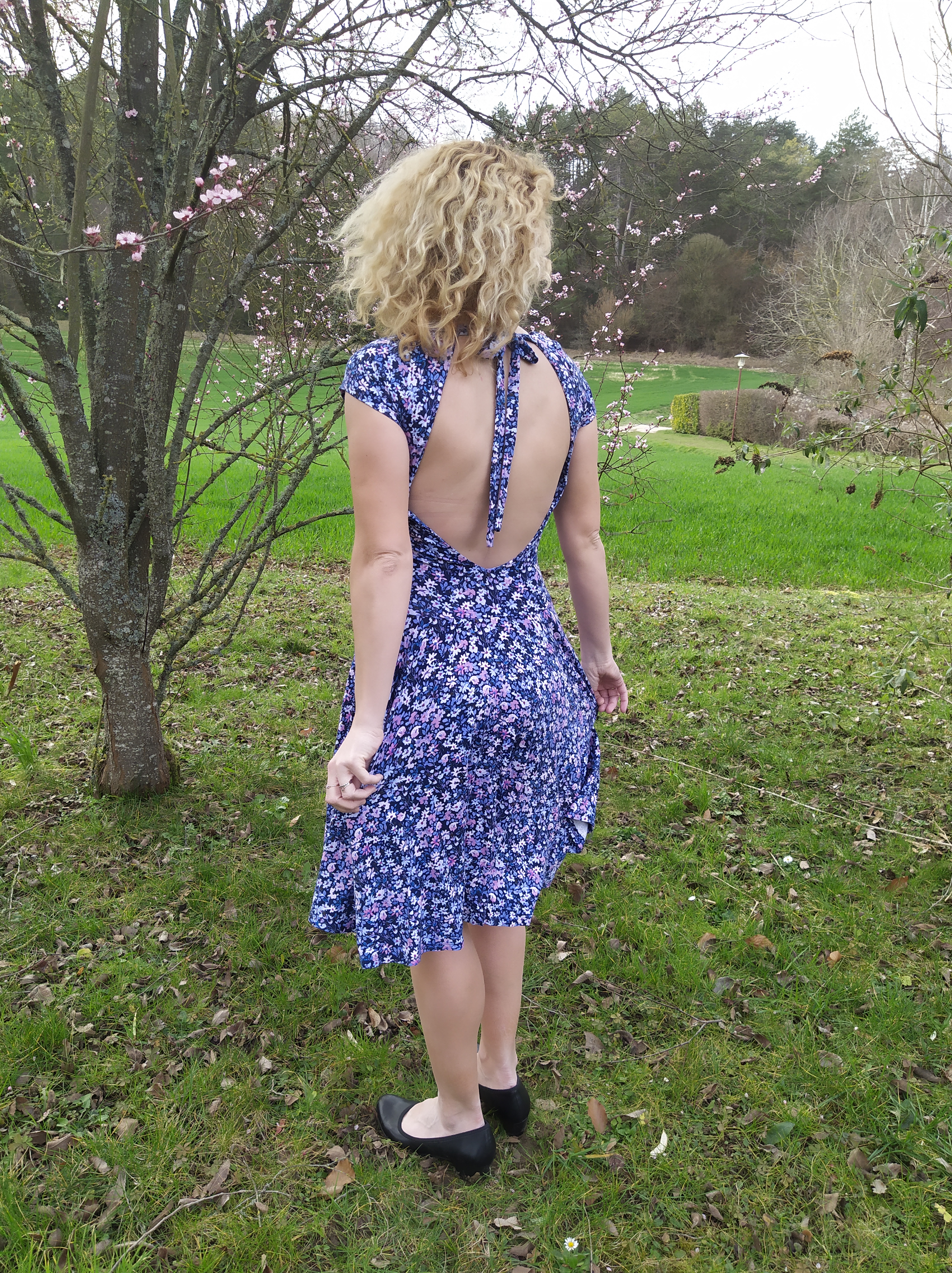 La partie buste est doublée entièrement et j’ai ajouté un noeud en haut du dos. La robe se monte vraiment très vite . Les ourlets des manches et de la jupe ont été réalisés à la recouvreuse 🙂