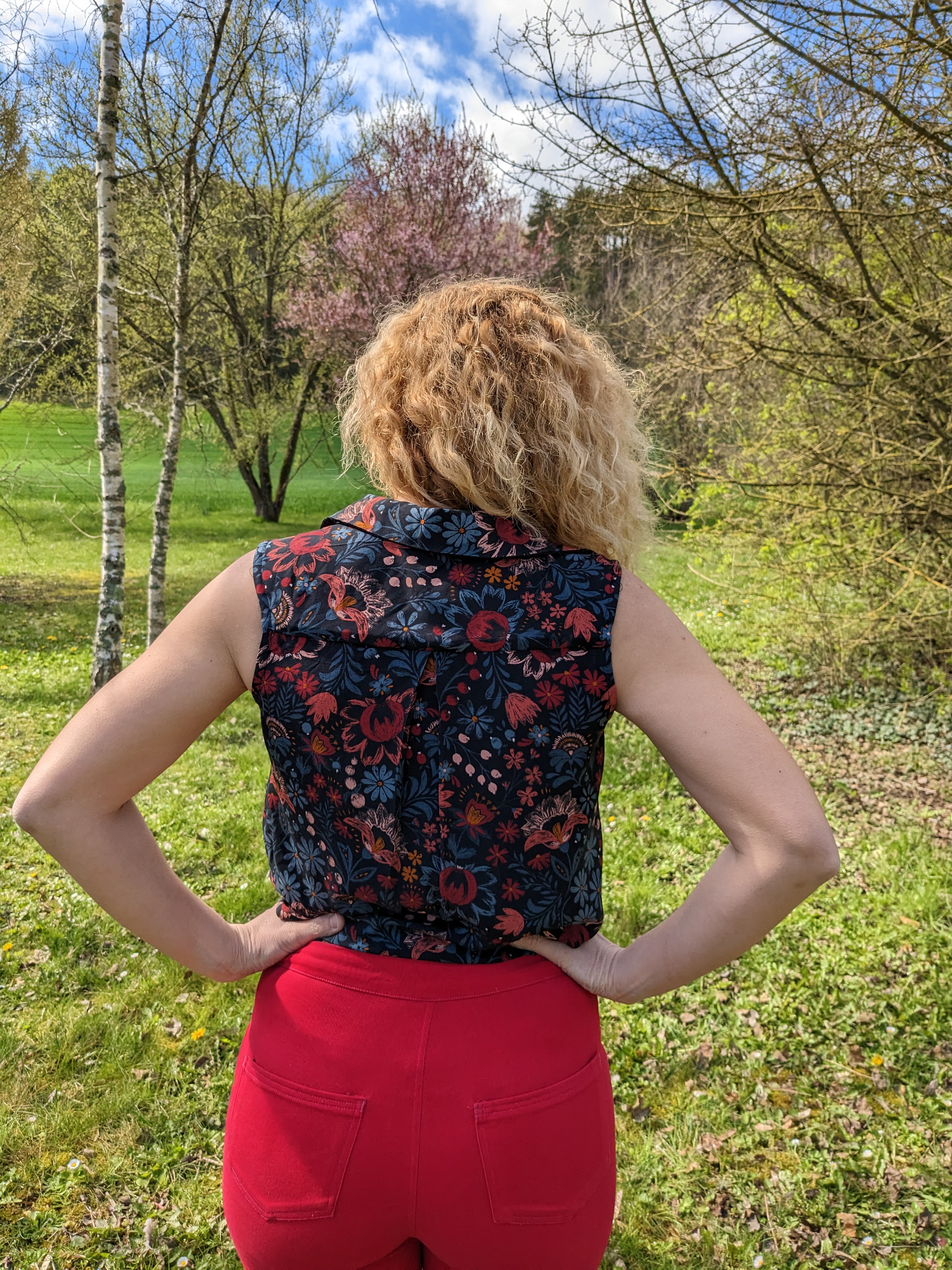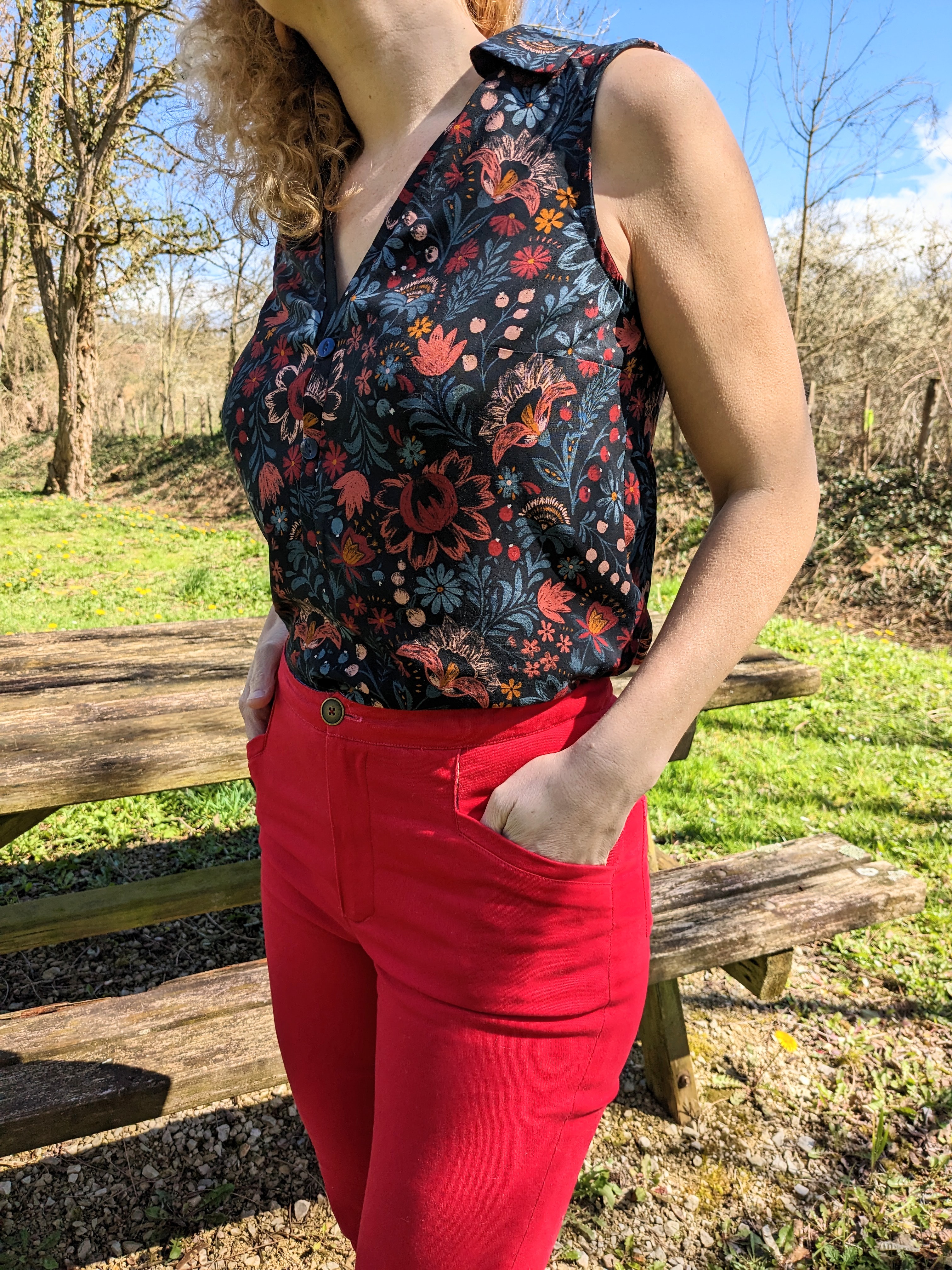 La patron Charlie se décline en blouse ou robe ( ma prochaine version :D) avec moultes options de manches , cols et volants et se distingue par une jolie patte de boutonnage l’avant . La technique m’a enchantée 🙂 . Les explications de son montage sont claires, aucune crainte à avoir ! . J’ai choisi l’option sans manches avec col de chemise