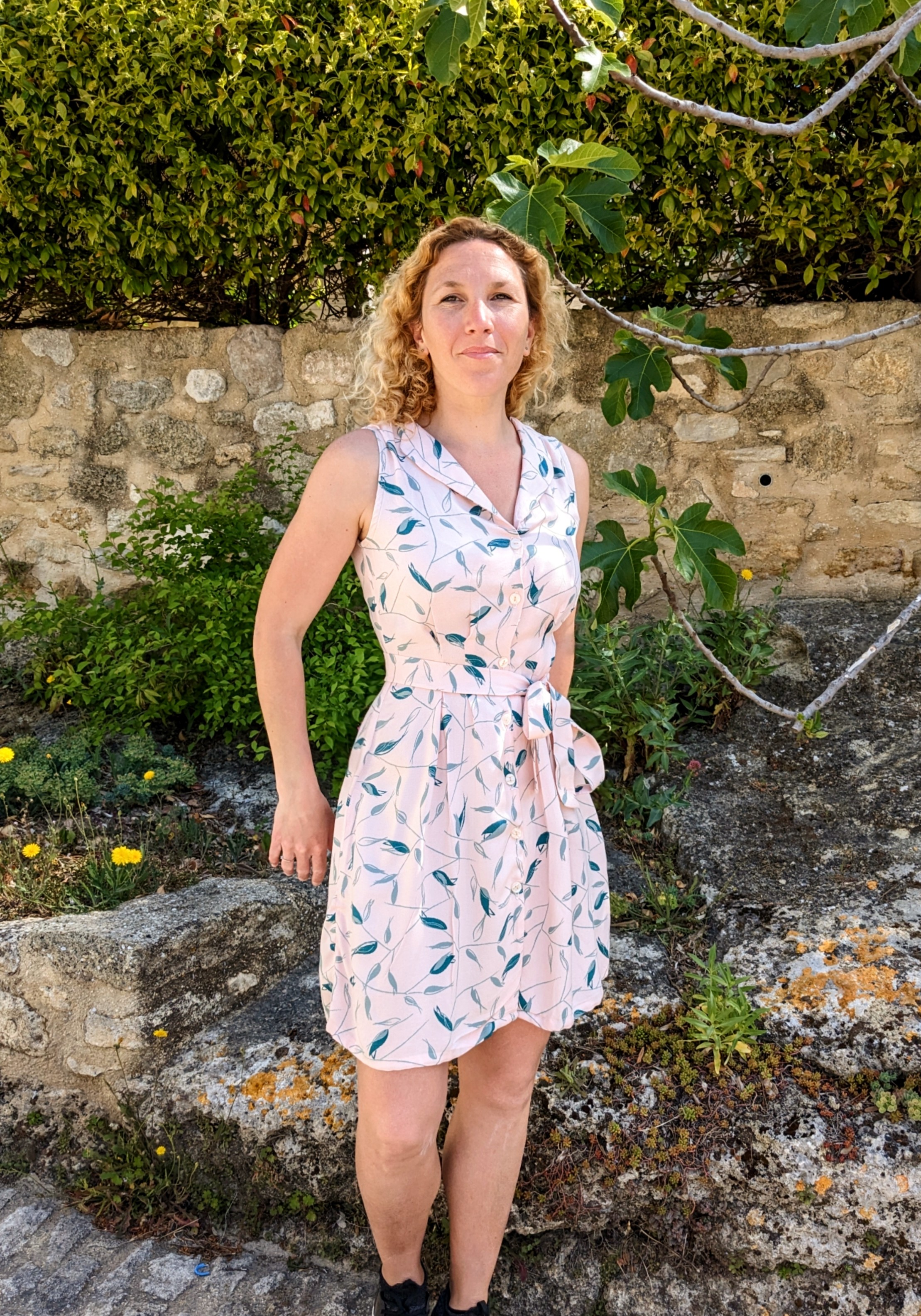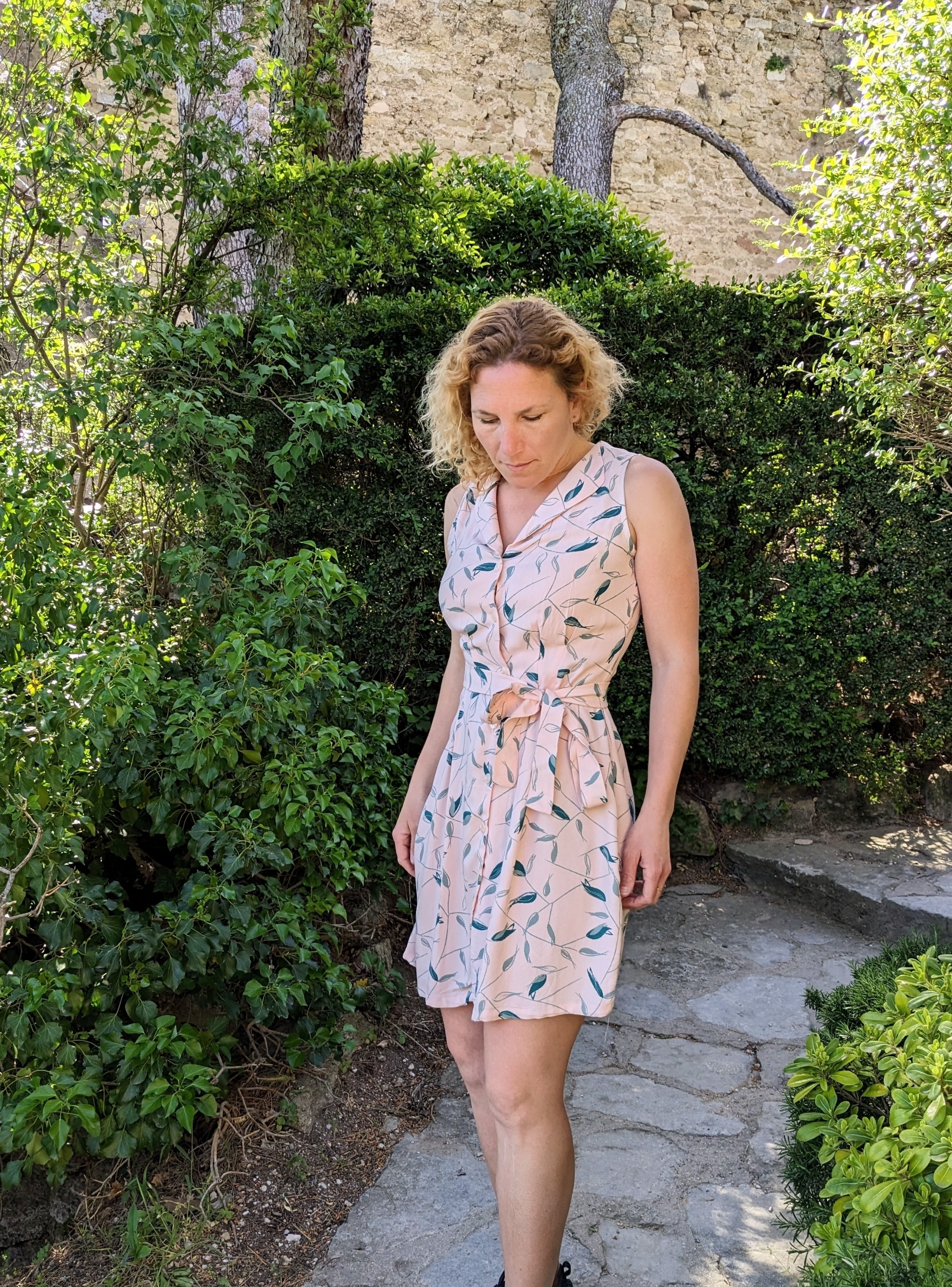 Gigi est donc une robe chemise avec plusieurs options de col et deux longueurs ( longue ou courte comme la mienne ) . Elle est ajustée grâce à un jeu de plis devant et au dos et resserrée à la taille par une ceinture à nouer. Je trouve la robe à la fois élégante et pratique au quotidien . Son montage se révèle hyper rapide et vraiment accessible. J’ai suivi la taille 34 et ai assez d’ampleur à la taille pour une petite pêche melba :p ( Vous ai-je raconté qu’il s’agit du premier dessert dont mon père m’a confié la charge enfant ? 😉