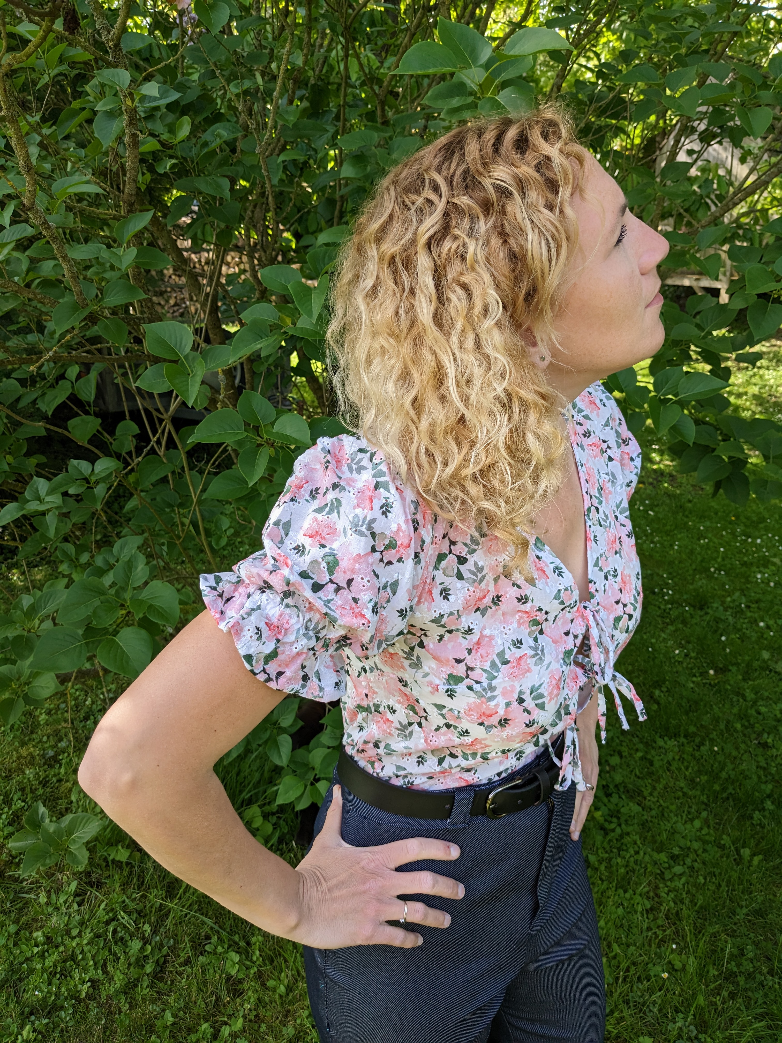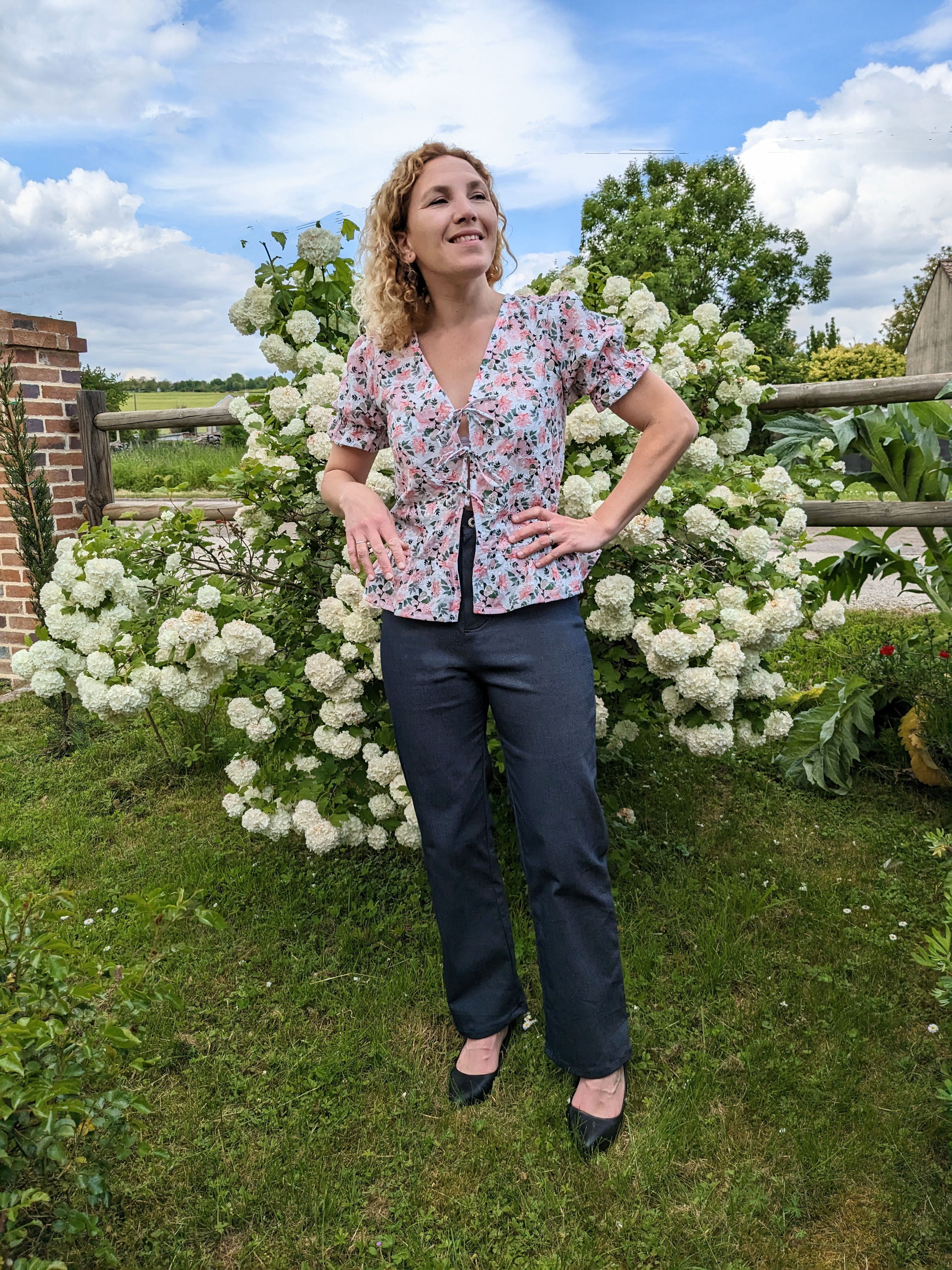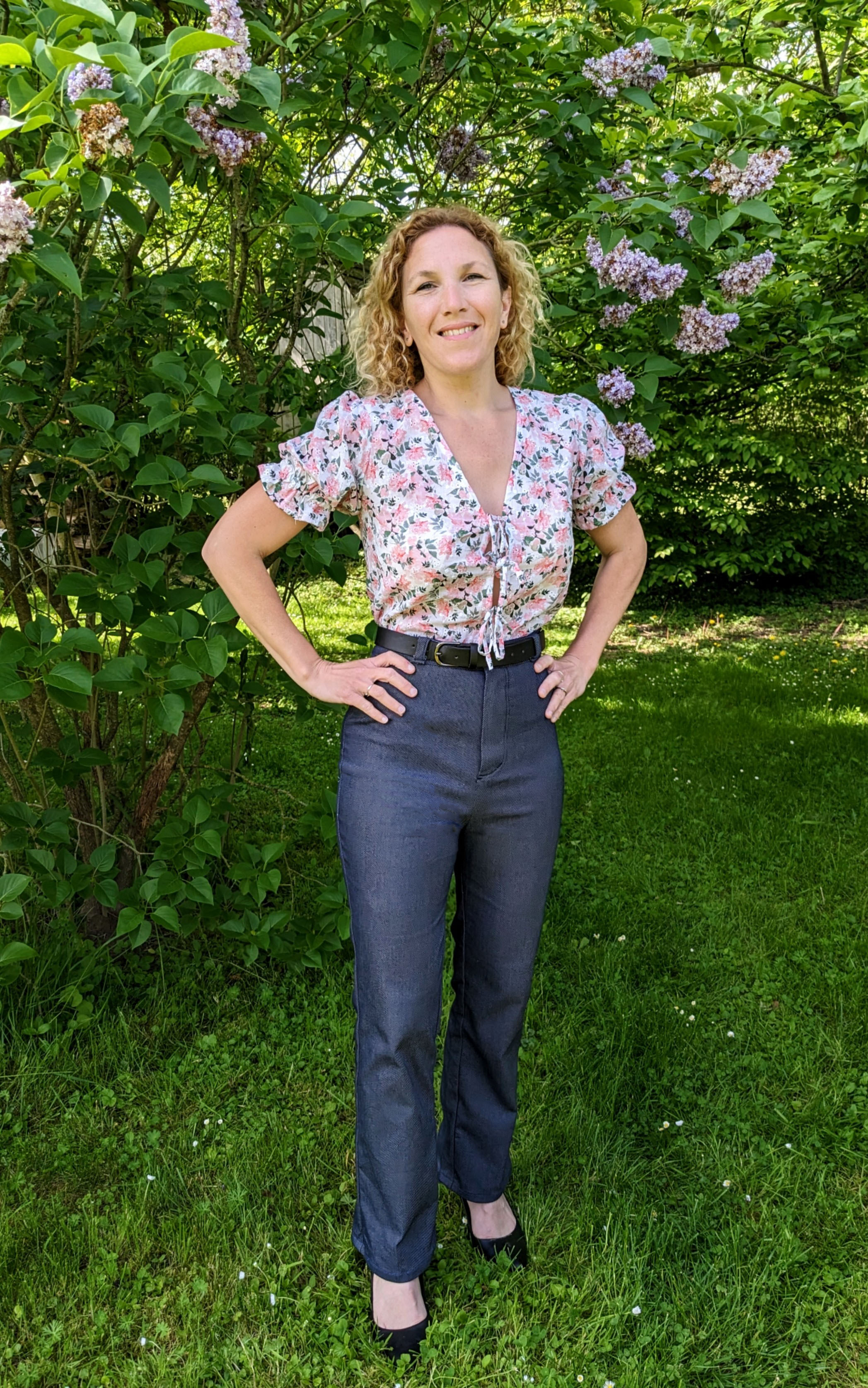 Avec le pantalon , j’ai pensé à la blouse Rose dont j’avais acheté le patron sur Makerist ( ainsi que plusieurs patrons de la créatrice d’ Atelier Bernie : Frida , Angela notamment … ). Il s’agit pour moi d’un coup de coeur pour le romantisme du modèle. J’ai choisi l’option manches courtes et le volant long même si ici je porte à l’intérieur du pantalon