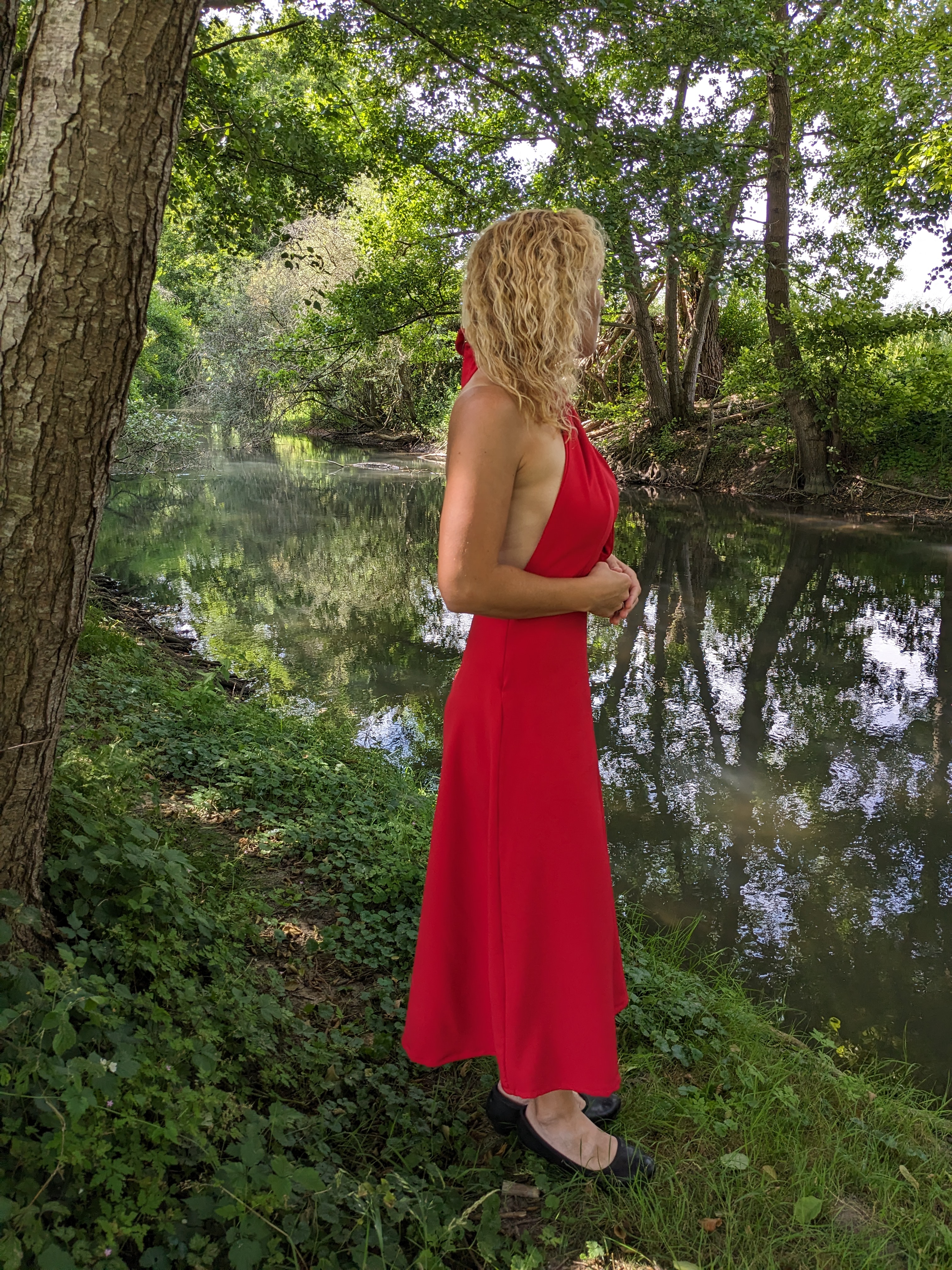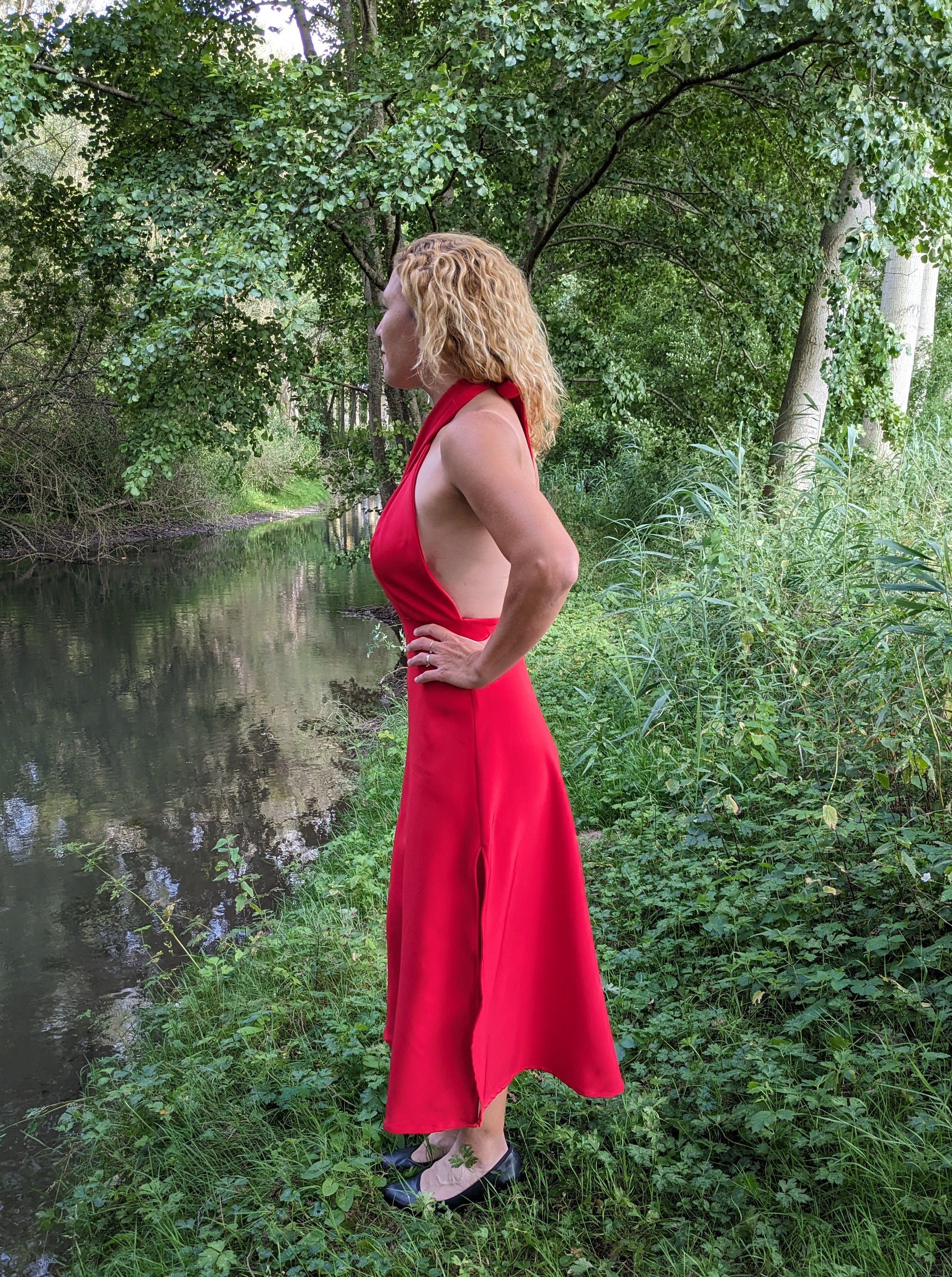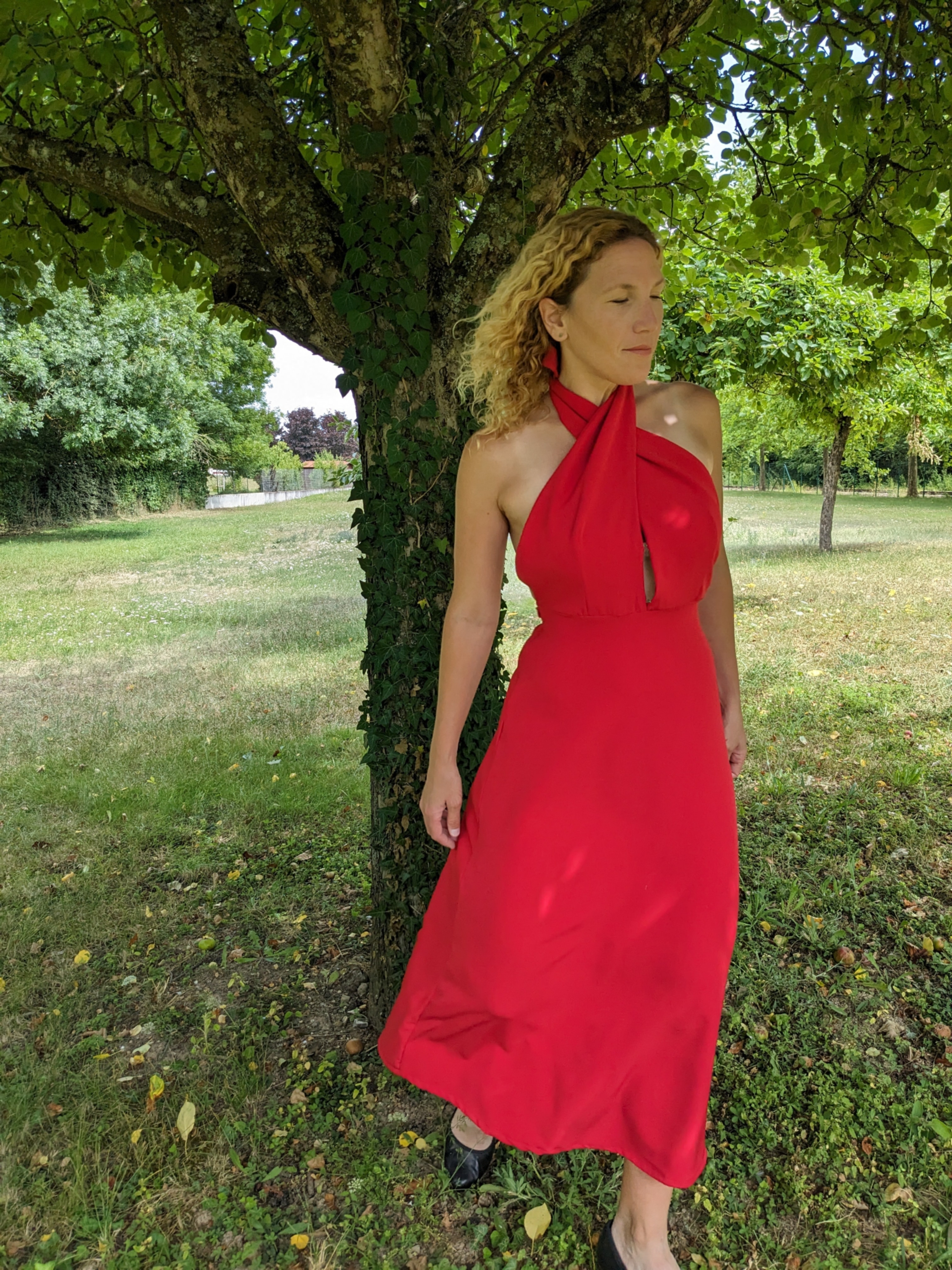 Ici la robe comporte le haut foulard sans la pièce du dos ( j’ai retracé la découpe devant pour cacher la poitrine tout en portant mon truc en silicone collant mais pratique de chez H&M et crée une parementure pour le dos de la jupe ) . La jupe elle-même est donc 1/ 4 de cercle mais avec fente sur le côté ; il existe par ailleurs un bas jupe fendue avec une fente plus orientée à l’avant ; je ne possède pas (encore) ce patron.