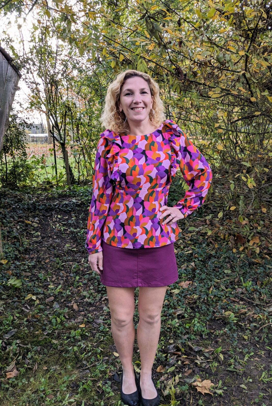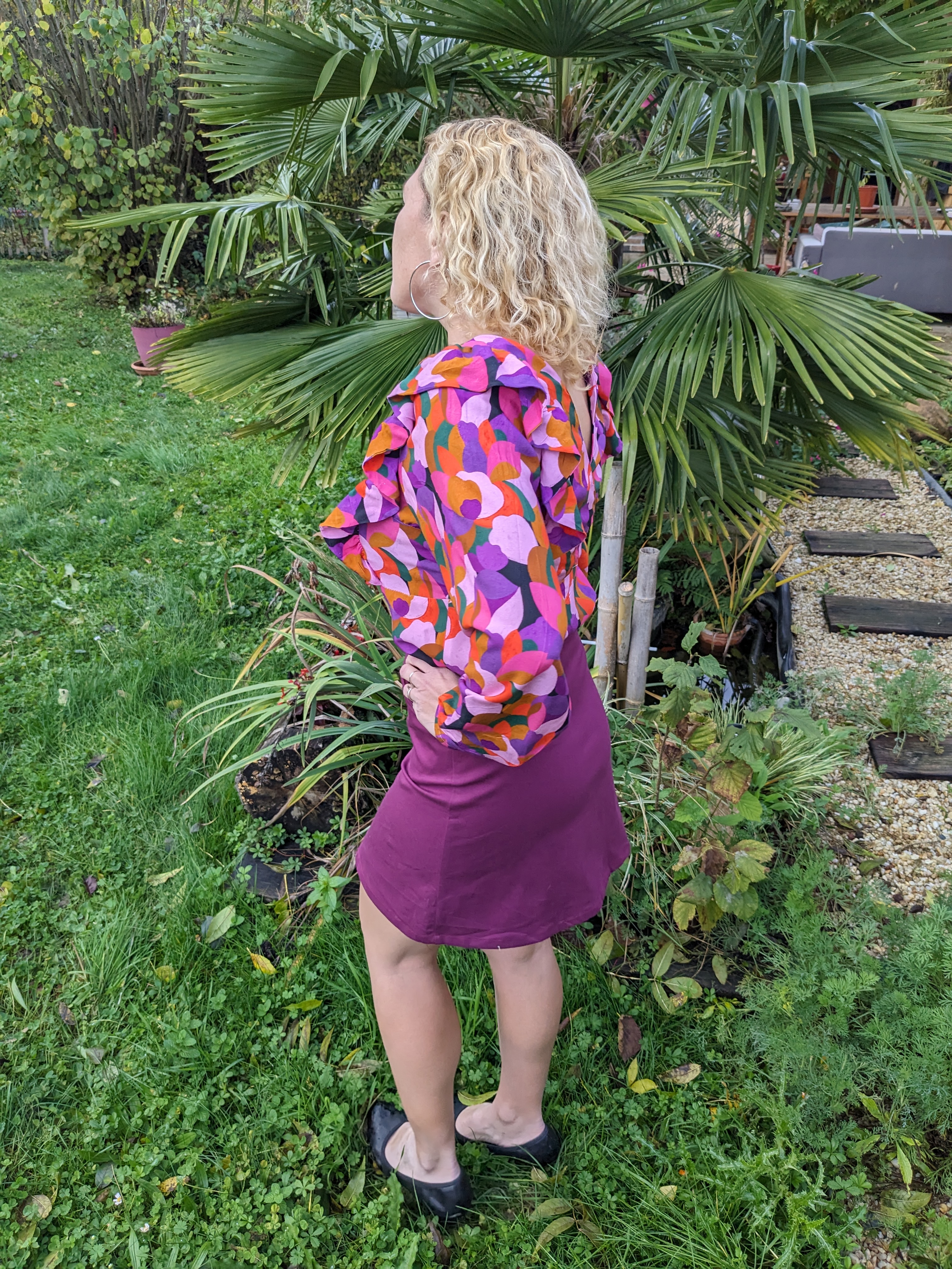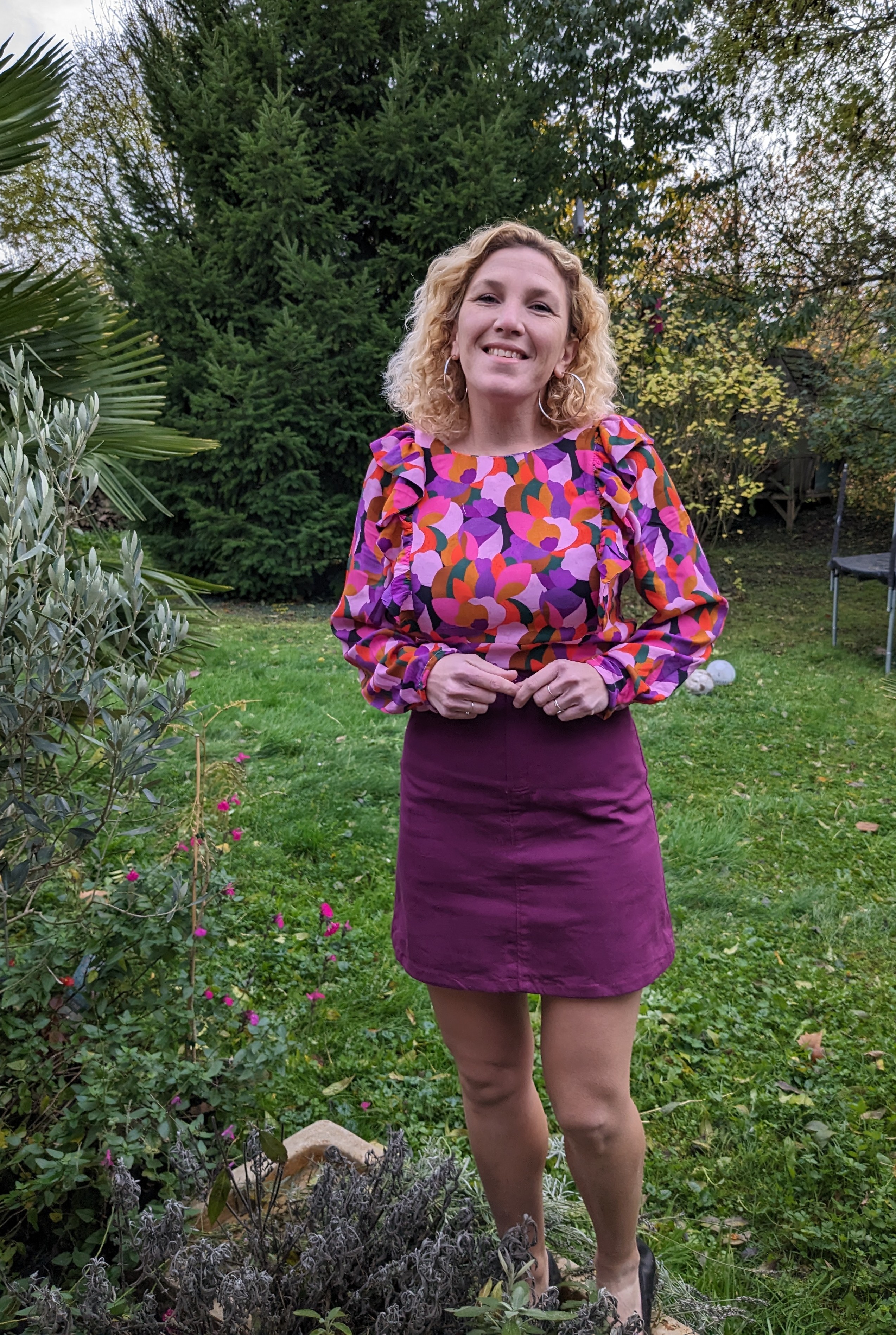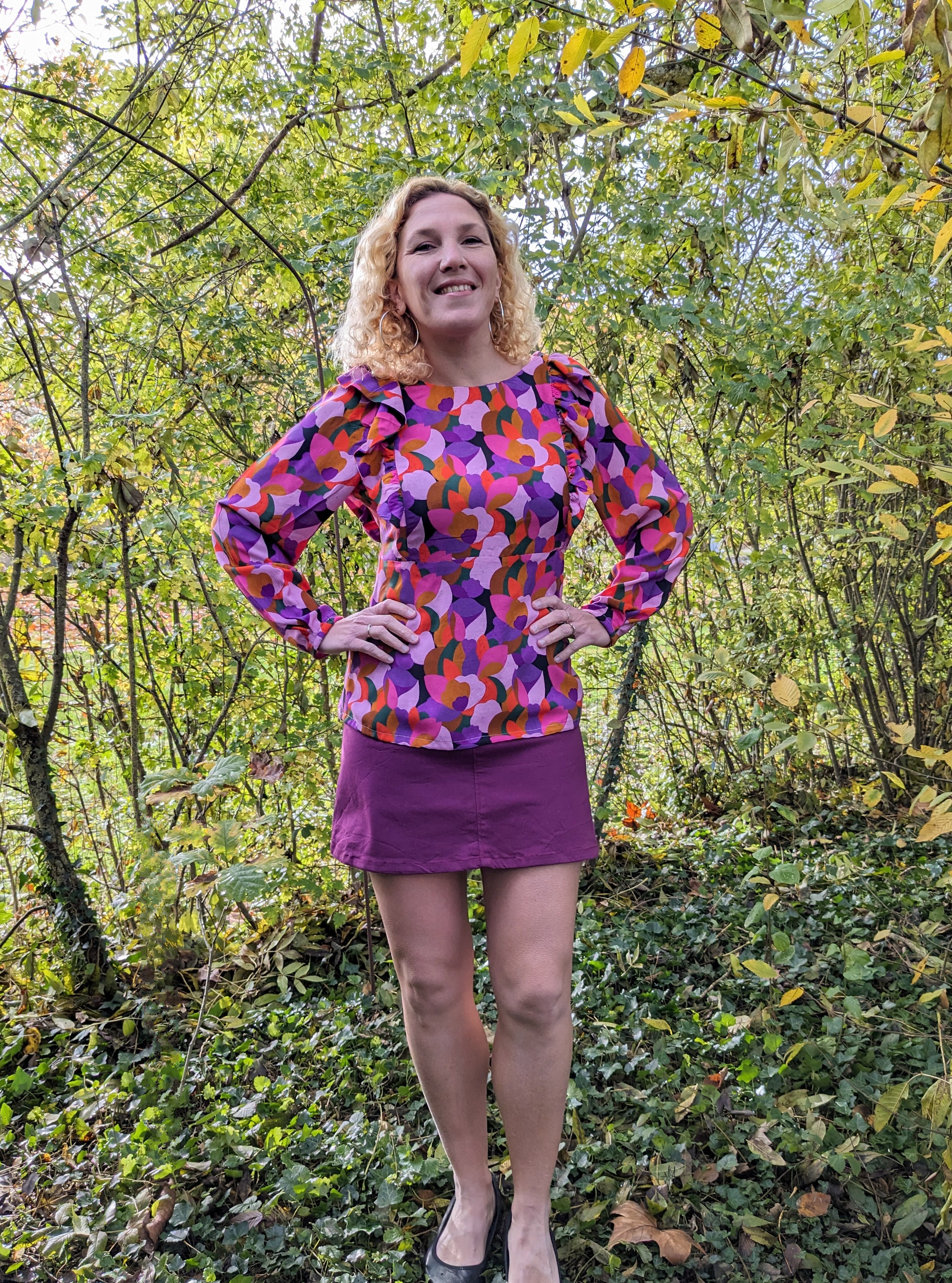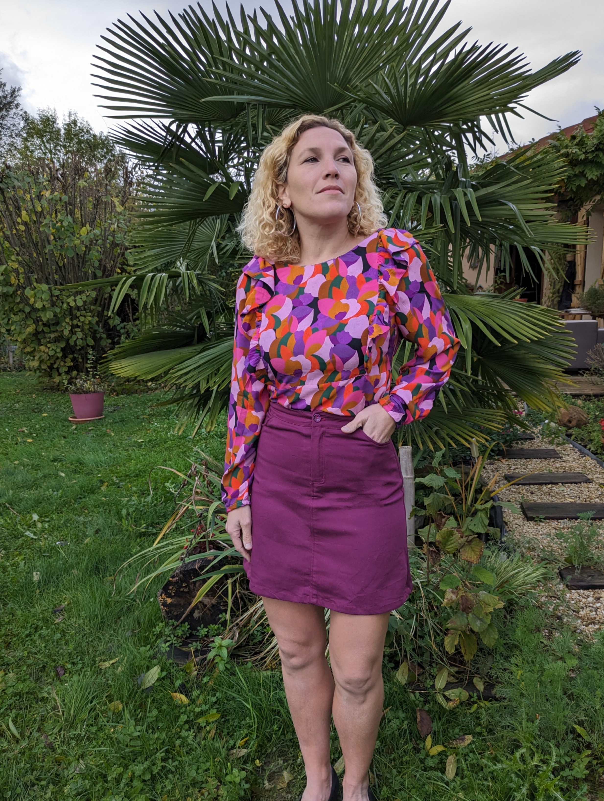 En bas je porte la jupe Groovy de Lise Tailor , méga coup de foudre …j’ai acheté la pochette et j’en coudrai plusieurs . Me voici dans avec les poches classiques et sans passants vu que j’ai oublié de les coudre en bon boulet que je suis