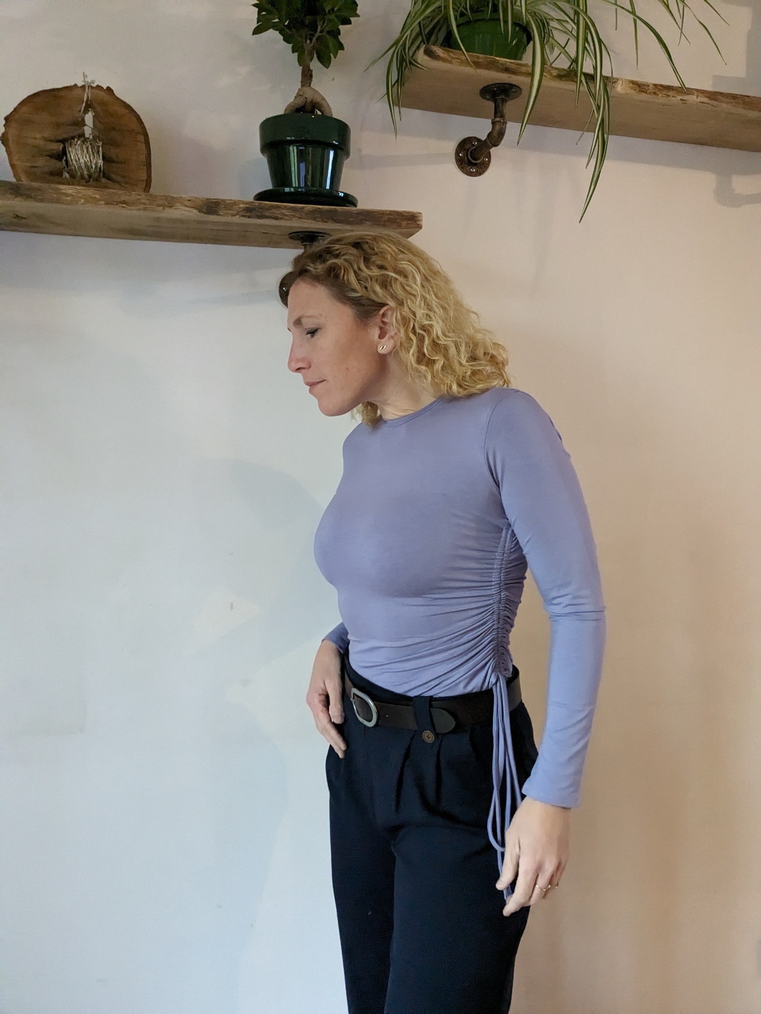 Je commence par le top Coatl : il s’agit soit d’un top soit d’une robe sexy mais confortable avec une coulisse sur le côté qui apporte beaucoup d’originalité ! Il se coud impérativement dans un tissu maille et de préférence de bonne qualité ! Julia traduit ses patrons en 4 langues dont le français . Elle a aussi préparé un tuto Youtube . Elle est bluffante !