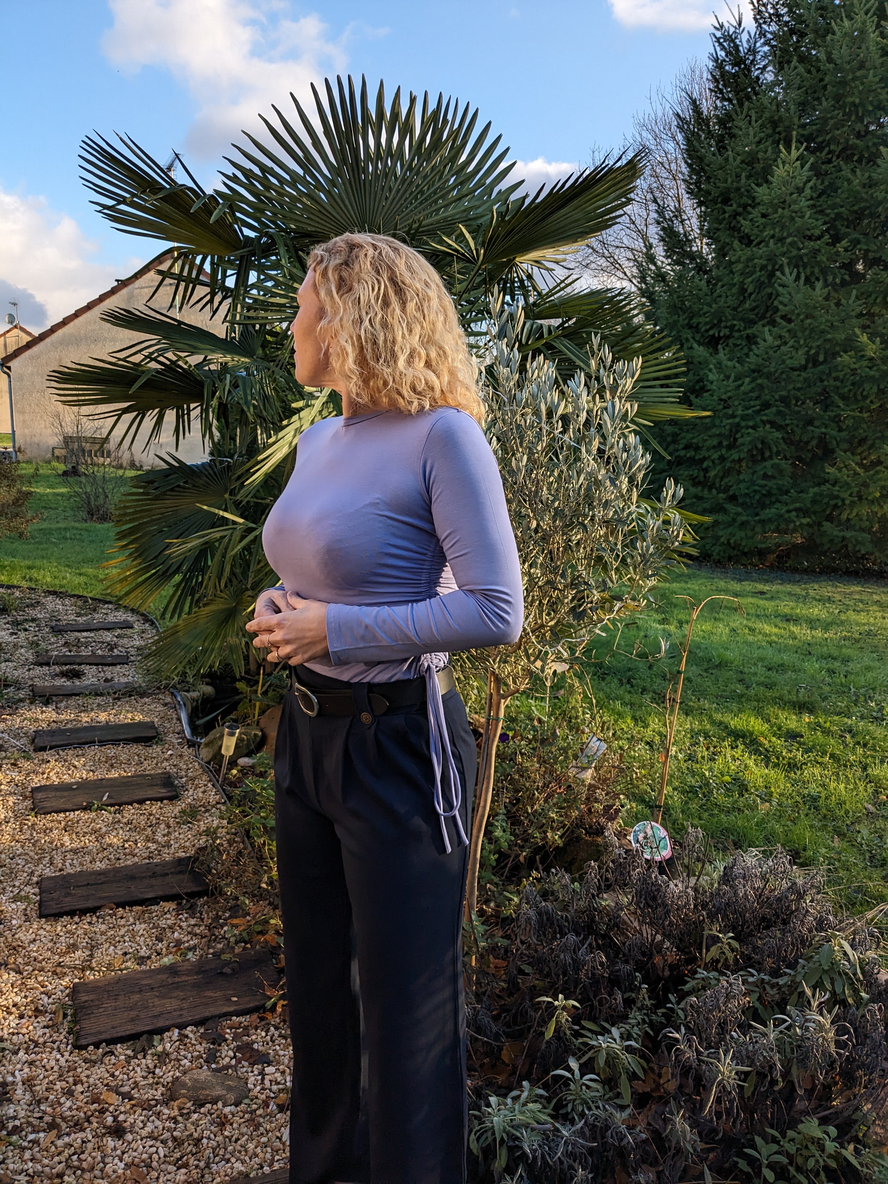 Cette version est coupée dans un jersey Lise Tailor. J’aime beaucoup la couleur douce . Je suis navrée pour les photos mais il pleut non stop chez moi depuis un moment. J’ai cousu la taille B. Le montage est hyper rapide et efficace . Vous pouvez tout monter à la machine à coudre même si j’ai utilisé la surjeteuse et la recouvreuse.