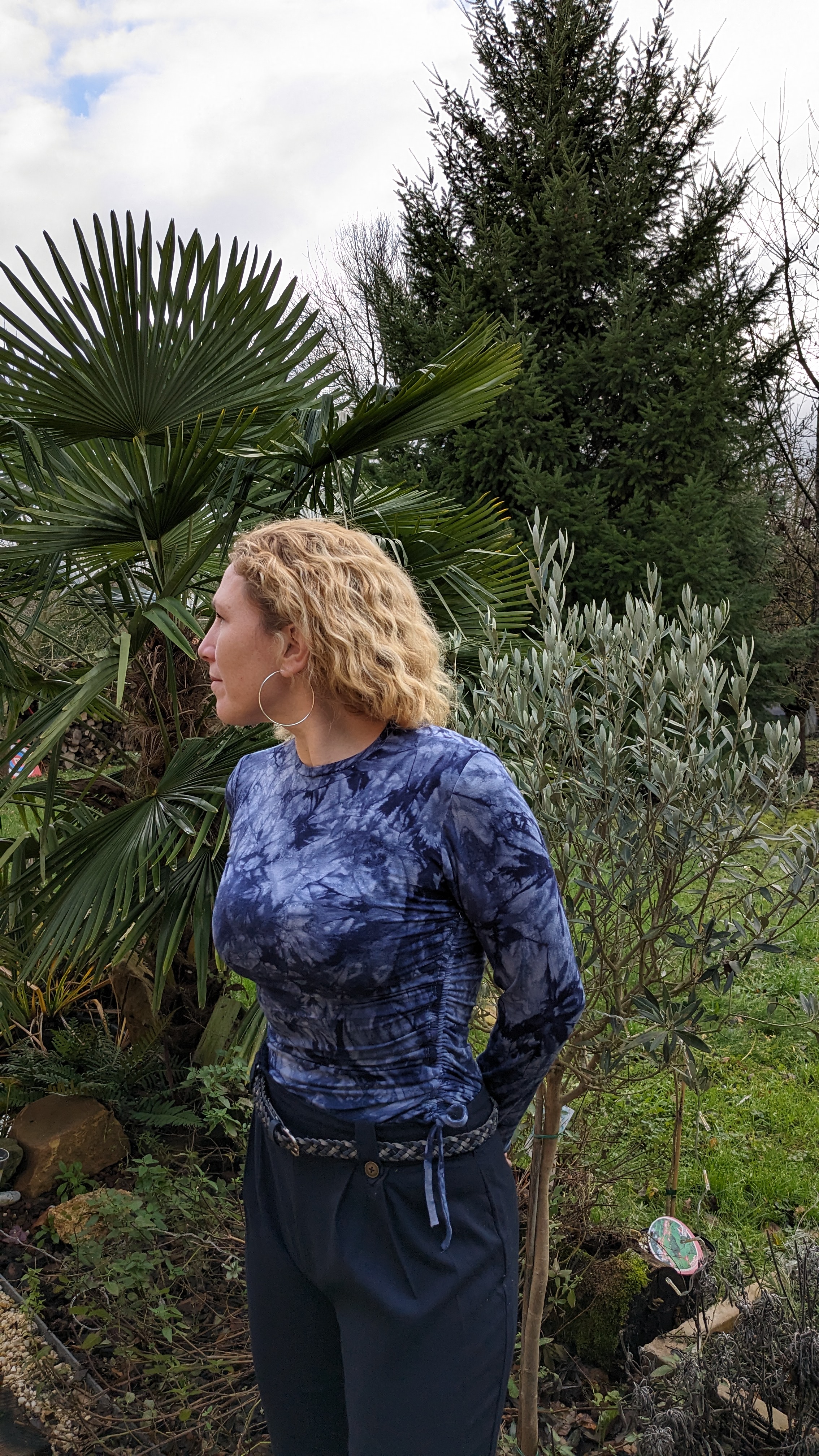 Du coup voici une deuxième version dans une chute de tissu tie and dye de chez tissus.net Attention , la qualité est moins bonne et j’ignore si ce haut sera durable.