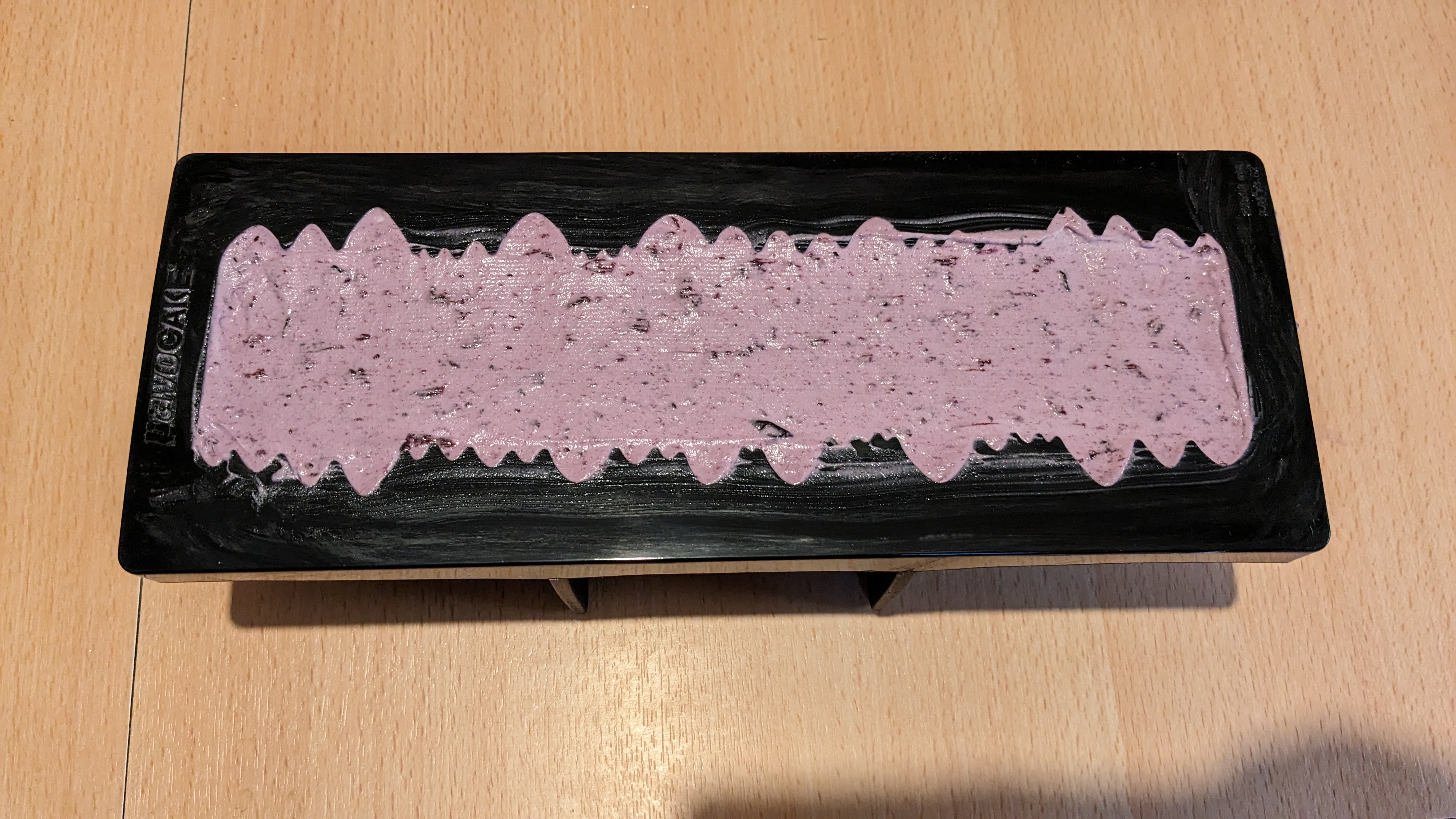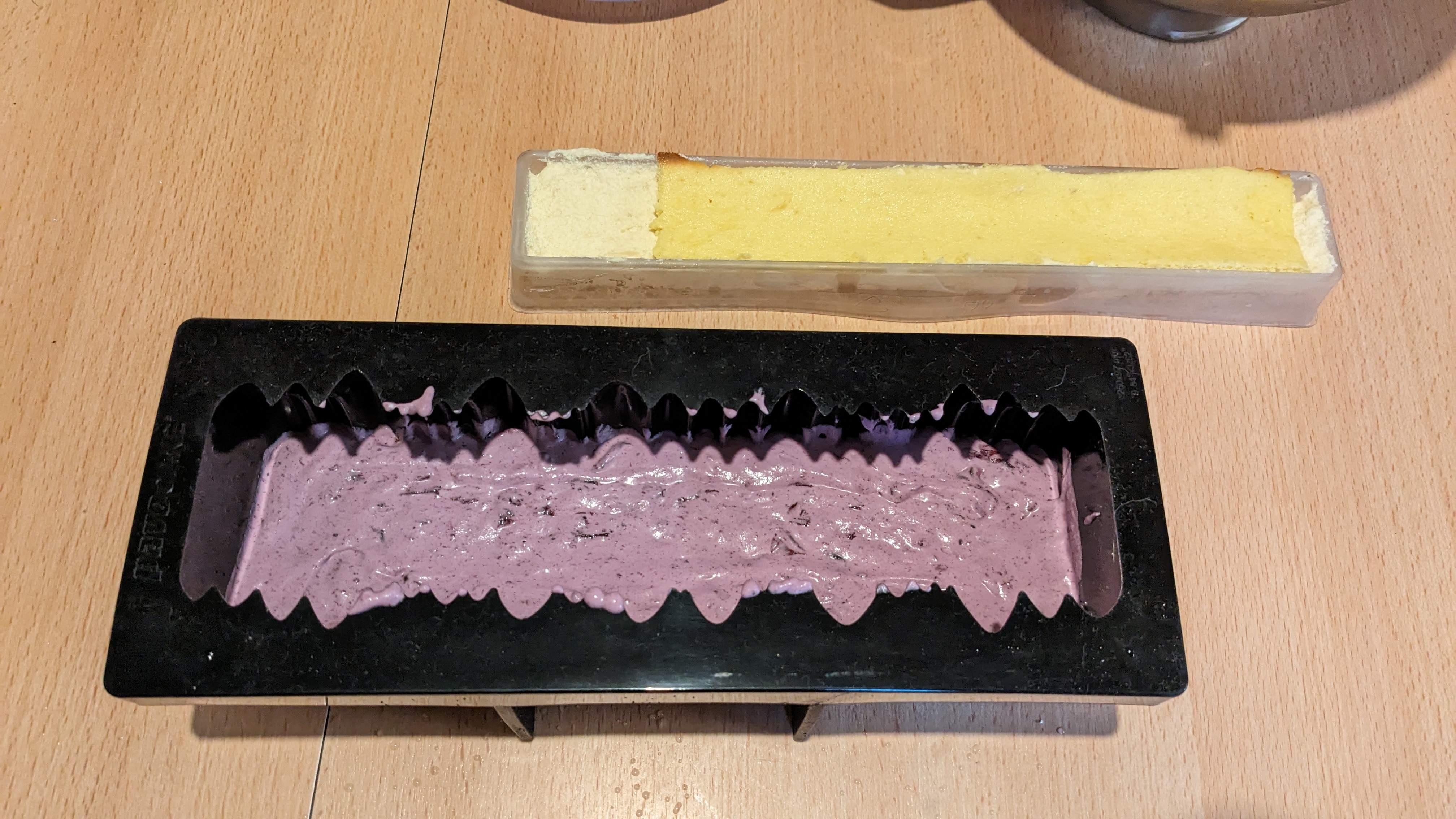 4 / Le montage : Versez une première partie de la mousse puis démoulez l’insert , recoupez si besoin les entames comme moi et disposez bien au centre . Recouvrez du reste de crème et mettez au congélateur une nuit complète .