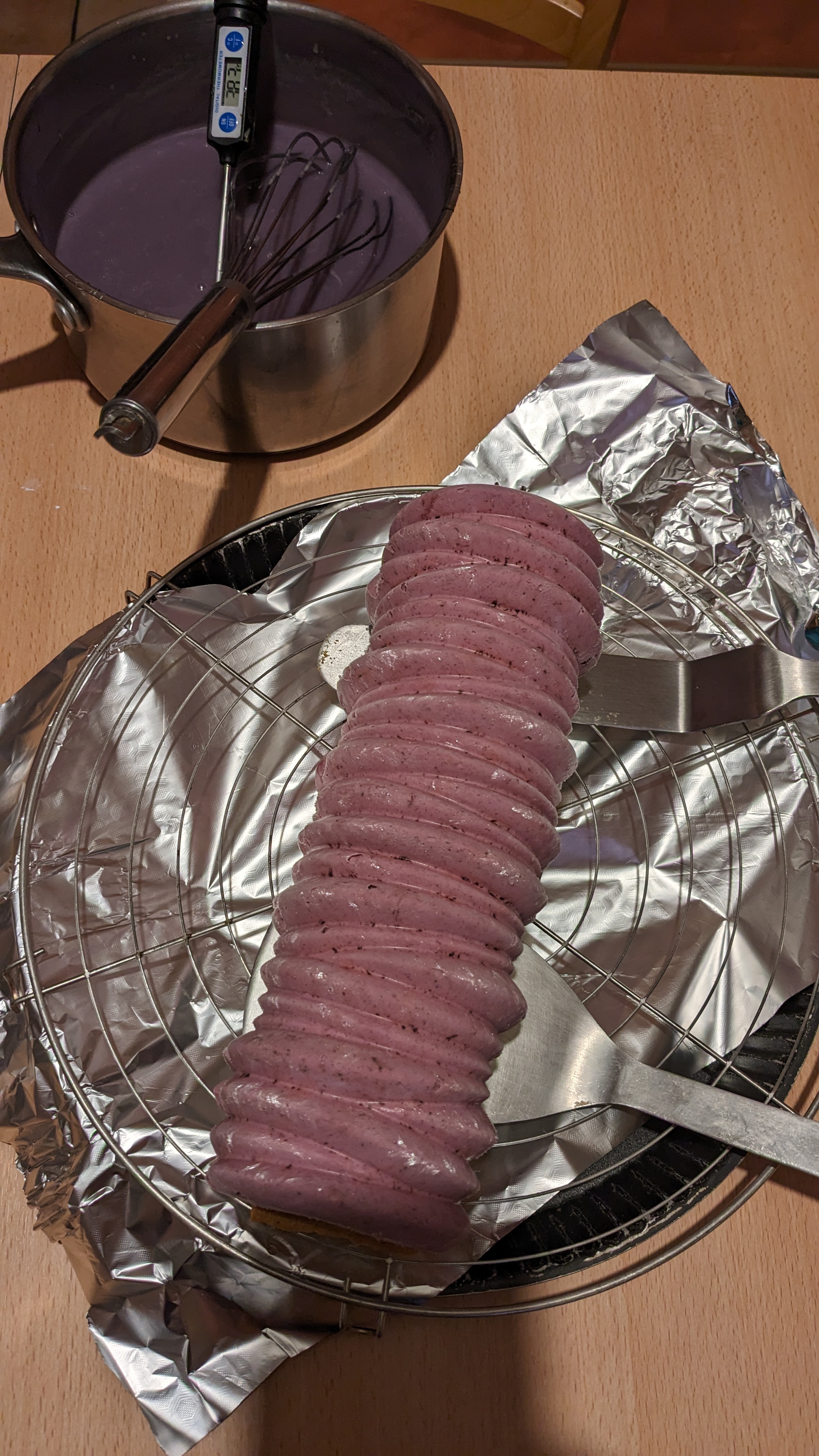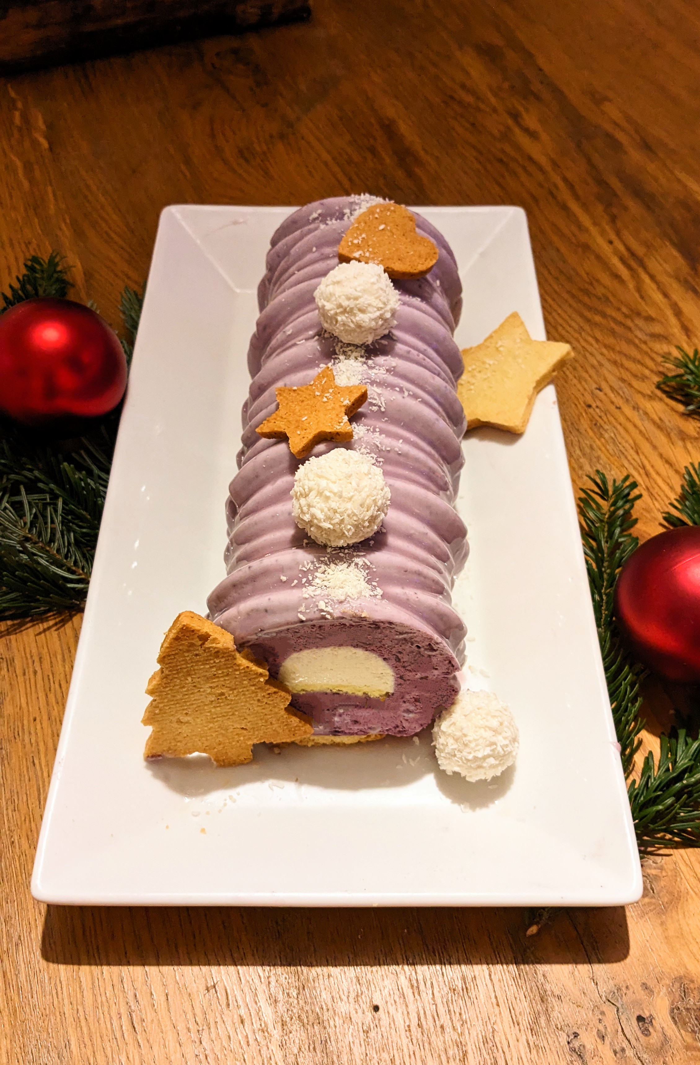 La première partie de la recette est commune au sapin aux deux chocolats posté précédemment car il fallait que j’optimise le temps passé en cuisine en jonglant avec le reste hihi. Nous avons donc : un insert de mousse au chocolat blanc / vanille sur un petit lit de génoise. Ensuite une belle mousse de cassis avec des morceaux de fruits entiers à la demande de ma fratrie et un glaçage miroir hybride pour cause de pénurie de lait concentré sucré au moment de le réaliser ( fuite du cerveau , excès de confiance ou insouciance de la nana qui n’a pas vérifié ce point essentiel un 24 décembre à 17h et qui n’envisage pas de foncer dans un supermarché ). Le tout repose sur un biscuit à number cake qui a permis aussi de créer des petits décors.